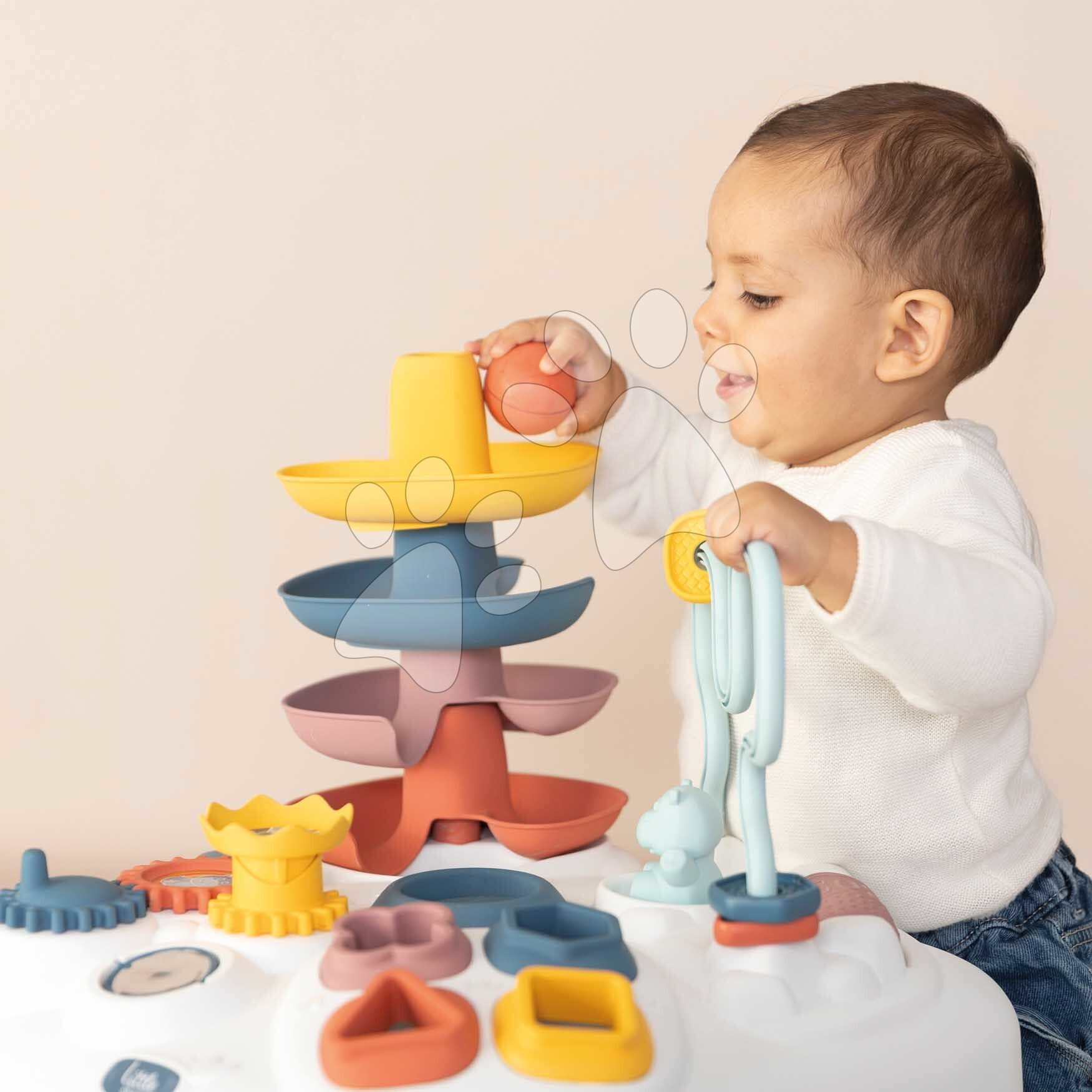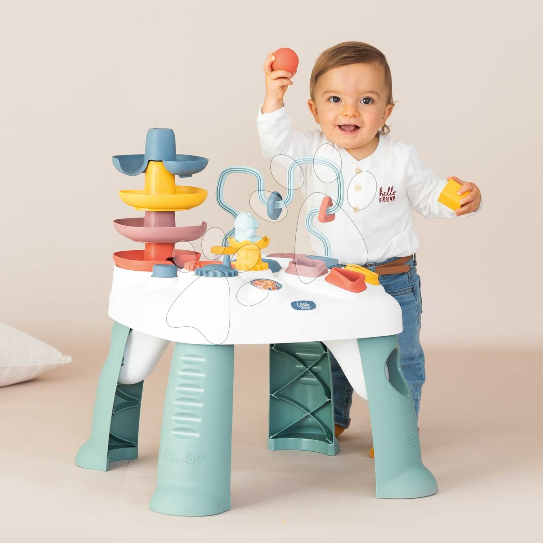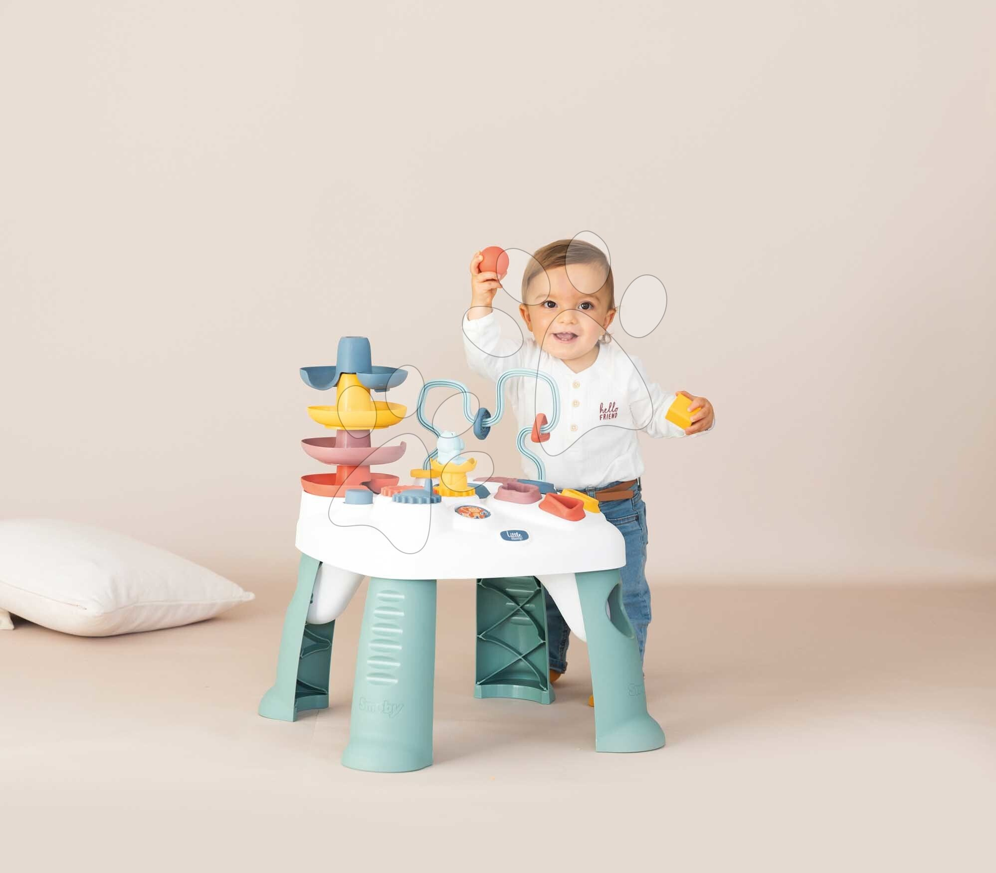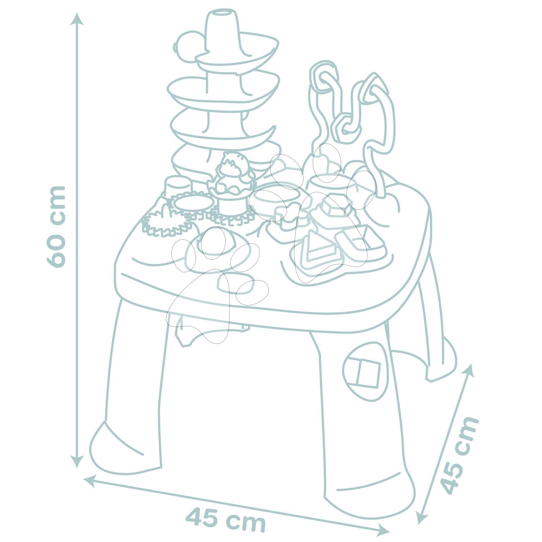 Didaktický stůl Activity Table Little Smoby je multifunkční hračka, která pomůže dětem od 12 měsíců plně rozvíjet jejich kognitivní a motorické schopnosti. Didaktický stolek pro děti stojí na 4 pevných a stabilních nohách, je vyroben z kvalitního plastu, který je sametový na dotek. Chlapci a dívky si procvičí své dovednosti a dovednosti při různých hrách. Těšit se mohou na vystřelovací katapult s míčkem, provlékání kroužků, otočené zrcátko, válec a originální barevný tobogan, po kterém si budou pouštět míček.
