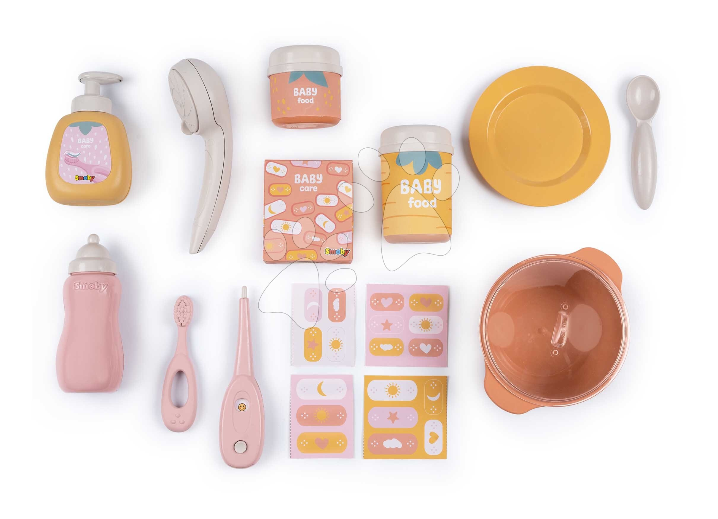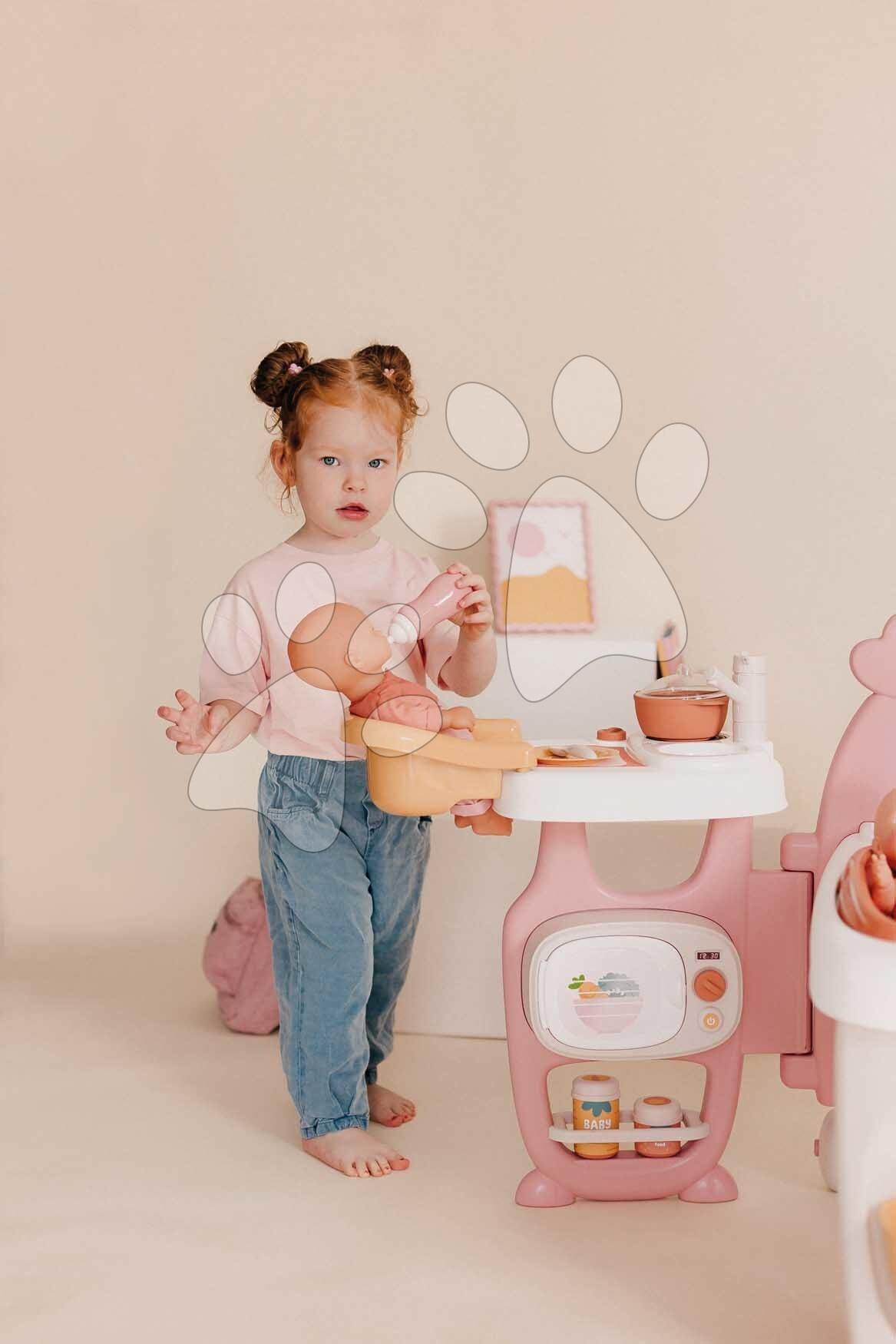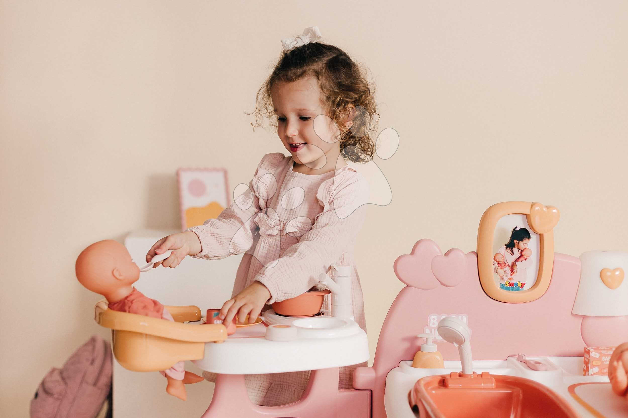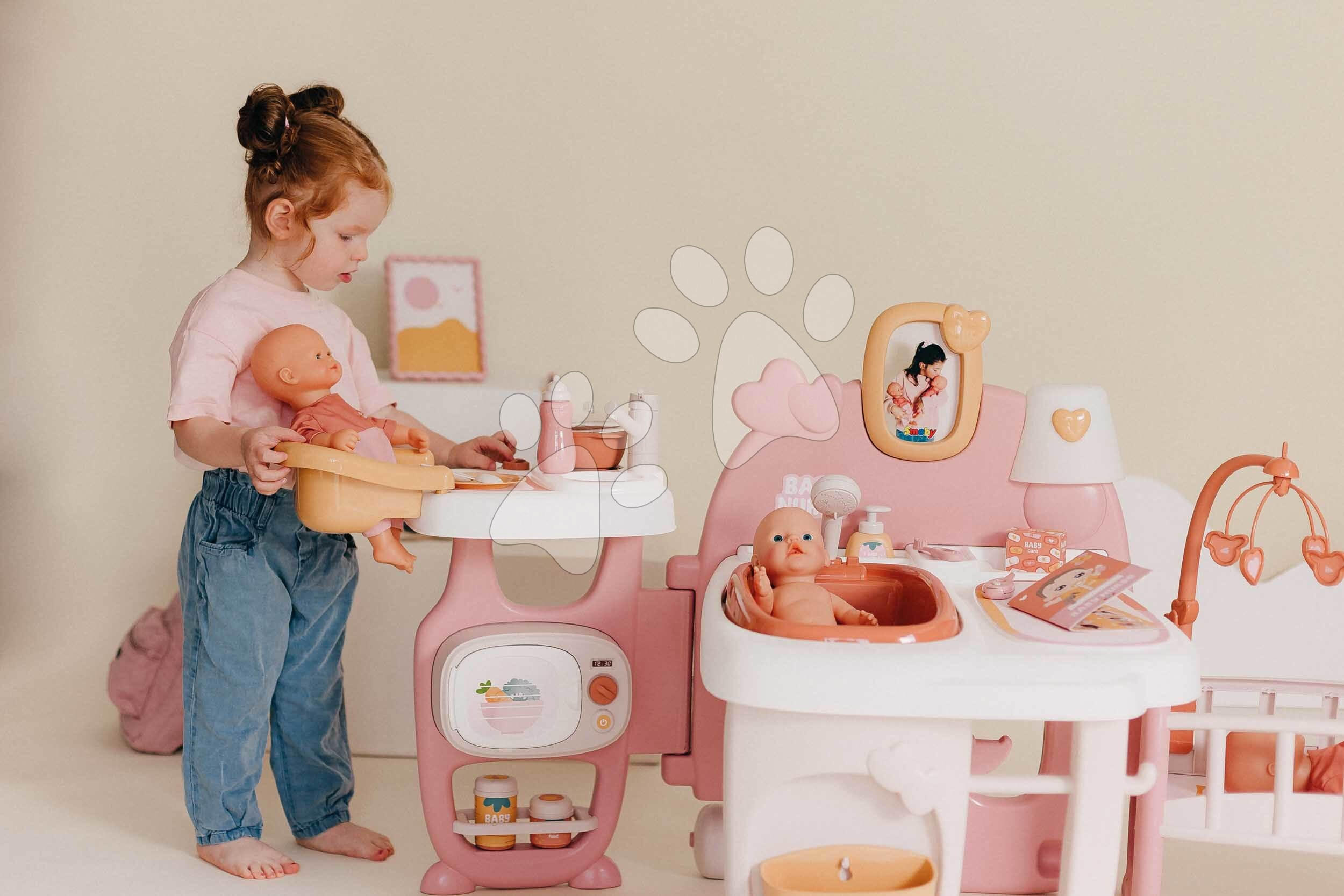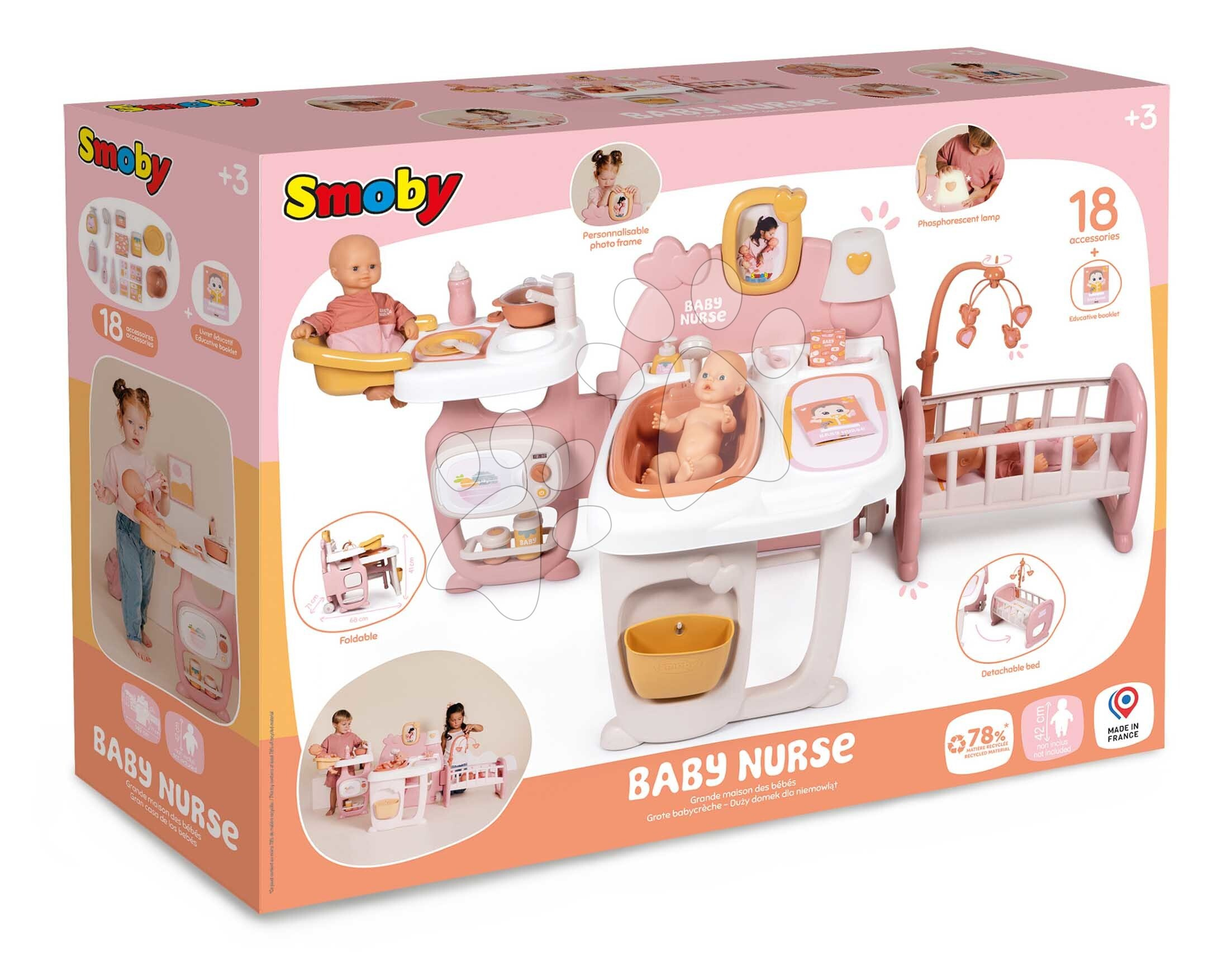 Toto multifunkční pečovatelské centrum nabízí bohatou sadu 18 doplňků, mezi nimiž je hrnec s poklicí, talířek se lžičkou na krmení, láhev, dětská výživa, zubní kartáček, teploměr a různé další doplňky. Dětičky potěší také dostatečný úložný prostor na doplňky. Výhodou centra pro panenky je jeho nenáročnost na prostor. Jednotlivé strany domku se dají snadno složit dohromady, čímž ušetříte místo a díky kolečkům lze kamkoli přesunout. Domek byl vyroben ekologickým způsobem, sestává ze 78 % z recyklovaných materiálů.