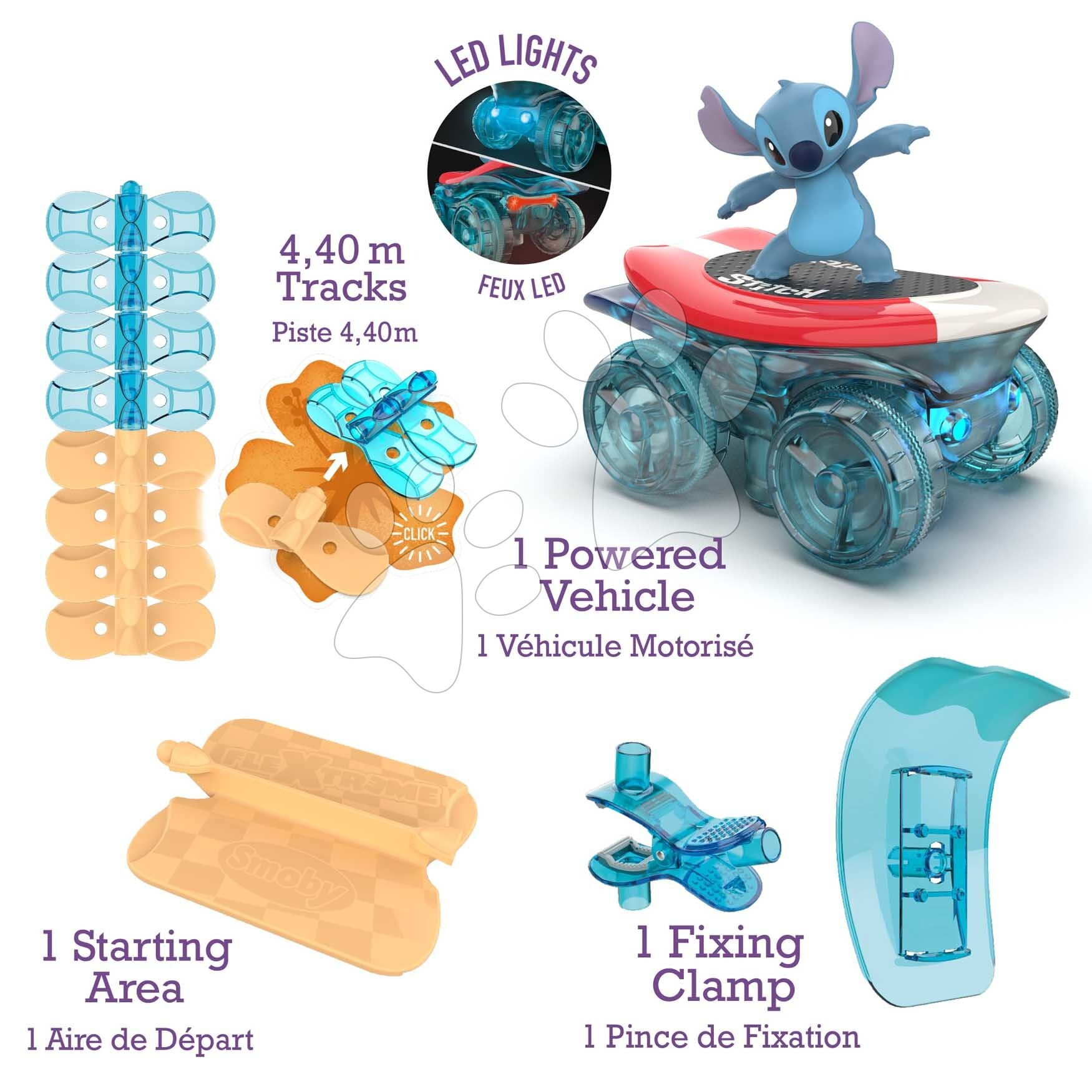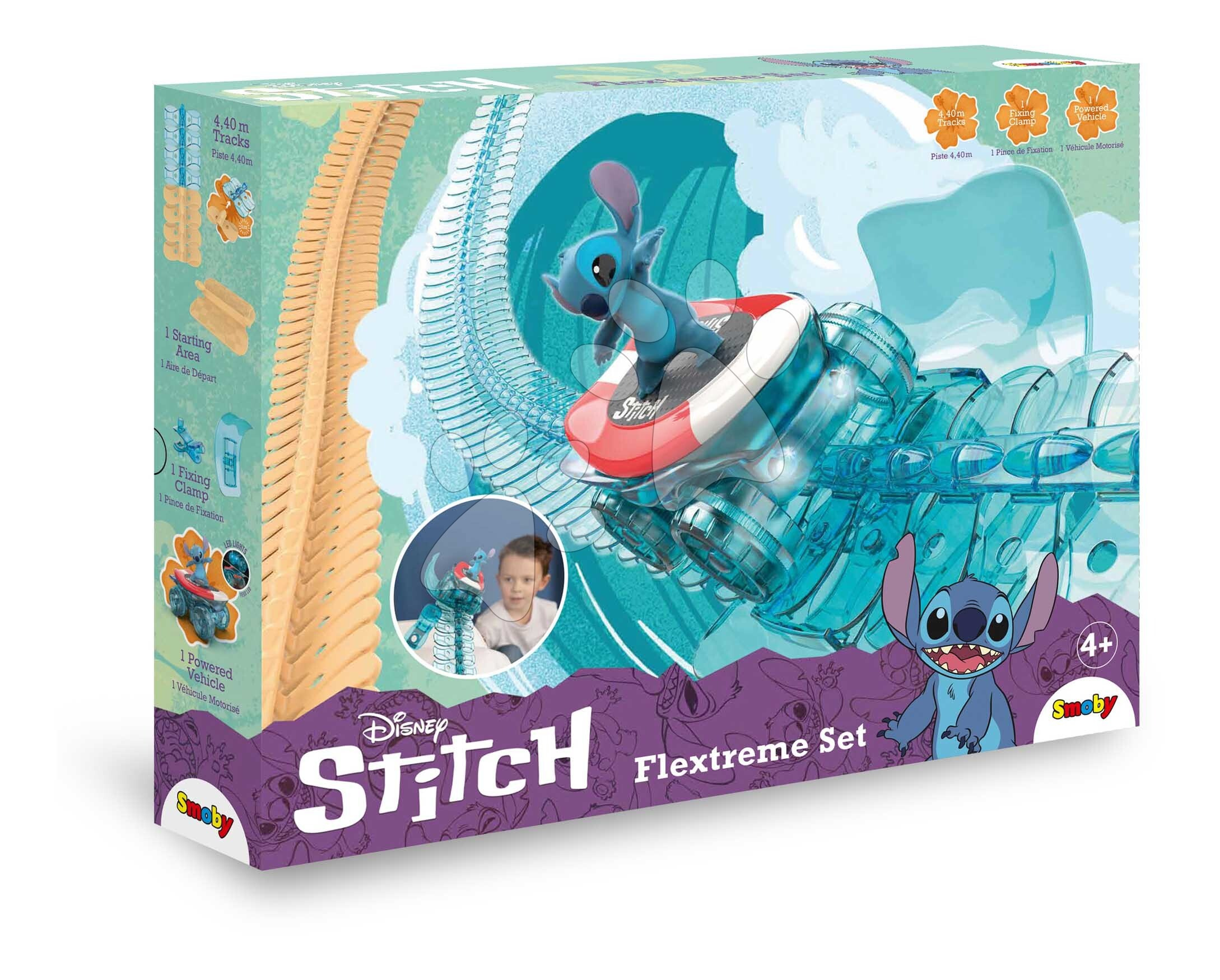 Flexibilní autodráha Stitch Flextreme Stitch z dílny francouzských designérů Smoby umožní dětem objevovat nový herní svět. Chlapci i dívky se již od 4 let mohou těšit na zábavné skládání pružné autodráhy o délce až 440 cm, přičemž mají k dispozici 184 dílů autodráhy, které k sobě jednoduše připojují bez jakéhokoli nářadí. Inovativní koncept pomáhá konstruktérům objevovat stále nové způsoby výstavby dráhy, přičemž ji tvarují do různých tvarů, spirál, využívají překážky v dětském pokoji. Autodráha s motivem animovaného hrdiny Stitch je vybavena modrými a béžovými dílky autodráhy, startovací plošinou a sponou, o kterou autodráhu upevní a budou mít ještě realističtější zážitky při hře s oblíbeným hrdinou.