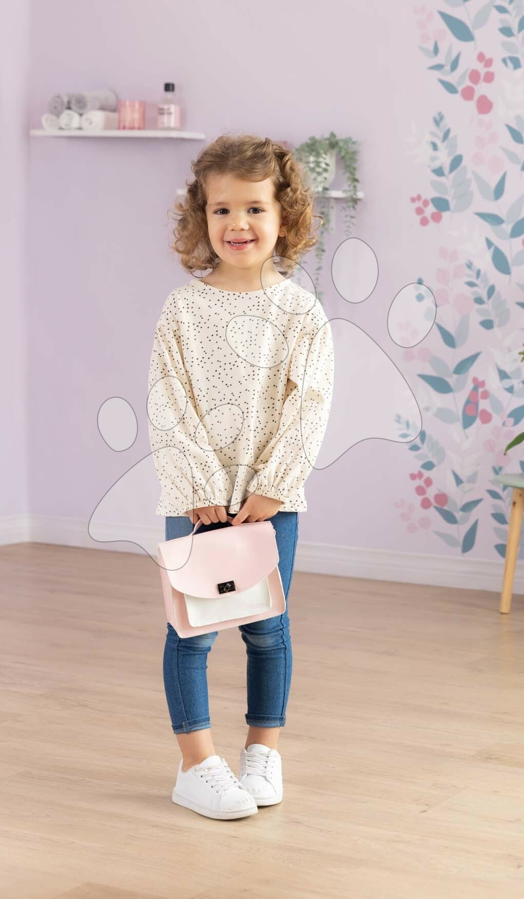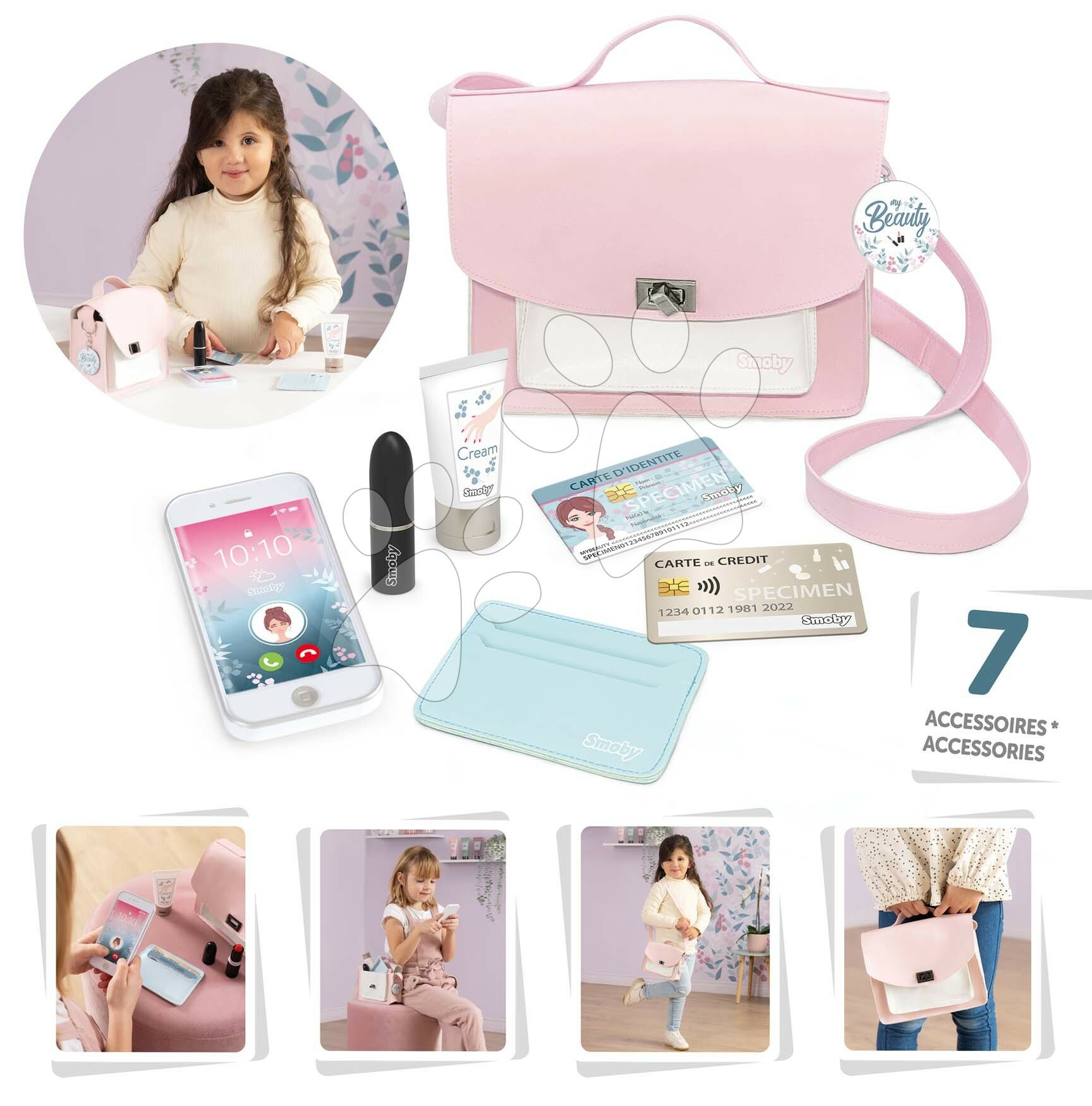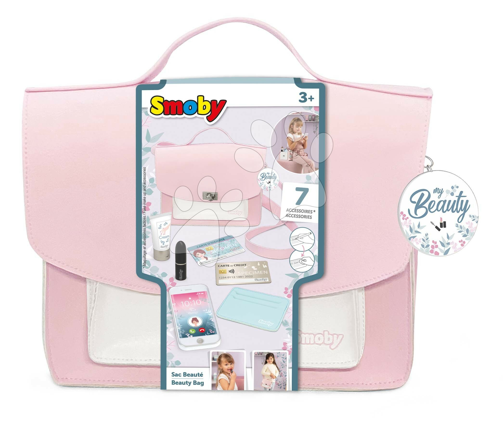 Kabelka s kosmetikou My Beauty Bag od francouzské značky Smoby umožní dívkám od 3 let mít vždy po ruce svou oblíbenou kosmetiku. Okouzlující kabelka v jemném růžovém provedení je vyrobena z měkké umělé kůže, díky ramennímu popruhu je příjemná pro každodenní nošení. Uvnitř kabelky se nachází 2 přihrádky, do kterého se vejde 6 stylových doplňků, mezi kterými je černá rtěnka, tuba s krémem na ruce, modré pouzdro na karty, kreditní karta, doklad o totožnosti a plastový chytrý telefon.