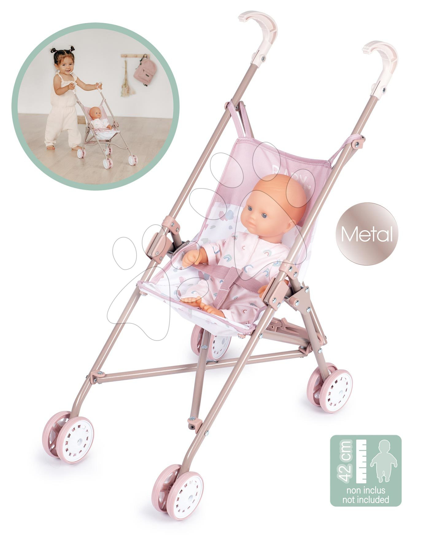 Kočárek golfky Natur D'Amour z kolekce Baby Nurse je stabilní a pevný kočárek, se kterým si zahrají holčičky od 2 let. Je vyhotoven v jemných pastelových odstínech růžové a bílé, jeho sedák se skládá z kvalitního textilu s moderním vzorem a nápisem Baby Nurse. V případě potřeby lze snadno sejmout a vyčistit. Golfky kočárek lze díky promyšlenému systému jednoduše složit a vzít na procházku, do parku nebo na výlet. Výška rukojetí je 58 cm a na sedák se vejde panenka o maximální velikosti 42 cm. Pevná kovová konstrukce v kombinaci s odolným plastem zaručí, že kočárek dětem vydrží dlouhá léta.
