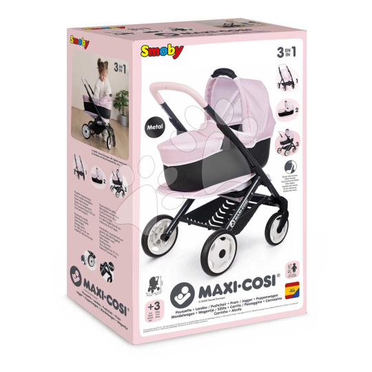Smoby Kočárek trojkombinace Puschair Pink Maxi Cosi&Quinny hluboký sportovní a přenosná postýlka pro 42 cm panenku výška rukojeti 64 cm