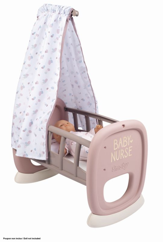 Kolébka s textilním baldachýnem Cradle Natur z populární kolekce Baby Nurse potěší všechny děti a zejména holčičky od 18 měsíců. Do nádherné pastelově růžové kolébky se vejde panenka o maximální velikosti 42 cm. Ve vrchní části se nachází baldachýn, který lze sundat, a také zatáhnout nad panenkou, aby mohla klidně usnout. Při uspávání mohou holčičky panenku kolébat díky oblým podstavcům. Přední čelo postýlky zdobí nápis Baby Nurse.