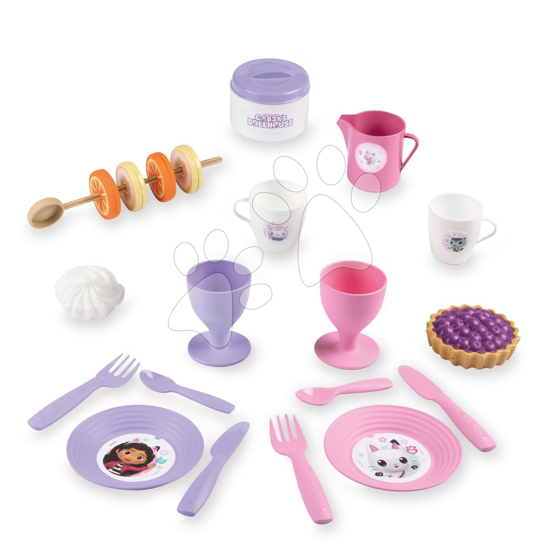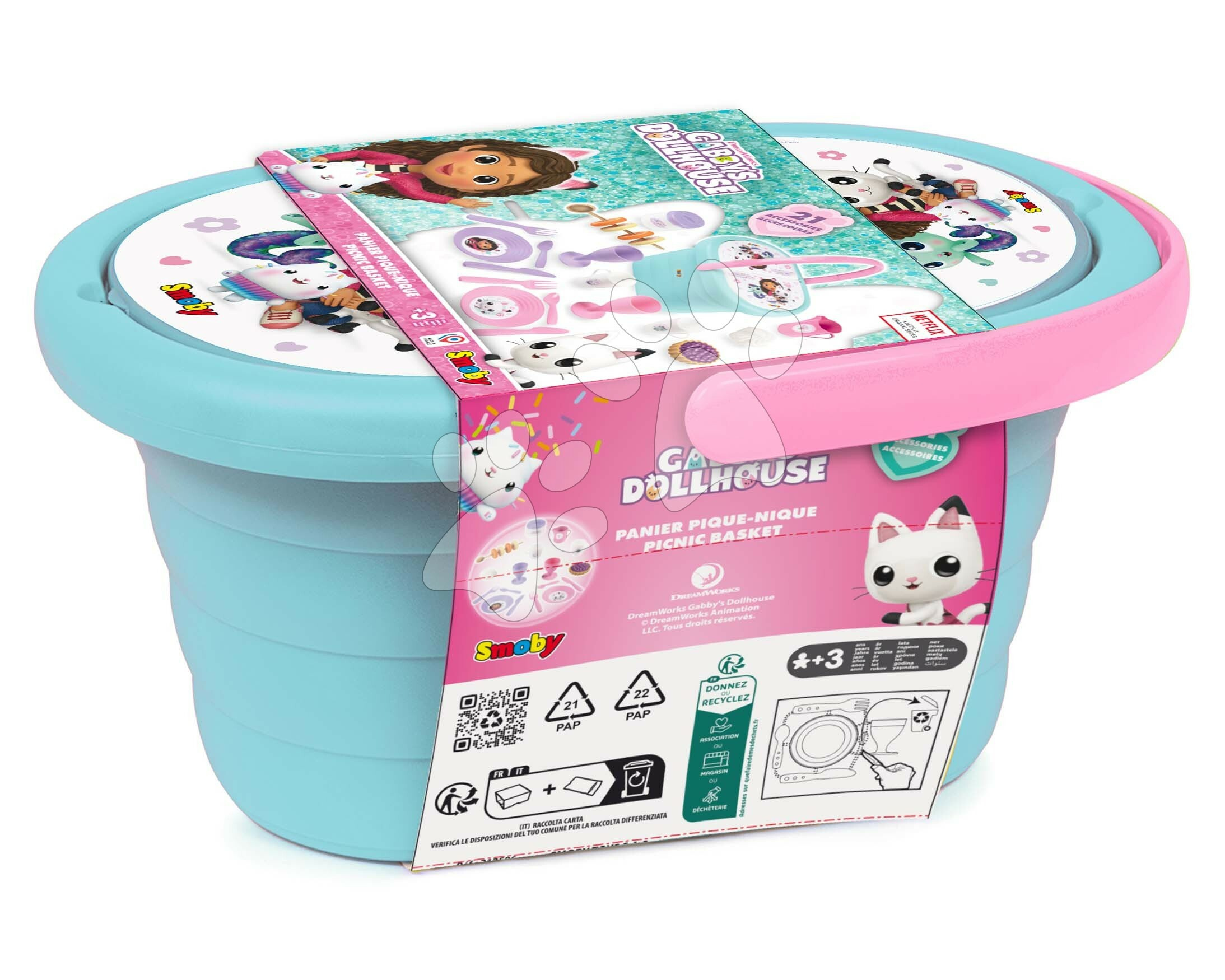 Košík s jídelní soupravou Picnic Basket od francouzského výrobce Smoby potěší všechny děti a zejména holčičky od 3 let. Jídelní souprava v nádherných růžových a fialových barvách se stane součástí každého posezení s dětmi, které ji využijí při oslavách i piknicích. Originální plastový košík s motivem animovaného seriálu Gabby´s Dollhouse v sobě skrývá 2 sklenice, 2 šálky, porci šlehačky, koláček, dózu, 2 talířky, příbory, konvičku na mléko a sušené ovoce na hůlce. Dětský košík lze otevírat ze dvou stran a děti si jej snadno vezmou kamkoli s sebou díky praktickému držadlu.