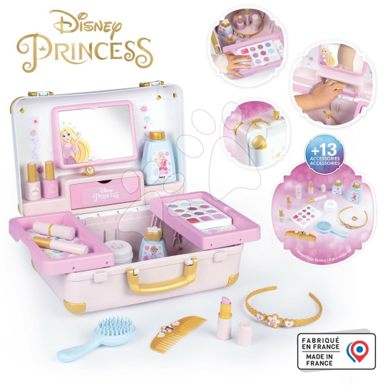 Kosmetický kufřík Disney Princess My Beauty Vanity 3v1 od francouzského výrobce Smoby představuje nádhernou hračku pro holčičky od 3 let, které si rády hrají hry na kadeřnice, kosmetičky a manikérky. Kosmetický kufřík v růžovém provedení s motivem Disney Princezny v sobě skrývá sadu 13 kosmetických doplňků. Děti si je kdykoli mohou odnést v kufříku s praktickým držadlem. Po otevření kufříku má dítě k dispozici hrací plochu se 2 vyklápěcími bočními přihrádkami, na které si připraví potřebné kosmetické doplňky. Kosmetický kufřík vyzdobený obrázkem princezen z Disney pohádek zabaví dívky na dlouhá léta, disponuje dostatečným úložným prostorem.