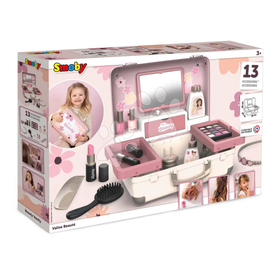 Kosmetický kufřík My Beauty Vanity 3v1 od francouzského Smoby představuje výjimečnou hračku pro všechny děti a zejména holčičky od 3 let, které si rády hrají hry na kadeřnice, vizážistky a manikérky. Kosmetický kufřík v jemném růžovo-modrém provedení v sobě skrývá sadu 13 kosmetických doplňků. Děti si je kdykoli mohou odnést v kufříku s praktickým držadlem. Po otevření kufříku má dítě k dispozici hrací plochu se 2 vyklápěcími bočními přihrádkami, na které si připraví potřebné kosmetické doplňky. Kosmetický kufřík s květinovým designem zabaví dívky na dlouhá léta, disponuje dostatečným úložným prostorem.