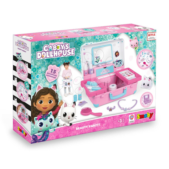 Kosmetický kufřík se zrcadlem Vanity 3v1 od francouzského výrobce Smoby představuje nádhernou hračku pro holčičky od 3 let, které si rády hrají hry na kadeřnice, kosmetičky a manikérky. Kosmetický kufřík v růžovém provedení s motivem Gabby´s Dollhouse v sobě skrývá sadu 15 kosmetických doplňků. Děti si je kdykoli mohou odnést v kufříku s praktickým držadlem. Po otevření kufříku má dítě k dispozici hrací plochu se 2 vyklápěcími bočními přihrádkami, na které si připraví potřebné kosmetické doplňky. Kosmetický kufřík vyzdobený animovanými obrázky hrdinky Gabby a roztomilých kočiček zabaví dívky na dlouhá léta, disponuje dostatečným úložným prostorem.