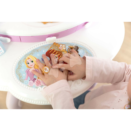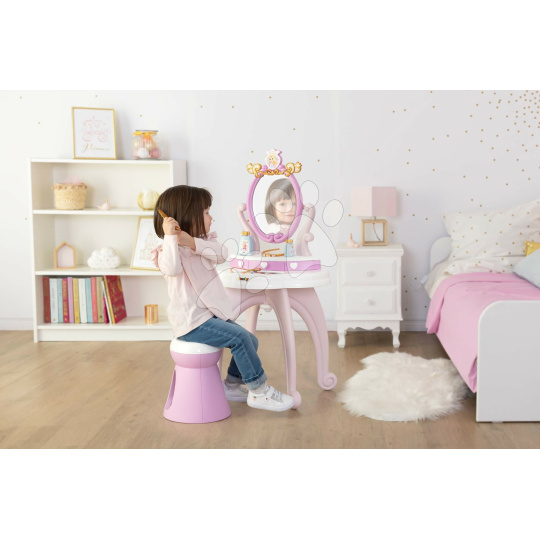 Všechny plastové díly na kosmetickém stolku jsou vyrobeny se zaoblenými hranami s ohledem na bezpečnost vašeho dítěte. Součástí stolku je také nastavitelné zrcadlo s pohádkovým emblémem, které je vyrobeno z kvalitního materiálu, bezpečného pro dítě. Všechny kosmetické pomůcky lze uložit do praktických zásuvek pod zrcadlem. Holčičky si budou moci dosyta poohlížet svůj odraz, starat se o své vlásky a s kamarádkami si zahrají hru na povolání kosmetičky, přibližují se světu dospělých. Rozvíjejí si svoji jemnou motoriku, šikovnost a tříbí si cit pro estetiku, komunikační schopnosti.