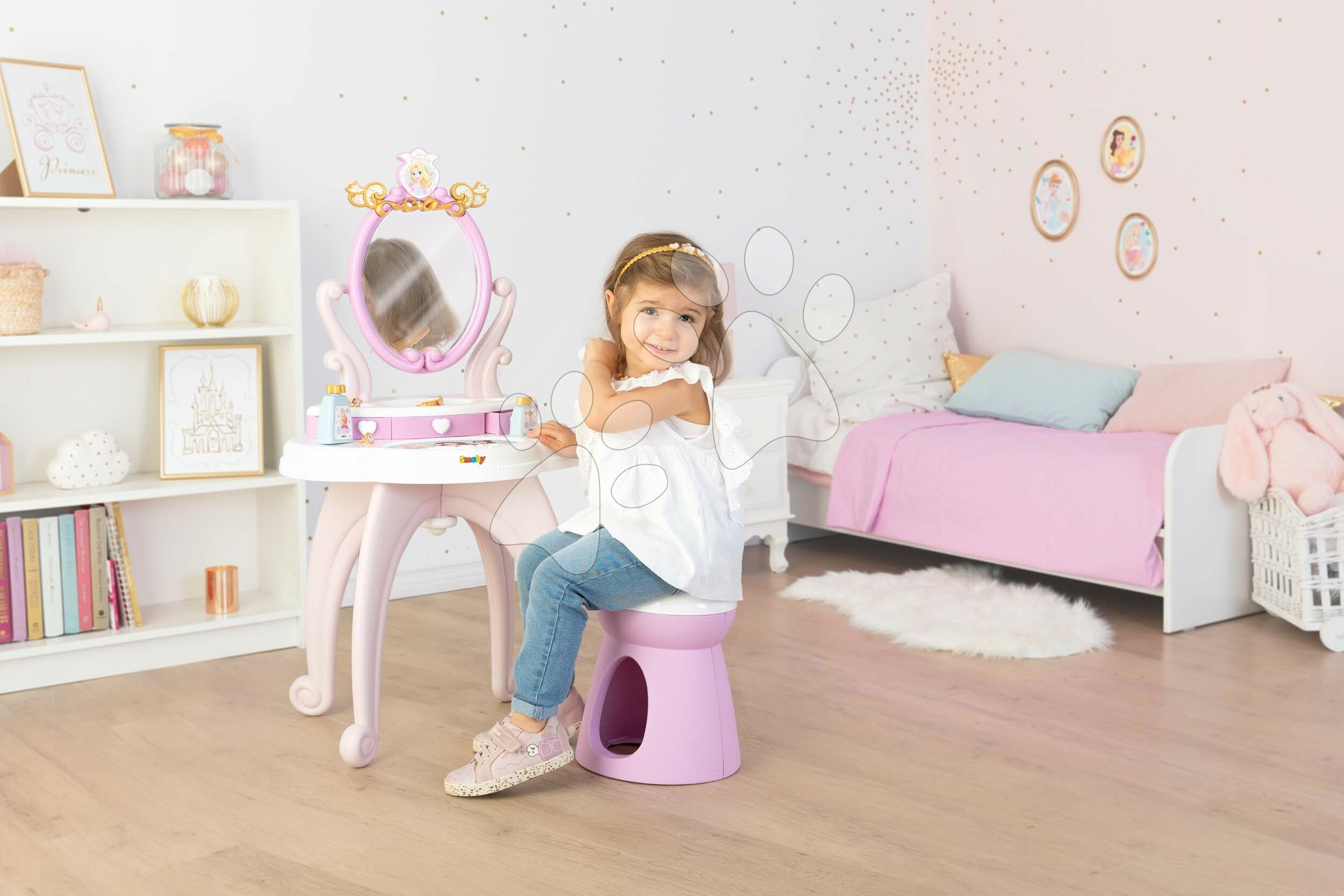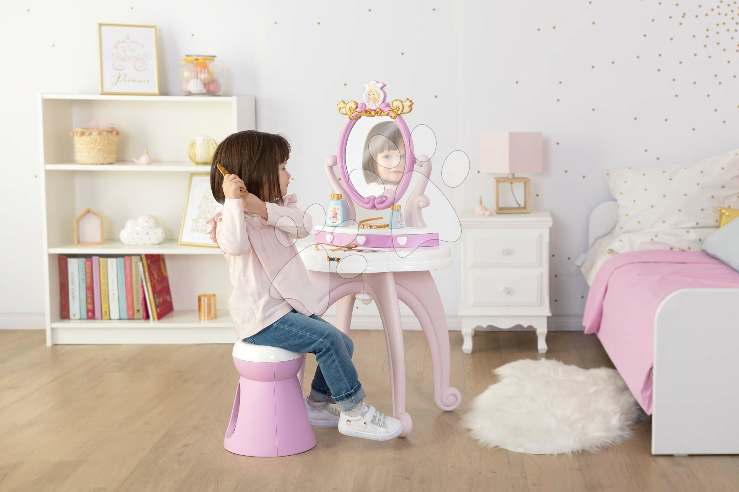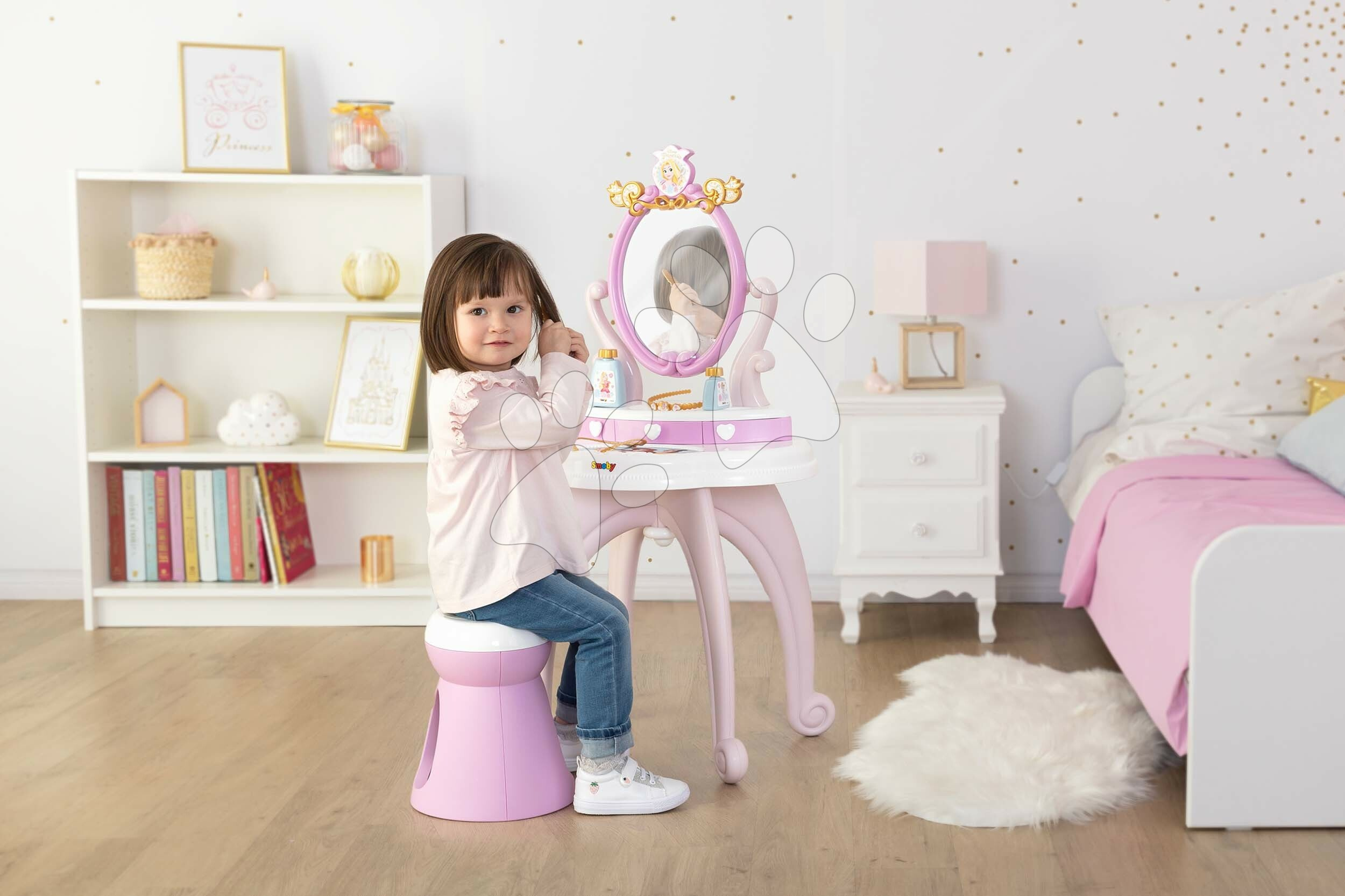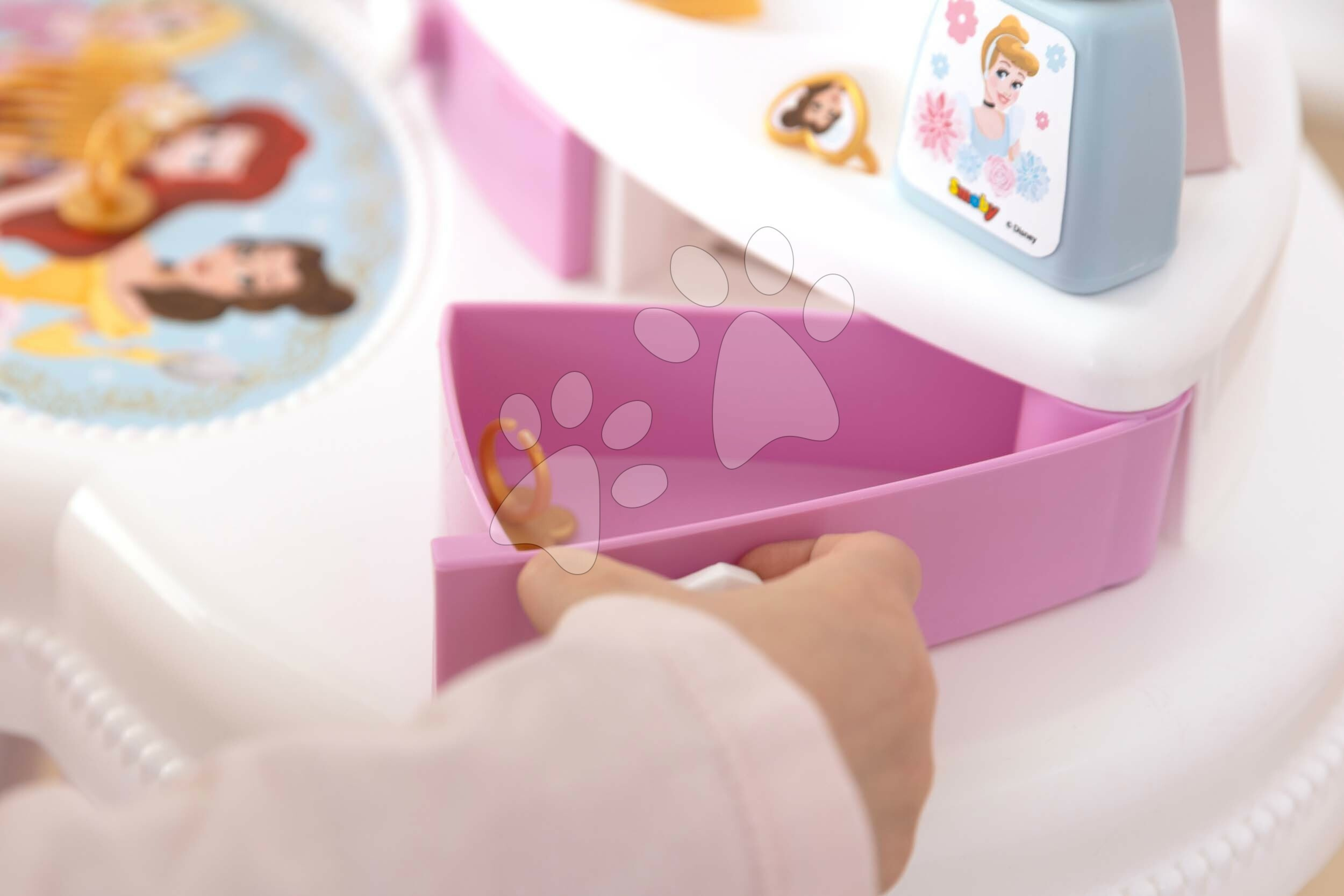 Všechny plastové díly na kosmetickém stolku jsou vyrobeny se zaoblenými hranami s ohledem na bezpečnost vašeho dítěte. Součástí stolku je také nastavitelné zrcadlo s pohádkovým emblémem, které je vyrobeno z kvalitního materiálu, bezpečného pro dítě. Všechny kosmetické pomůcky lze uložit do praktických zásuvek pod zrcadlem. Holčičky si budou moci dosyta poohlížet svůj odraz, starat se o své vlásky a s kamarádkami si zahrají hru na povolání kosmetičky, přibližují se světu dospělých. Rozvíjejí si svoji jemnou motoriku, šikovnost a tříbí si cit pro estetiku, komunikační schopnosti.