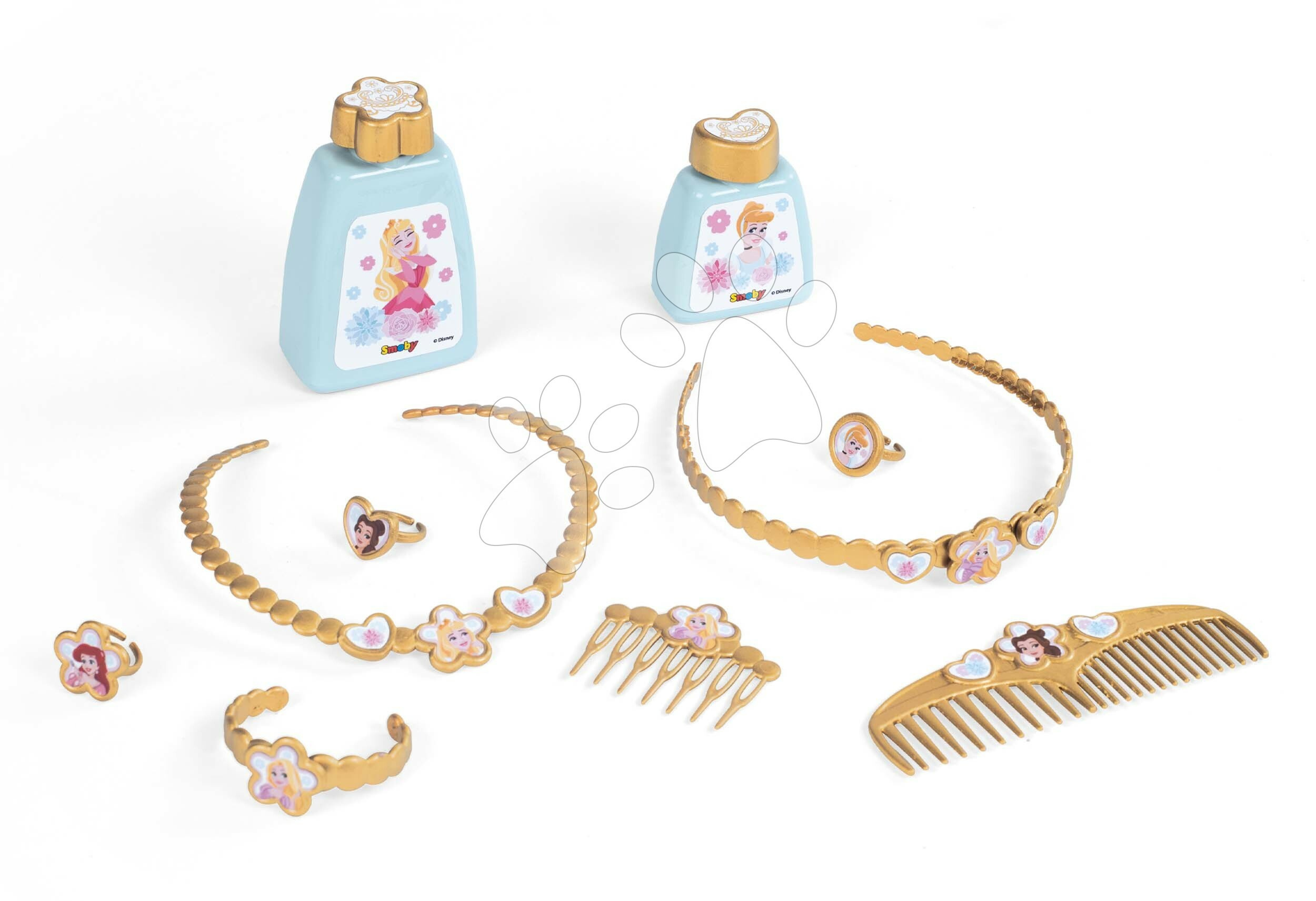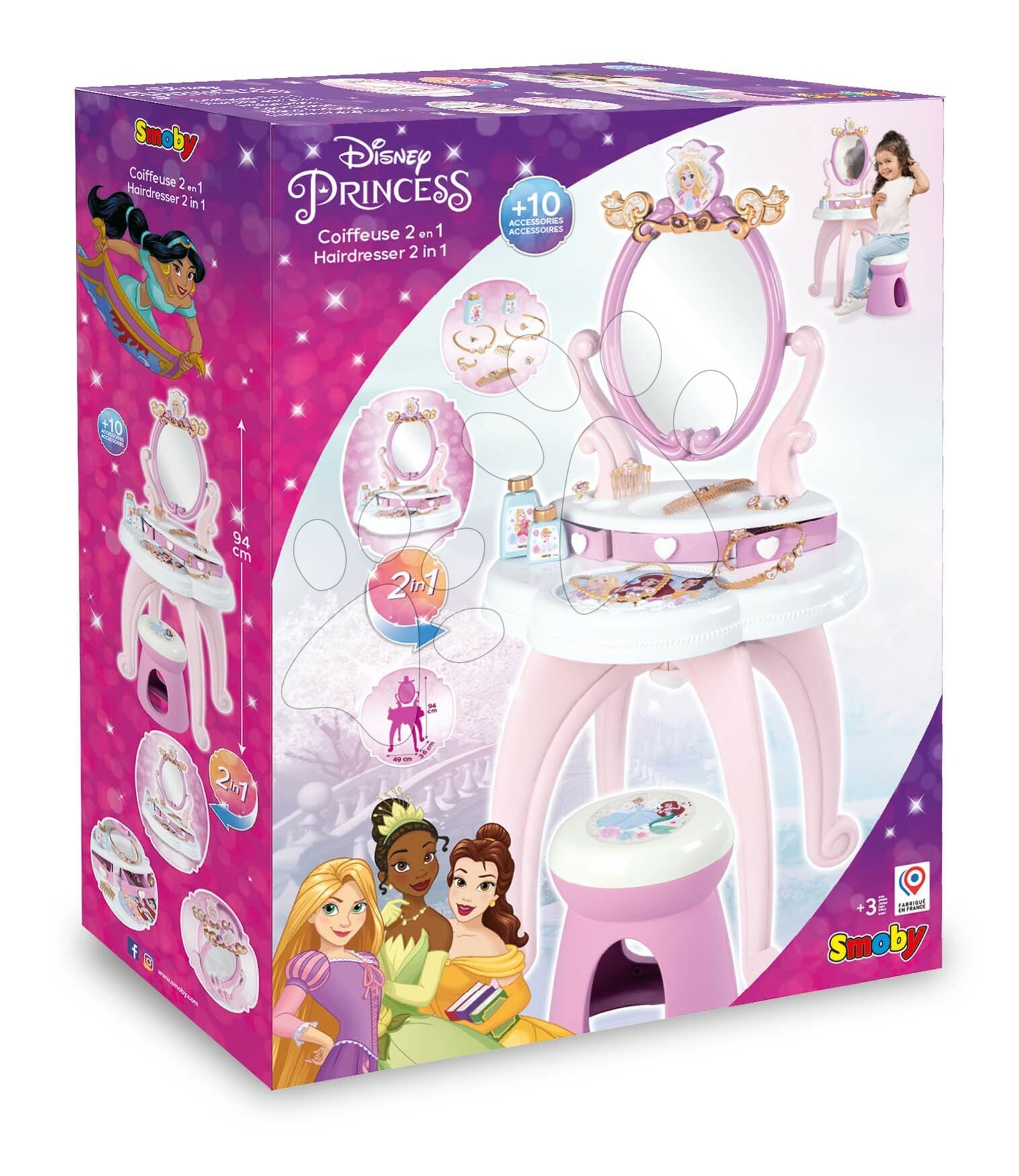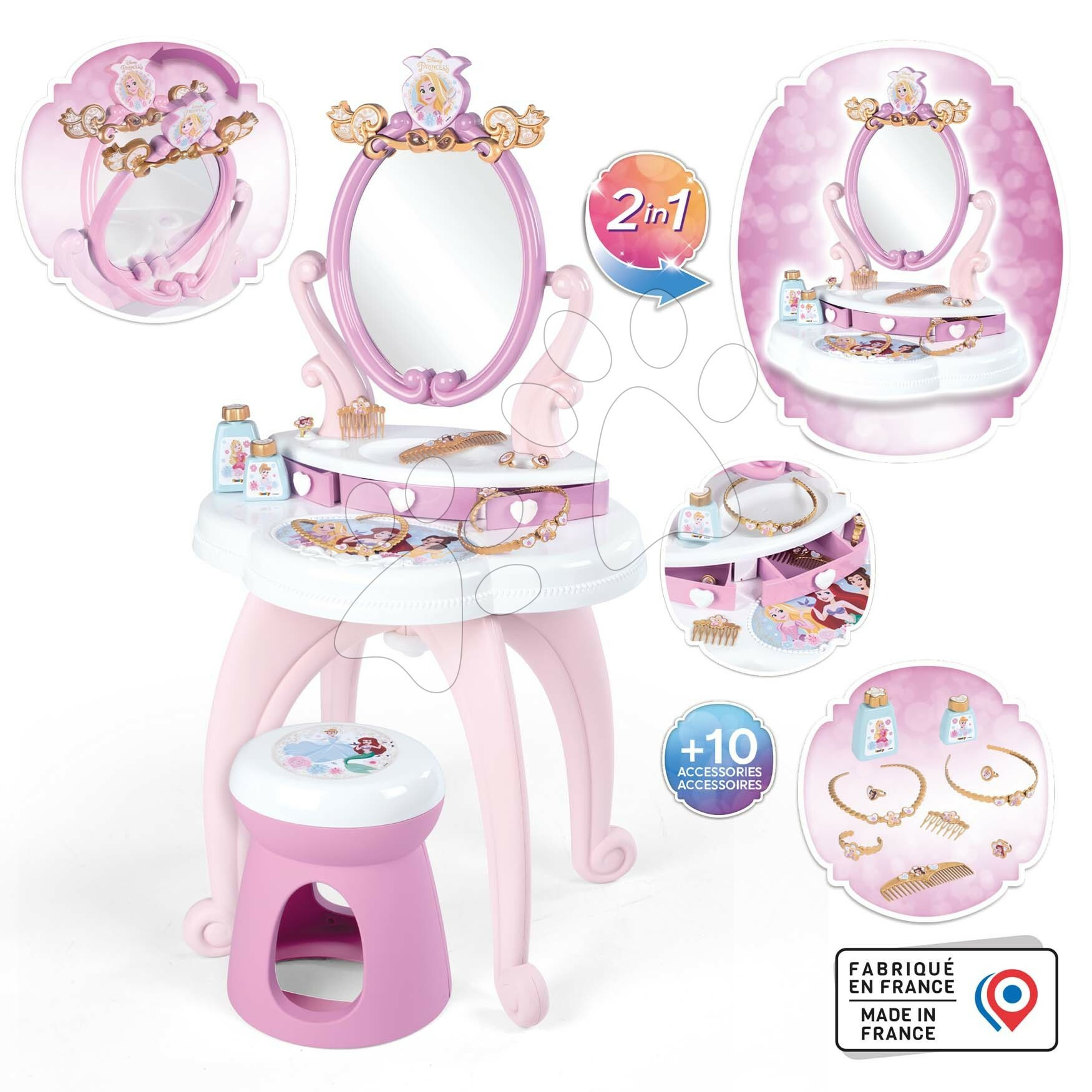 Kosmetický stolek a židle Disney Princess od francouzského výrobce Smoby představuje vynikající dárek pro všechny holčičky již od 3 let. Nádherný růžový stolek se zrcadlem a židlí nadchne vaše nejmenší animovaným motivem Disney Princezny. Pohádkový kosmetický stolek je vyzdoben obrázky princezen, originální design a jemně vypracované detaily okouzlí dítě na první pohled. Při hře na kosmetičky děti využijí 10 doplňků, mezi kterými najdou 3 prstýnky, hřeben a hřebínek, náhrdelník, náramek, čelenku a 2 lahvičky určené na parfém.