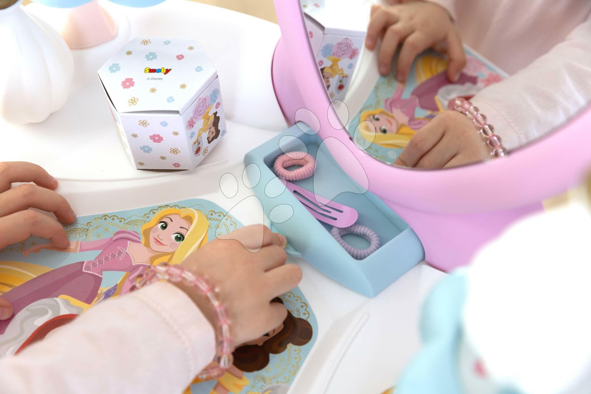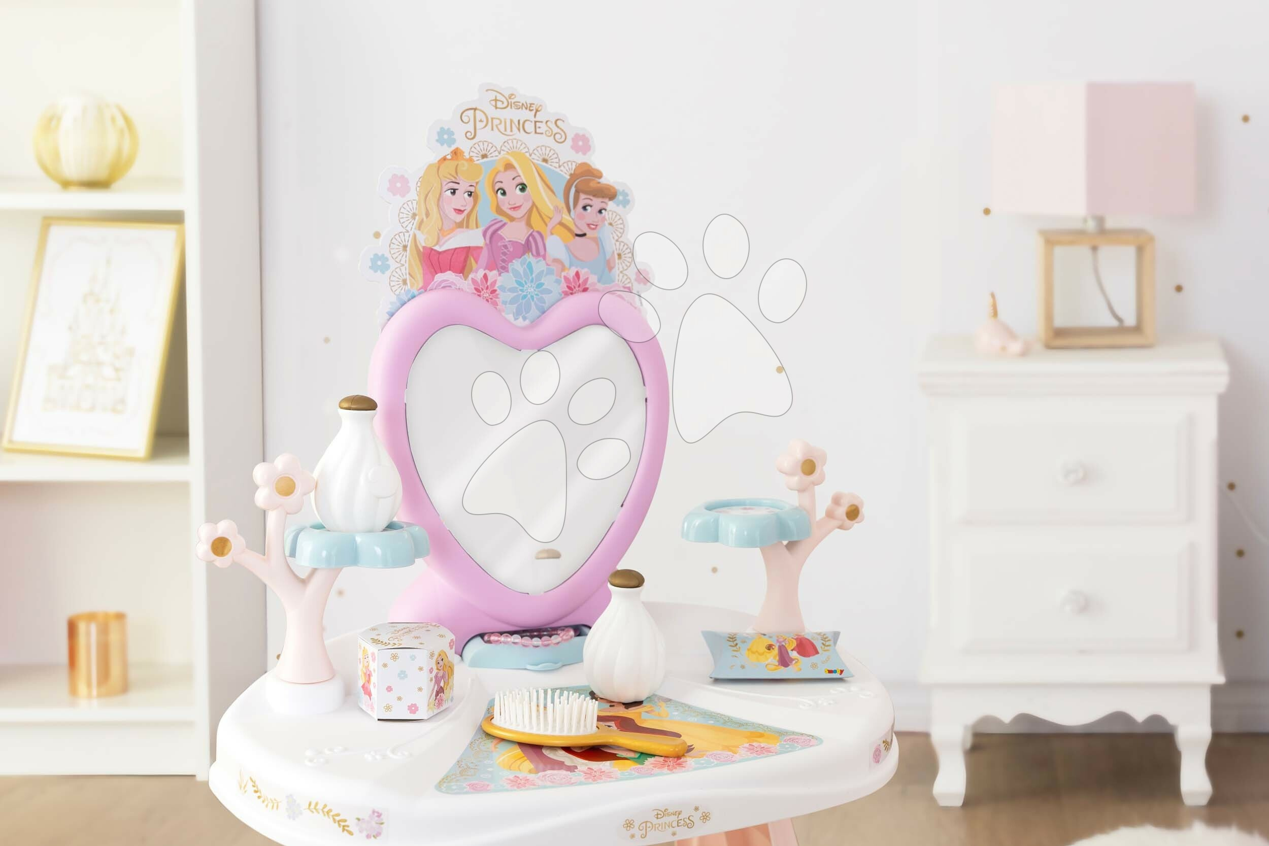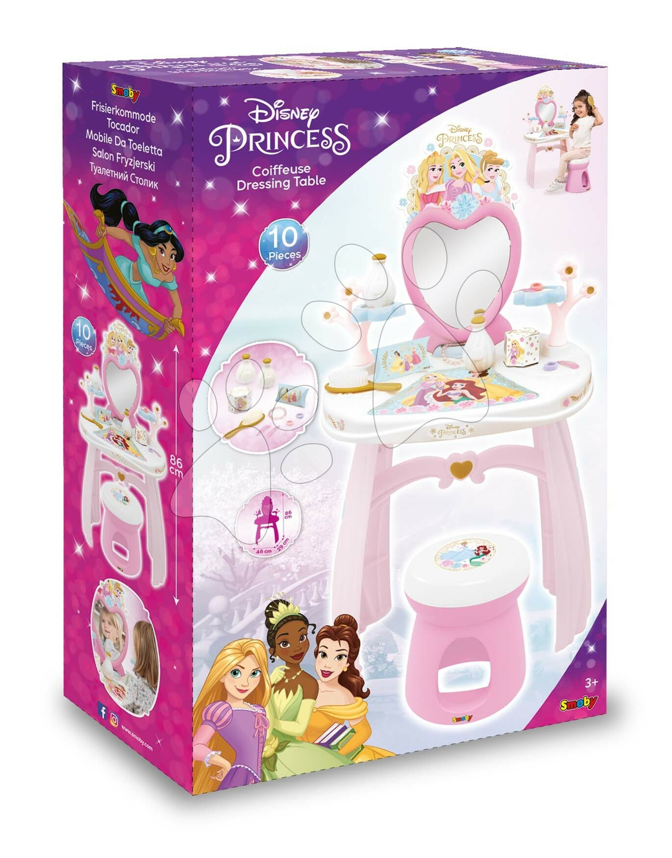 Kosmetický stolek Dressing Table od francouzského Smoby potěší všechny holčičky již od 3 let. Nádherný stolek v růžovo-bílé barevné kombinaci se zrcadlem a židlí zdobí animovaný motiv Disney Princezny. Okouzlující motiv pohádkových princezen okouzlí holčičky na první pohled. Součástí kosmetického stolku je i sada 10 doplňků, mezi nimiž jsou 2 lahvičky parfému, 2 krabičky, 2 gumičky a 2 sponky do vlasů, náramek a kartáč na vlasy.