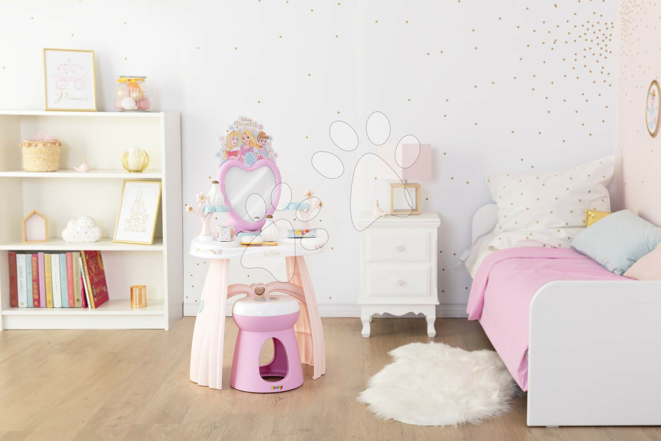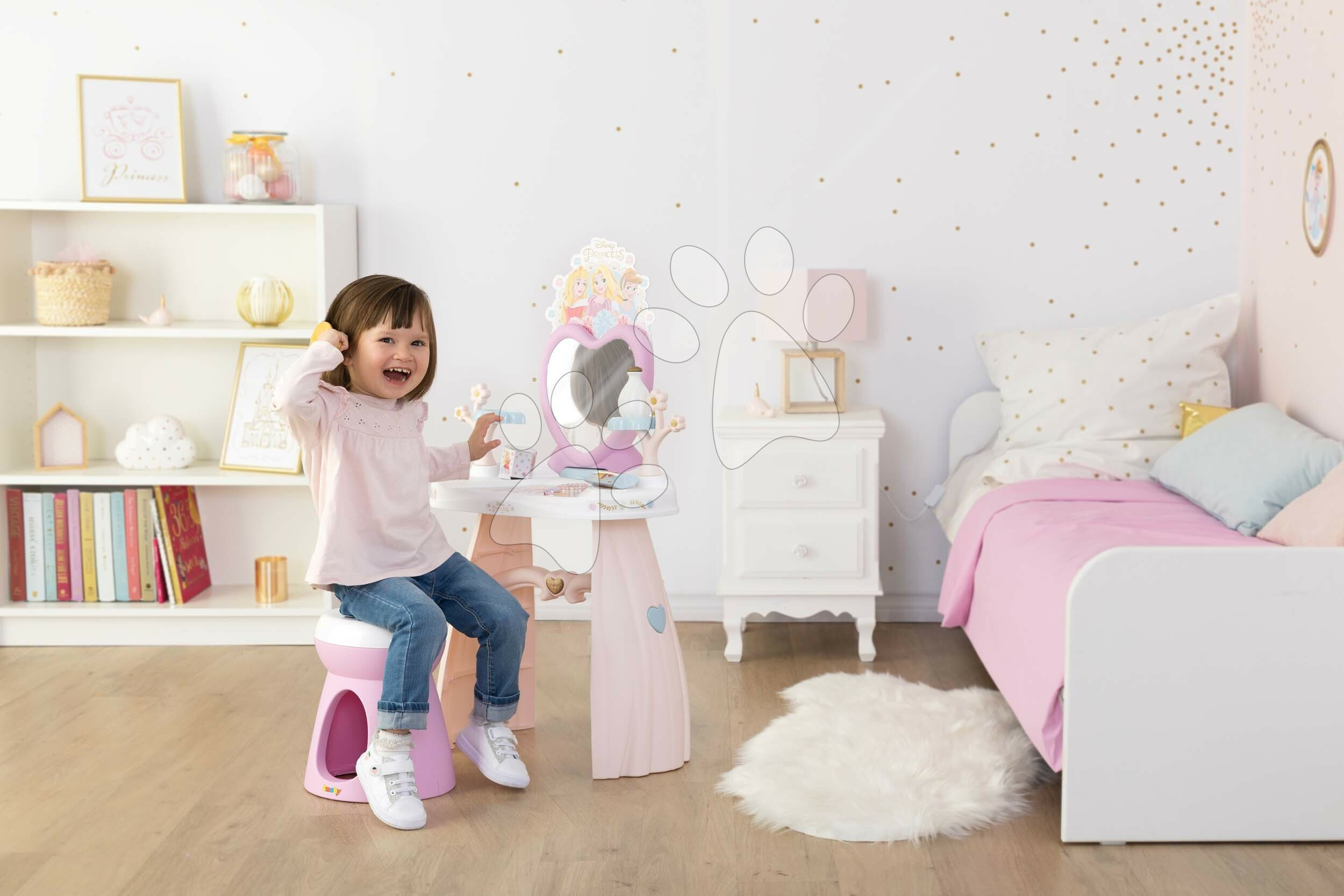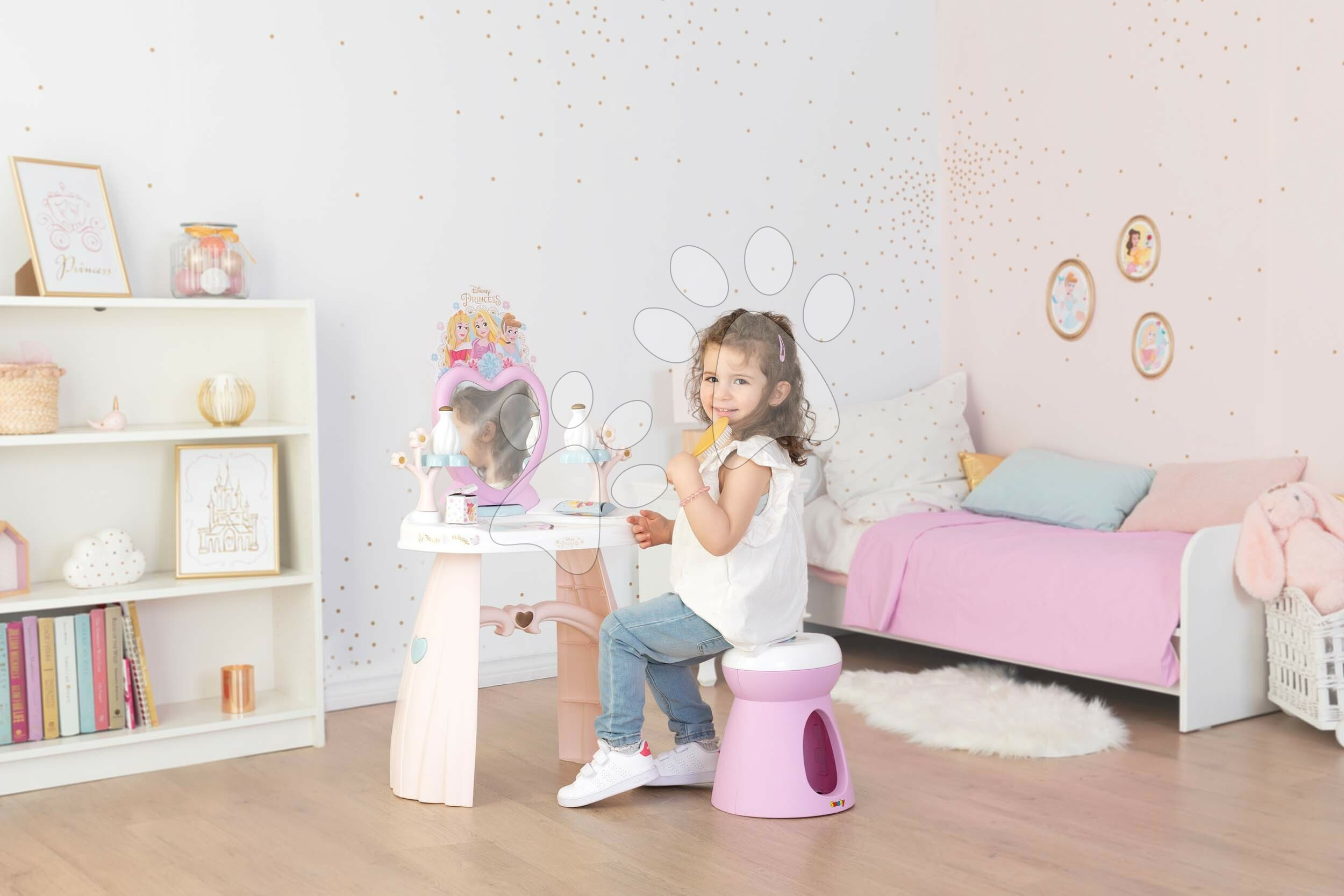 Kosmetický stolek Dressing Table od francouzského Smoby potěší všechny holčičky již od 3 let. Nádherný stolek v růžovo-bílé barevné kombinaci se zrcadlem a židlí zdobí animovaný motiv Disney Princezny. Okouzlující motiv pohádkových princezen okouzlí holčičky na první pohled. Součástí kosmetického stolku je i sada 10 doplňků, mezi nimiž jsou 2 lahvičky parfému, 2 krabičky, 2 gumičky a 2 sponky do vlasů, náramek a kartáč na vlasy.