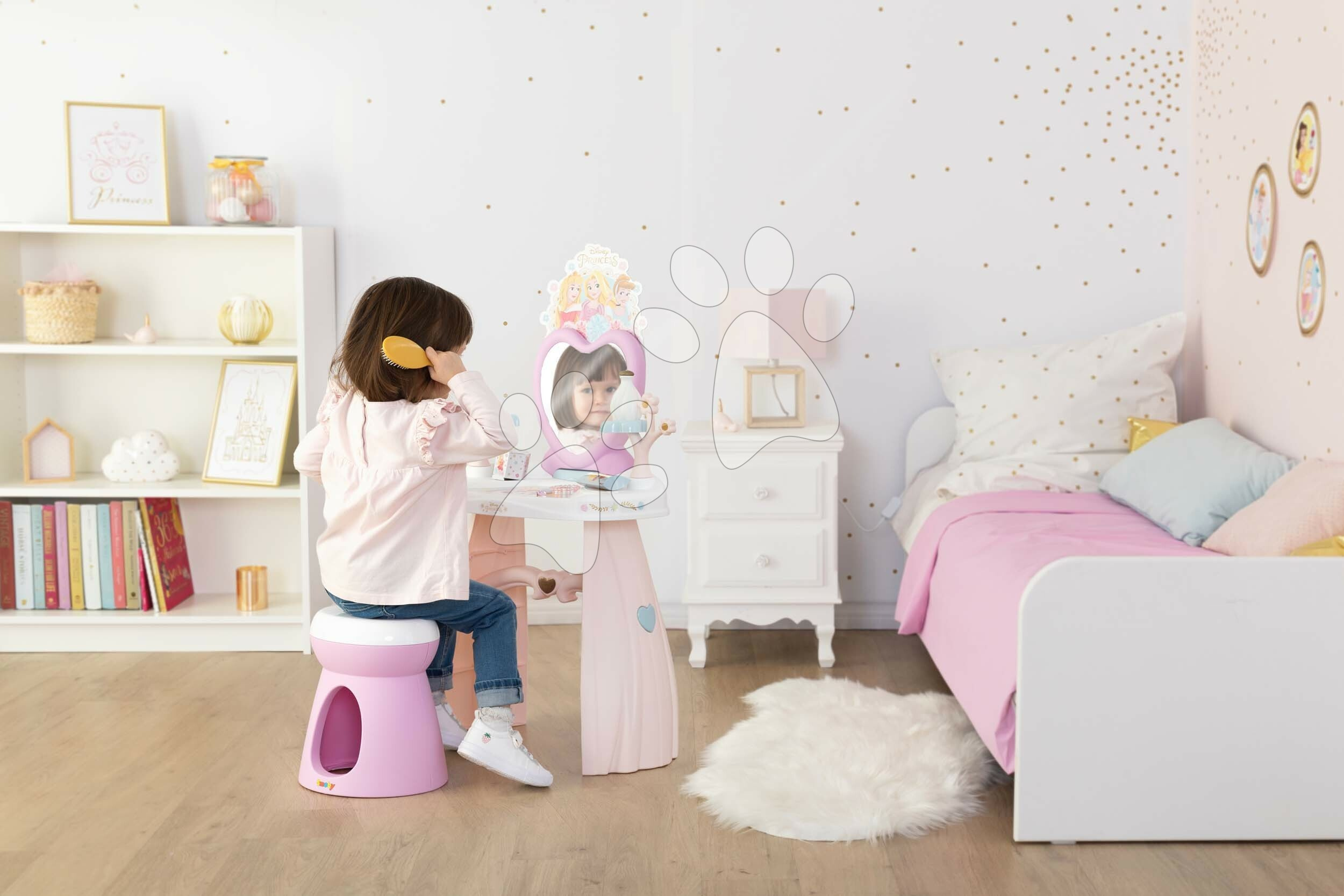 Všechny plastové díly na kosmetickém stolku jsou vyrobeny se zaoblenými hranami s ohledem na bezpečnost vašeho dítěte. Zrcadlo ve tvaru srdíčka je vyzdobeno pohádkovým emblémem s obrázkem princezen. Děti potěší úložný prostor v podobě malé zásuvky pod zrcadlem a poličkám ve tvaru stromů. Holčičky si budou moci dosyta prohlížet svůj odraz, starat se o své vlásky a s kamarádkami si zahrají hru na povolání kosmetičky, čímž se přibližují světu dospělých a rozvíjejí si komunikační schopnosti. Také si rozvíjí jemnou motoriku a získávají cit pro estetiku.
