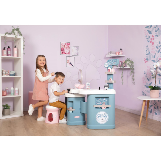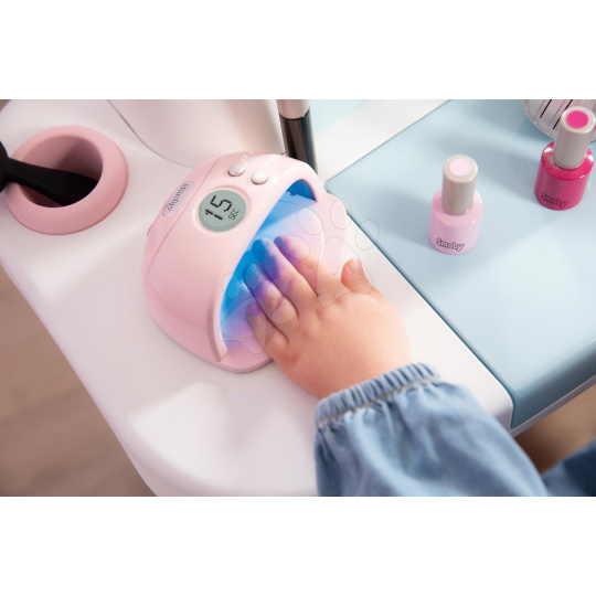 Při hře na manikérky a vizážisty se děti výborně zabaví s 2 laky na nehty, paletou očních stínů, rtěnkami s mechanickou funkcí, spirálou a lahvičkou s krémem. Součástí výbavy je i replika elektronické UV lampičky na vytvrzení gelových laků, která vydává zvuky a svítí. Díky ní získá dítě ještě realističtější zážitek z každé hry. Po dokončení úprav nehtů může kadeřnice nasadit zákazníkovi na prst velký ozdobný prsten. Střední část kosmetického salonu je vybavena umyvadlem a ruční sprchou. Na tomto místě mohou kadeřnice pečlivě umýt vlásky svým zákazníkům nebo své panence, která není součástí balení.