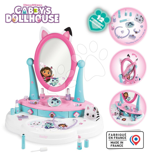 Kosmetický stolek Gabby Tabletop Dressing Table od francouzského výrobce Smoby potěší všechny děti a zejména holčičky již od 3 let. Originální kosmetický stolek v růžovo-modré barevné kombinaci se zrcadlem si děti jednoduše položí na stolek nebo i na postel v dětském pokoji a zahrají si na povolání kosmetiček. Malý kosmetický stolek zdobí animovaný motiv animované série Gabby, obrázky okouzlujících kočiček zaujme holčičky na první pohled. Součástí kosmetického stolku je i sada 12 kosmetických doplňků, mezi kterými je náramek, hřebínek, řasenka, náhrdelník, laky, rtěnka a prstýnky.