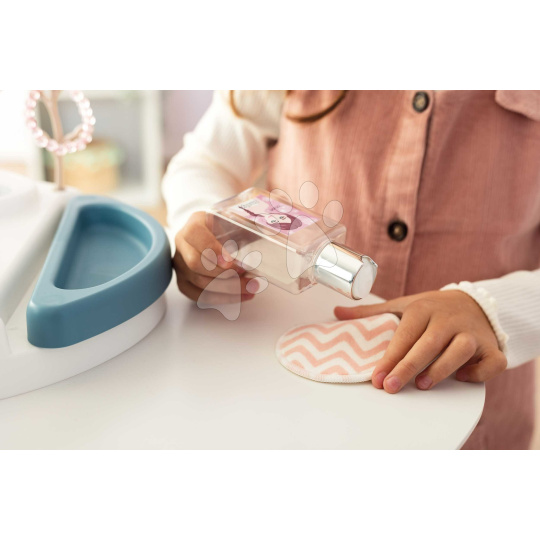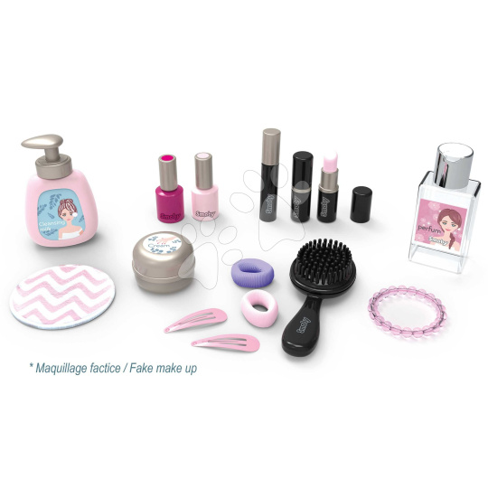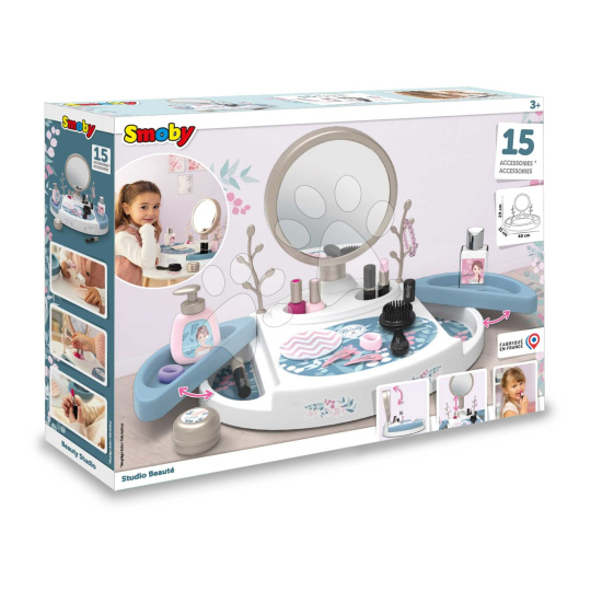 Kosmetický stolek My Beauty Studio od francouzského výrobce Smoby představuje vynikající dárek pro děti od 3 let. Originální kosmetický stolek v bílo-modré barevné kombinaci se zrcadlem si holčičky položí na stolek nebo i na postel v dětském pokoji a zahrají si na povolání kosmetiček. Kompaktní kosmetický stolek je vybaven kulatým zrcadlem, které lze vyjmout a používat i samostatně. V 15dílné sadě doplňků se nacházejí repliky kosmetických doplňků, dívky se mohou těšit na tělové mléko, rtěnku, laky na nehty, řasenku, parfém, krém na ruce, gumičky a sponky do vlasů, náramek a kartáč na vlasy.