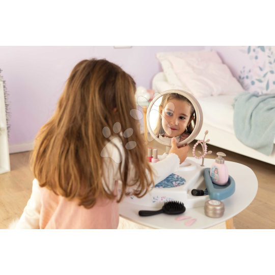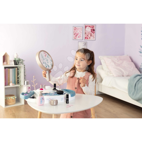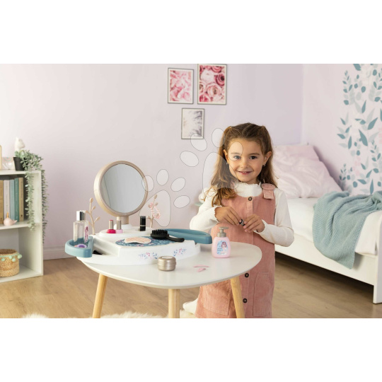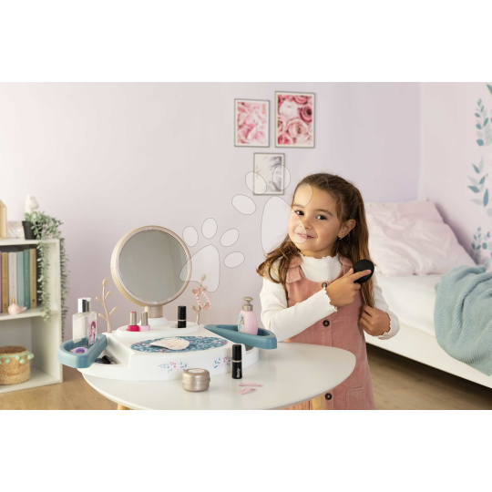 Stolek je vybaven dostatkem úložného prostoru, doplňky lze odkládat do otevíratelných přihrádek po stranách stolku a vedle zrcadla jsou stromečky, na které si holčičky zavěsí své oblíbené šperky. Kosmetický stolek se vyznačuje prvotřídní kvalitou, je vyroben z pevných plastů s jemným povrchem. Holčičky si budou moci v zrcadle dosyta poohlížet svůj odraz, starat se o vlásky a s kamarádkami si zahrají hru na povolání kosmetiček, čímž se přibližují světu dospělých a rozvíjejí si komunikační schopnosti. Také si zlepšují jemnou motoriku a získávají cit pro estetiku. Rozměry stolku jsou 40*31*29 cm.