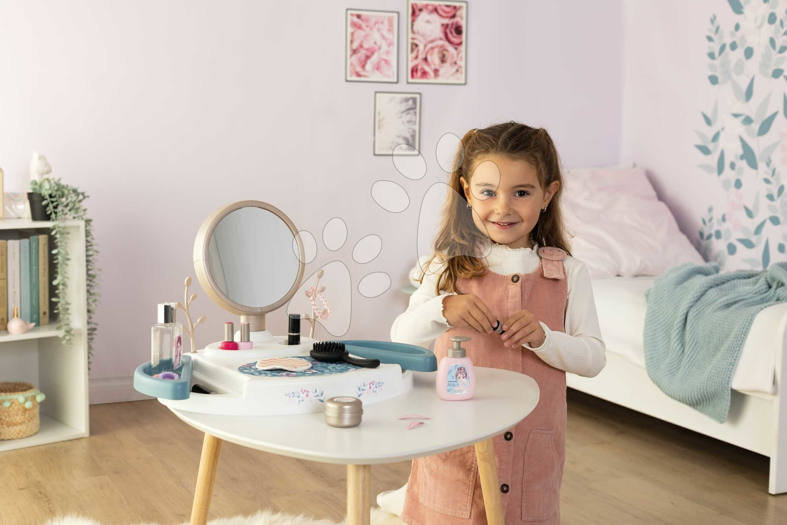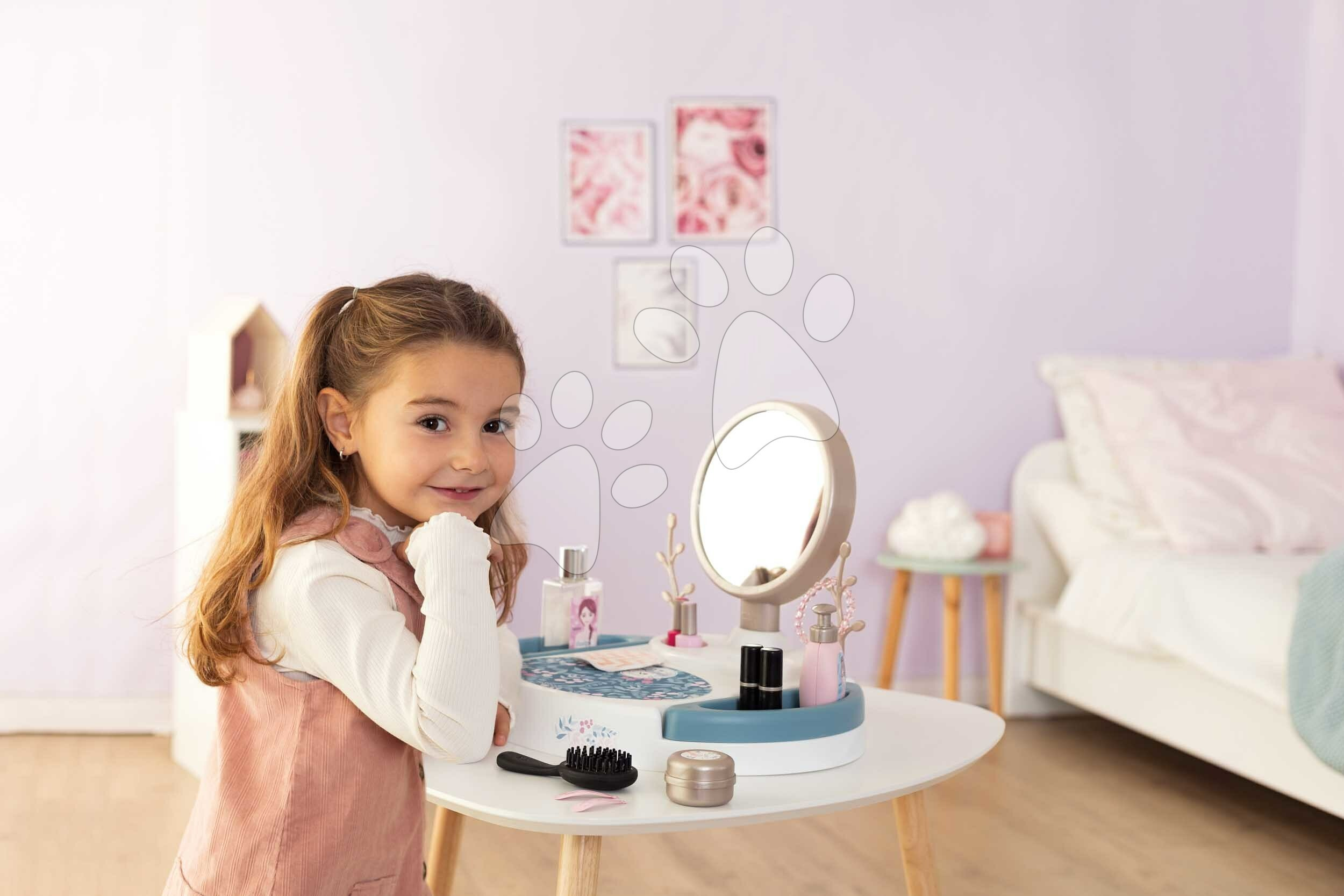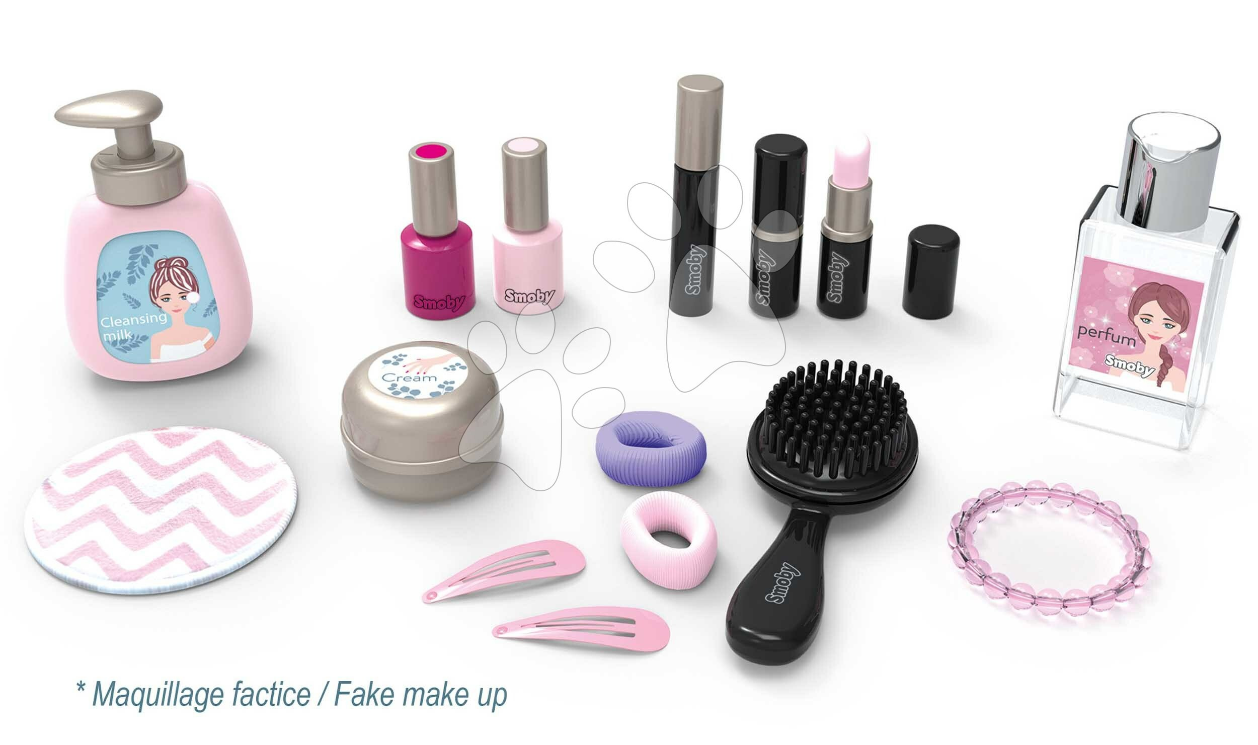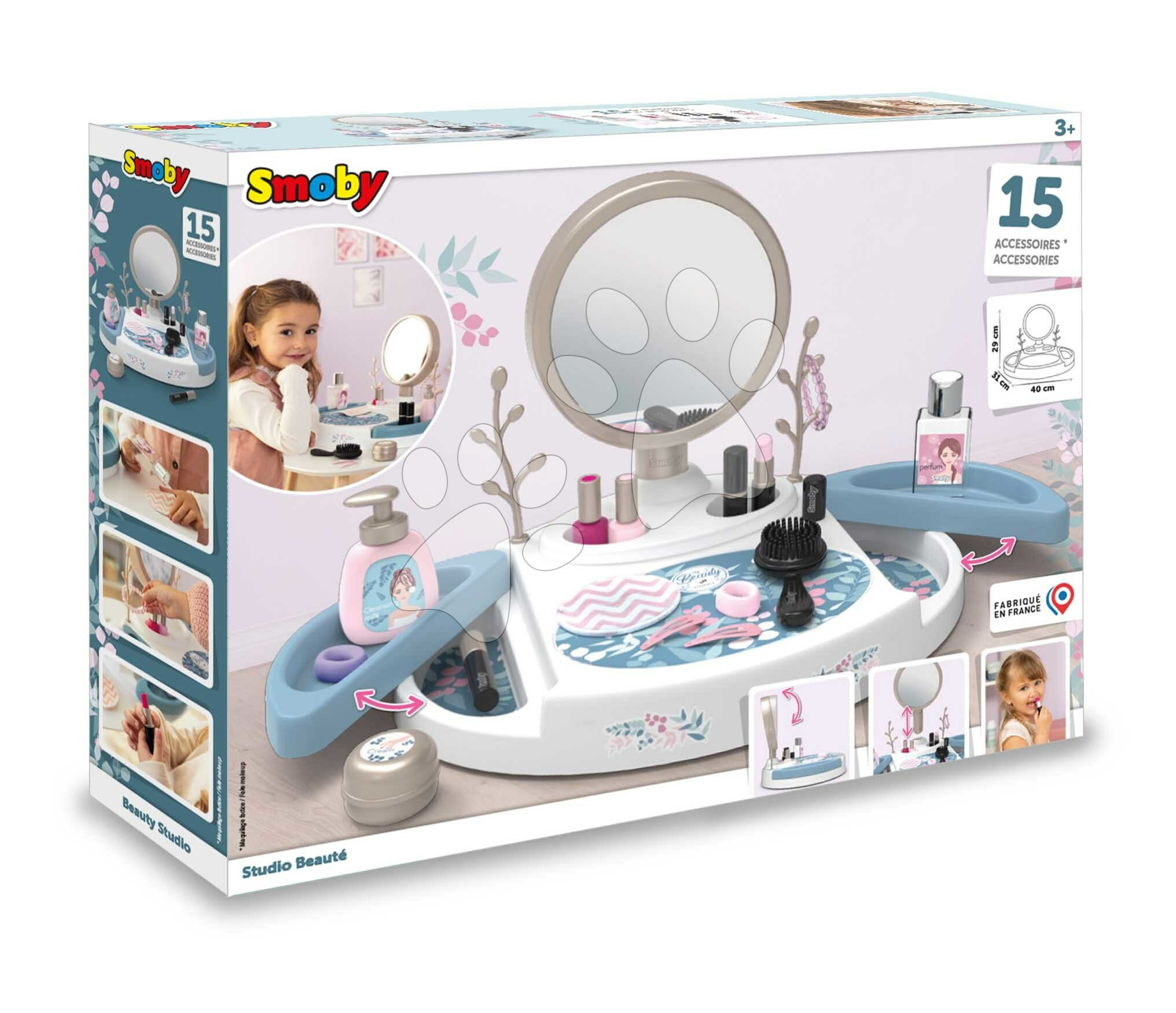 Kosmetický stolek My Beauty Studio od francouzského výrobce Smoby představuje vynikající dárek pro děti od 3 let. Originální kosmetický stolek v bílo-modré barevné kombinaci se zrcadlem si holčičky položí na stolek nebo i na postel v dětském pokoji a zahrají si na povolání kosmetiček. Kompaktní kosmetický stolek je vybaven kulatým zrcadlem, které lze vyjmout a používat i samostatně. V 15dílné sadě doplňků se nacházejí repliky kosmetických doplňků, dívky se mohou těšit na tělové mléko, rtěnku, laky na nehty, řasenku, parfém, krém na ruce, gumičky a sponky do vlasů, náramek a kartáč na vlasy.