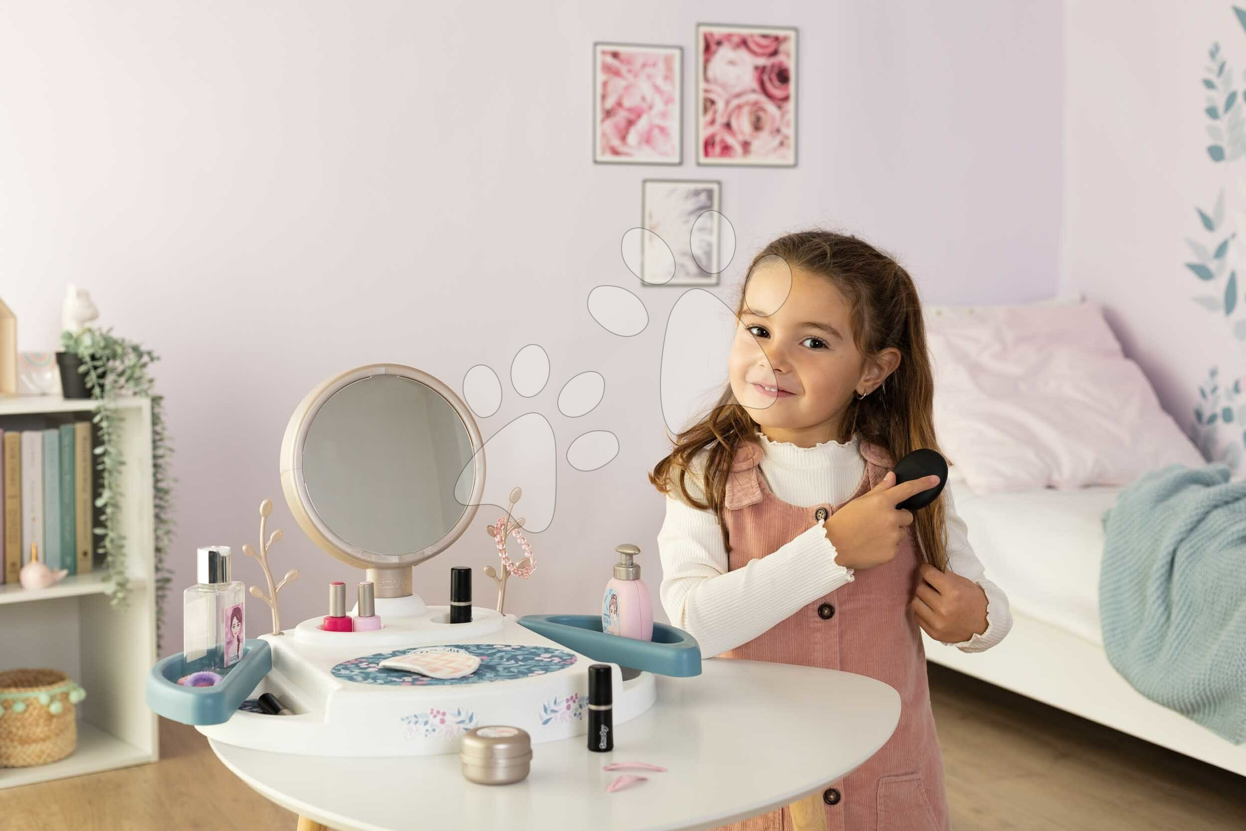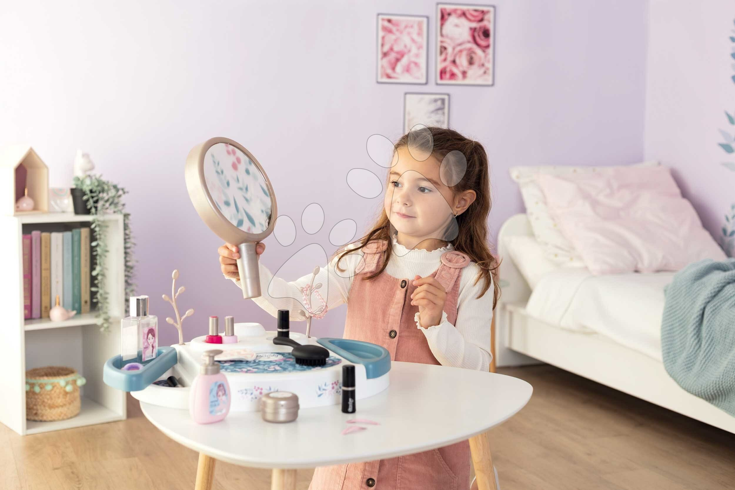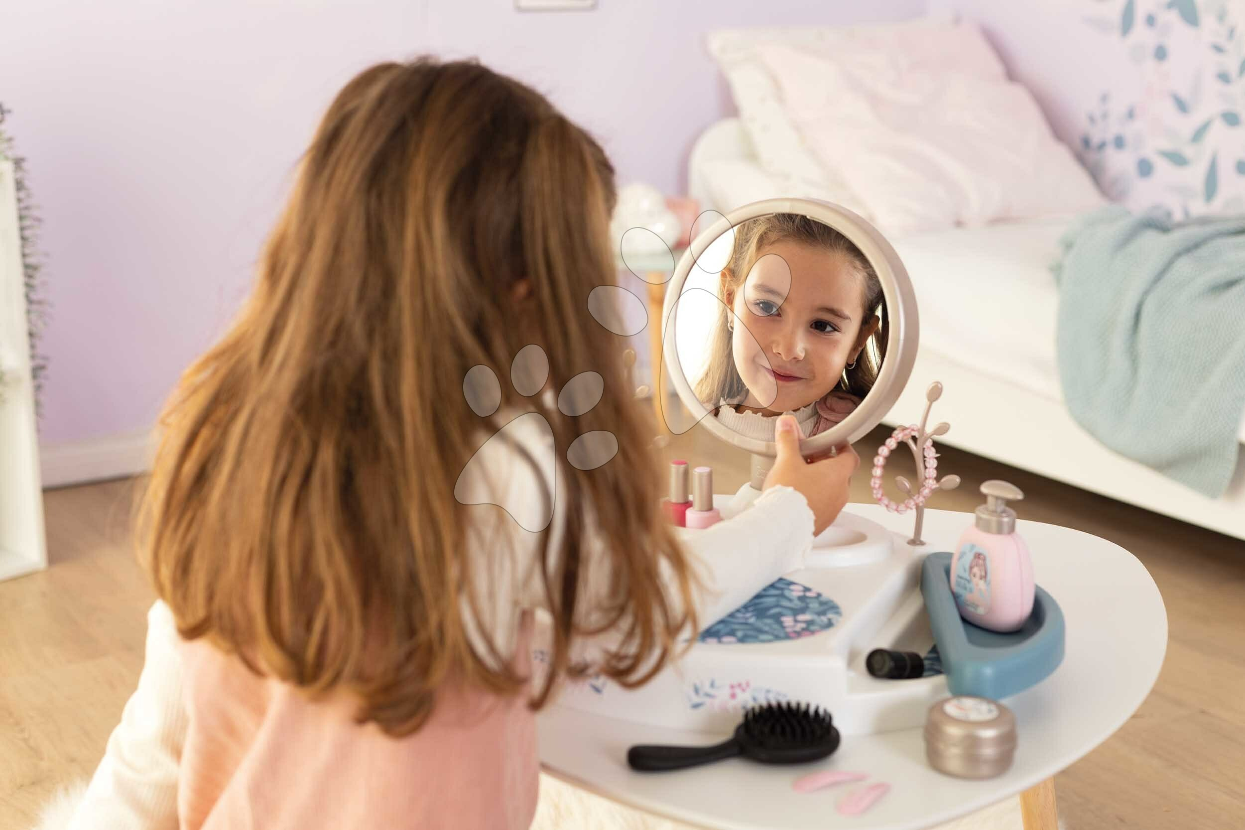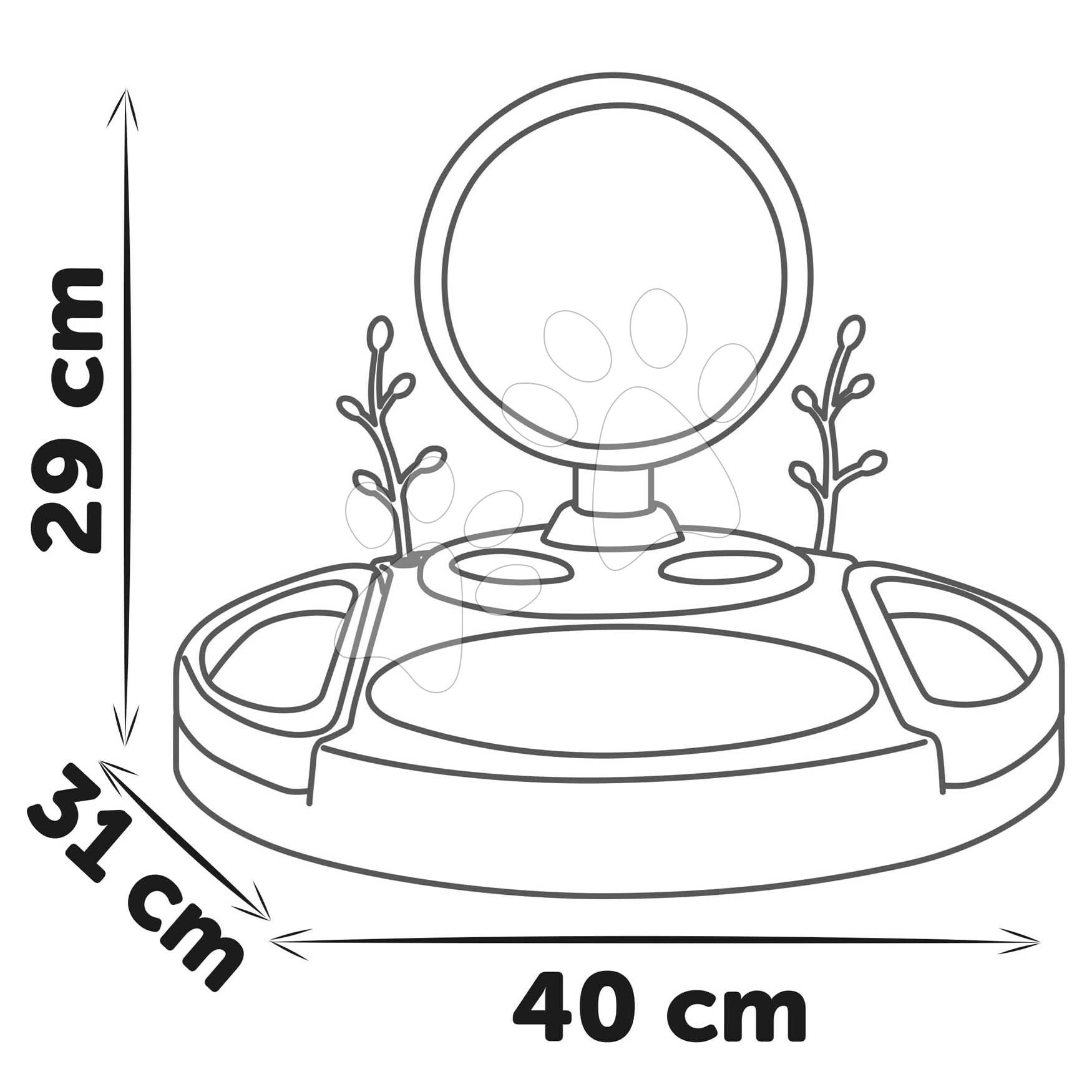 Stolek je vybaven dostatkem úložného prostoru, doplňky lze odkládat do otevíratelných přihrádek po stranách stolku a vedle zrcadla jsou stromečky, na které si holčičky zavěsí své oblíbené šperky. Kosmetický stolek se vyznačuje prvotřídní kvalitou, je vyroben z pevných plastů s jemným povrchem. Holčičky si budou moci v zrcadle dosyta poohlížet svůj odraz, starat se o vlásky a s kamarádkami si zahrají hru na povolání kosmetiček, čímž se přibližují světu dospělých a rozvíjejí si komunikační schopnosti. Také si zlepšují jemnou motoriku a získávají cit pro estetiku. Rozměry stolku jsou 40*31*29 cm.
