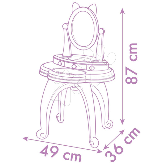Všechny plastové díly na kosmetickém stolku jsou vyrobeny se zaoblenými hranami s ohledem na bezpečnost dítěte. Otočné zrcadlo s růžovými kočičími oušky si holčičky přizpůsobí podle svých potřeb a také se potěší úložnému prostoru v podobě 3 zásuvek pod zrcadlem. Holčičky si budou moci dosyta prohlížet svůj odraz, starat se o své vlásky as kamarádkami si zahrají hru na povolání kosmetiček, čímž se přibližují světu dospělých a rozvíjejí si komunikační schopnosti. Také si zlepšují jemnou motoriku a získávají cit pro estetiku. Kosmetická židle má nosnost až 50 kg. Rozměry stolku jsou 49*36*94 cm.