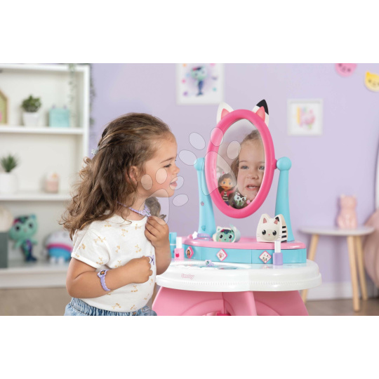 Kosmetický stolek Gabby Dressing Table od francouzského výrobce Smoby potěší všechny děti a zejména holčičky již od 3 let. Originální stolek v růžovo-modré barevné kombinaci se zrcadlem a židlí zdobí animovaný motiv známé animované série Gabby. Nádherný motiv s obrázky kočiček okouzlí holčičky na první pohled. Součástí kosmetického stolku je i sada 12 kosmetických doplňků, mezi kterými je náramek, hřebínek, řasenka, náhrdelník, laky, rtěnka a prstýnky. Naplno si zahrají na povolání kosmetiček a naučí se, jak správně zacházet s kosmetikou.