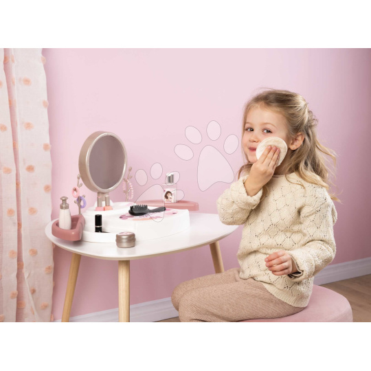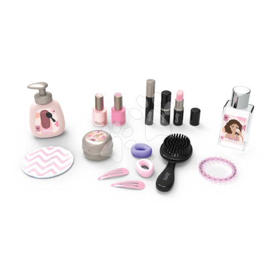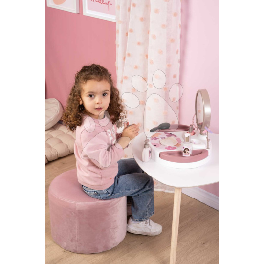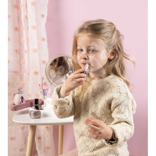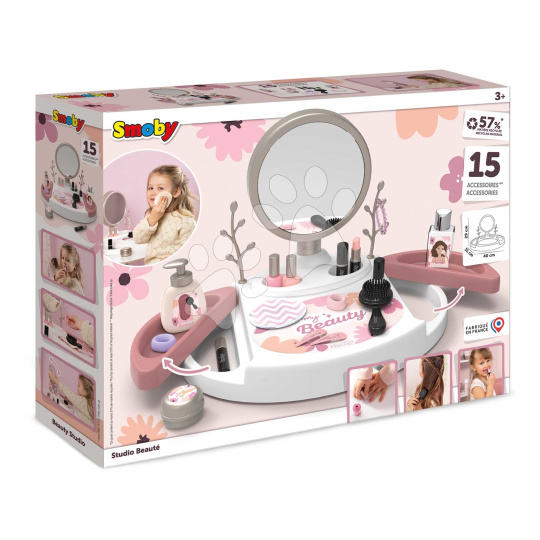 Kosmetický stolek My Beauty Studio od francouzského výrobce Smoby představuje perfektní volbu pro všechny dívky od 3 let. Originální kosmetický stolek v růžovo-bílé barevné kombinaci se zrcadlem si dívky položí na stolek nebo i na postel v dětském pokoji a zahrají si na povolání kosmetiček. Kompaktní kosmetický stolek je vybaven kulatým zrcadlem, které lze vyjmout a používat i samostatně. V 15dílné sadě doplňků se nacházejí repliky kosmetických doplňků, dívky se mohou těšit na rtěnku, laky na nehty, řasenku, parfém, krém na ruce, gumičky a sponky do vlasů, náramek a kartáč na vlasy.