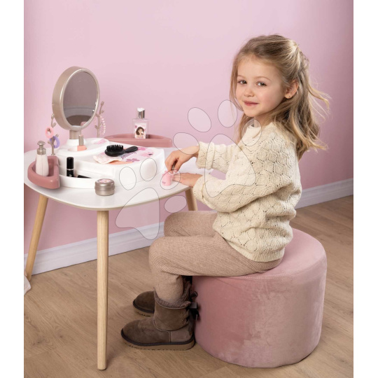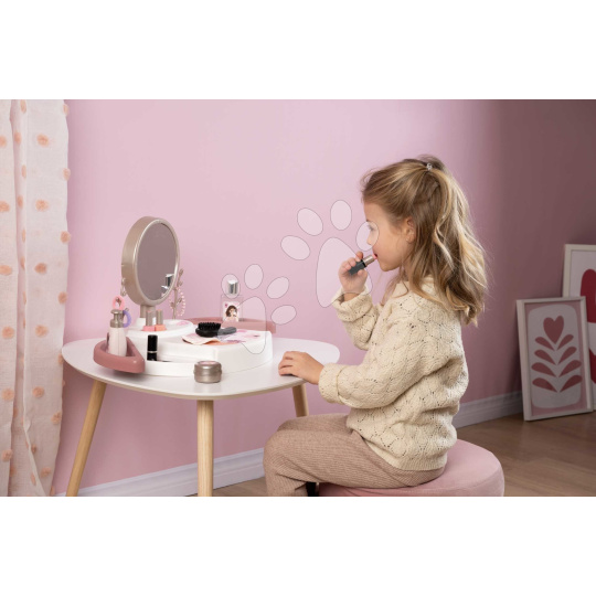 Stolek je vybaven dostatkem úložného prostoru, doplňky lze odkládat do otevíratelných přihrádek po bocích stolku a vedle zrcadla jsou stromky, na které si holčičky zavěsí své oblíbené šperky. Kosmetický stolek se vyznačuje prvotřídní kvalitou, je vyroben z pevných plastů s jemným povrchem. Holčičky si budou moci v zrcadle dosyta poohlížet svůj odraz, starat se o vlásky a s kamarádkami si zahrají hru na povolání kosmetiček, čímž se přibližují světu dospělých a rozvíjejí si komunikační schopnosti. Také si zlepšují jemnou motoriku a získávají cit pro estetiku. Rozměry stolku jsou 40*31*30 cm, při ekologické výrobě bylo použito až 57 % recyklovaných plastových materiálů.