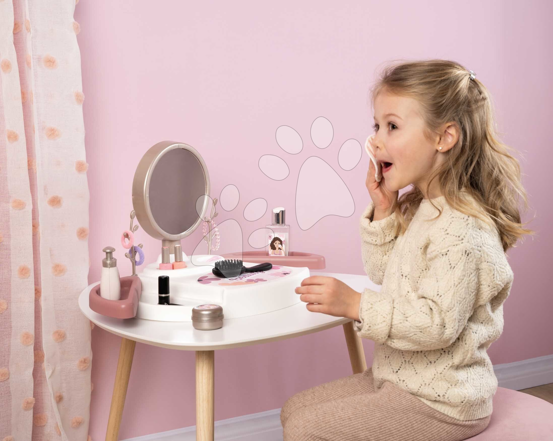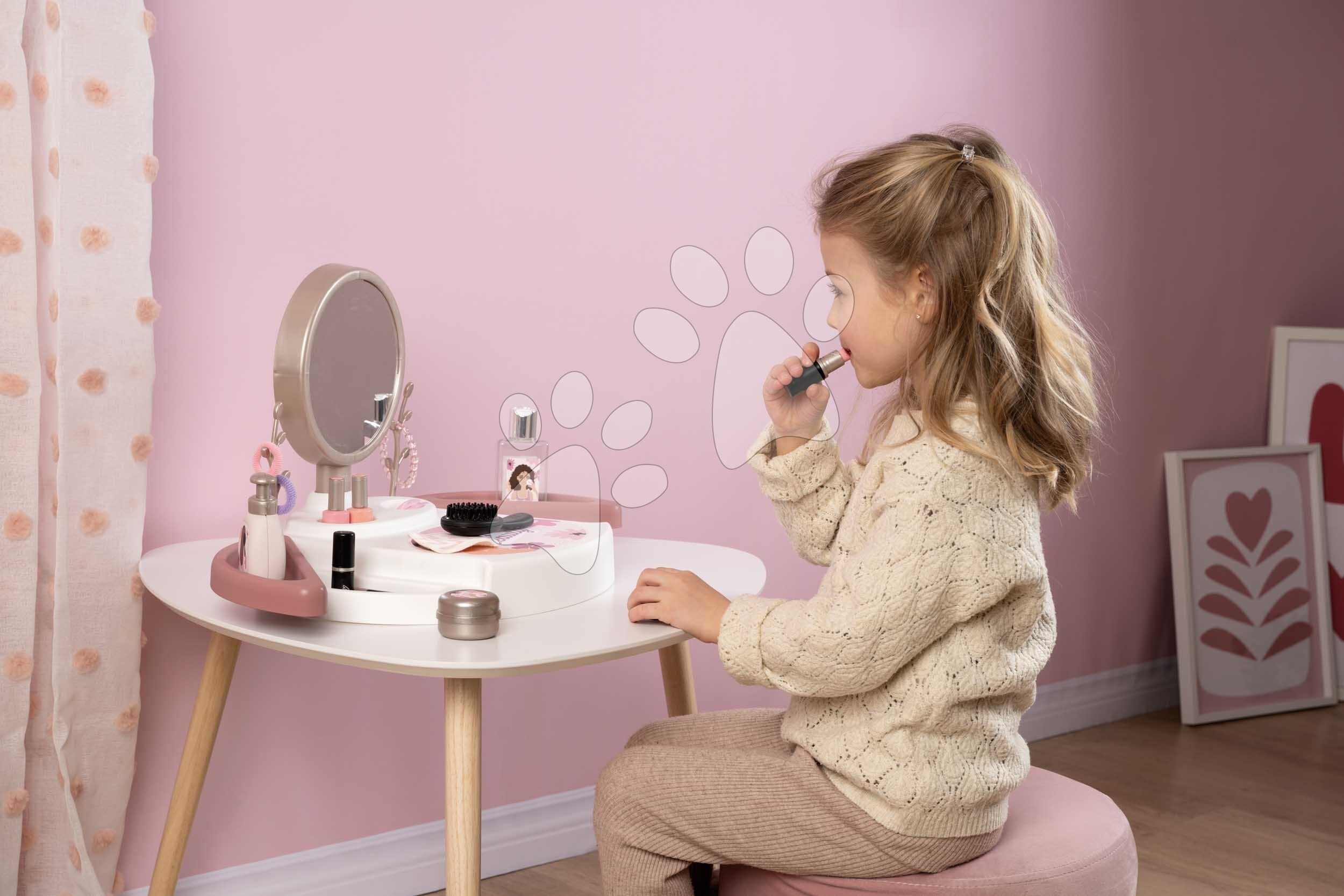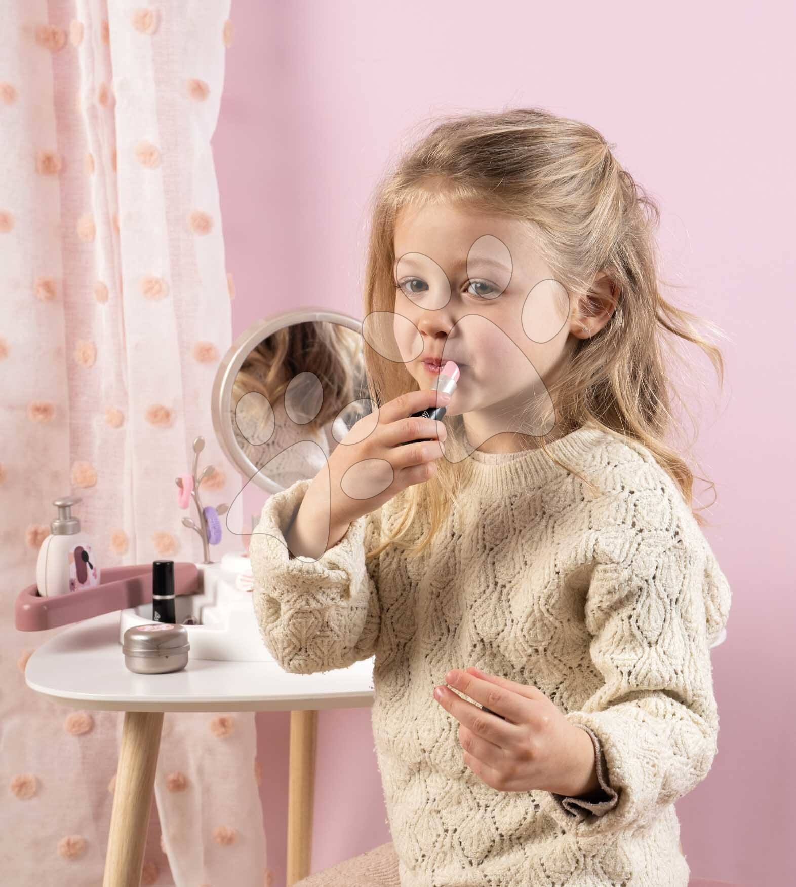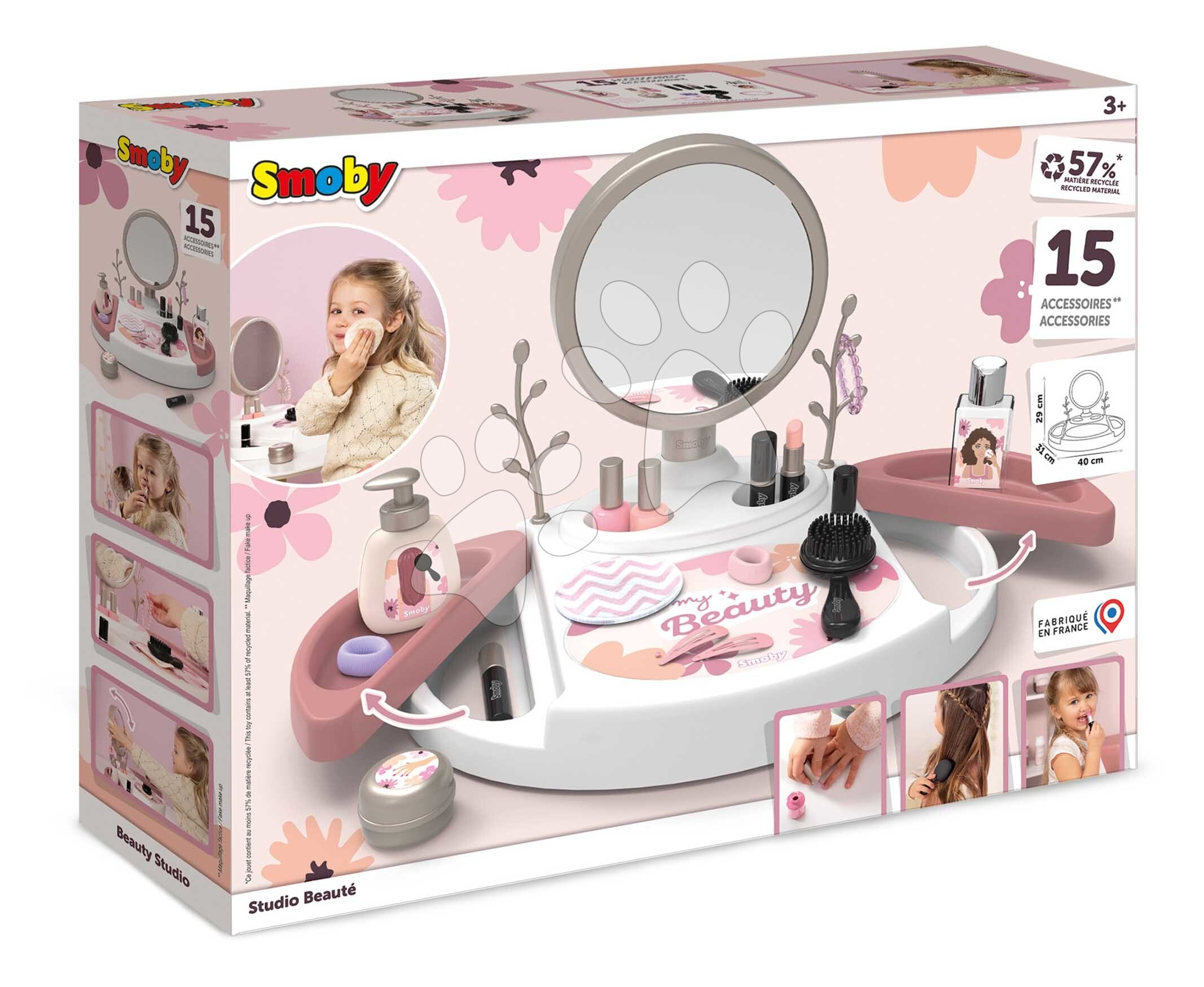 Kosmetický stolek My Beauty Studio od francouzského výrobce Smoby představuje perfektní volbu pro všechny dívky od 3 let. Originální kosmetický stolek v růžovo-bílé barevné kombinaci se zrcadlem si dívky položí na stolek nebo i na postel v dětském pokoji a zahrají si na povolání kosmetiček. Kompaktní kosmetický stolek je vybaven kulatým zrcadlem, které lze vyjmout a používat i samostatně. V 15dílné sadě doplňků se nacházejí repliky kosmetických doplňků, dívky se mohou těšit na rtěnku, laky na nehty, řasenku, parfém, krém na ruce, gumičky a sponky do vlasů, náramek a kartáč na vlasy.