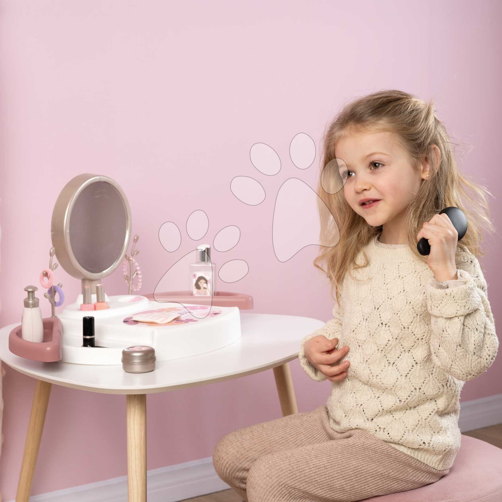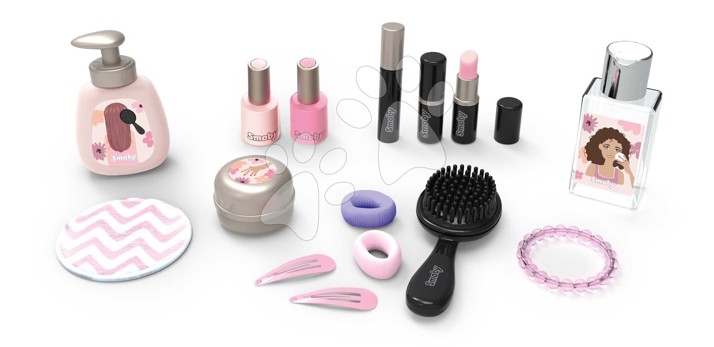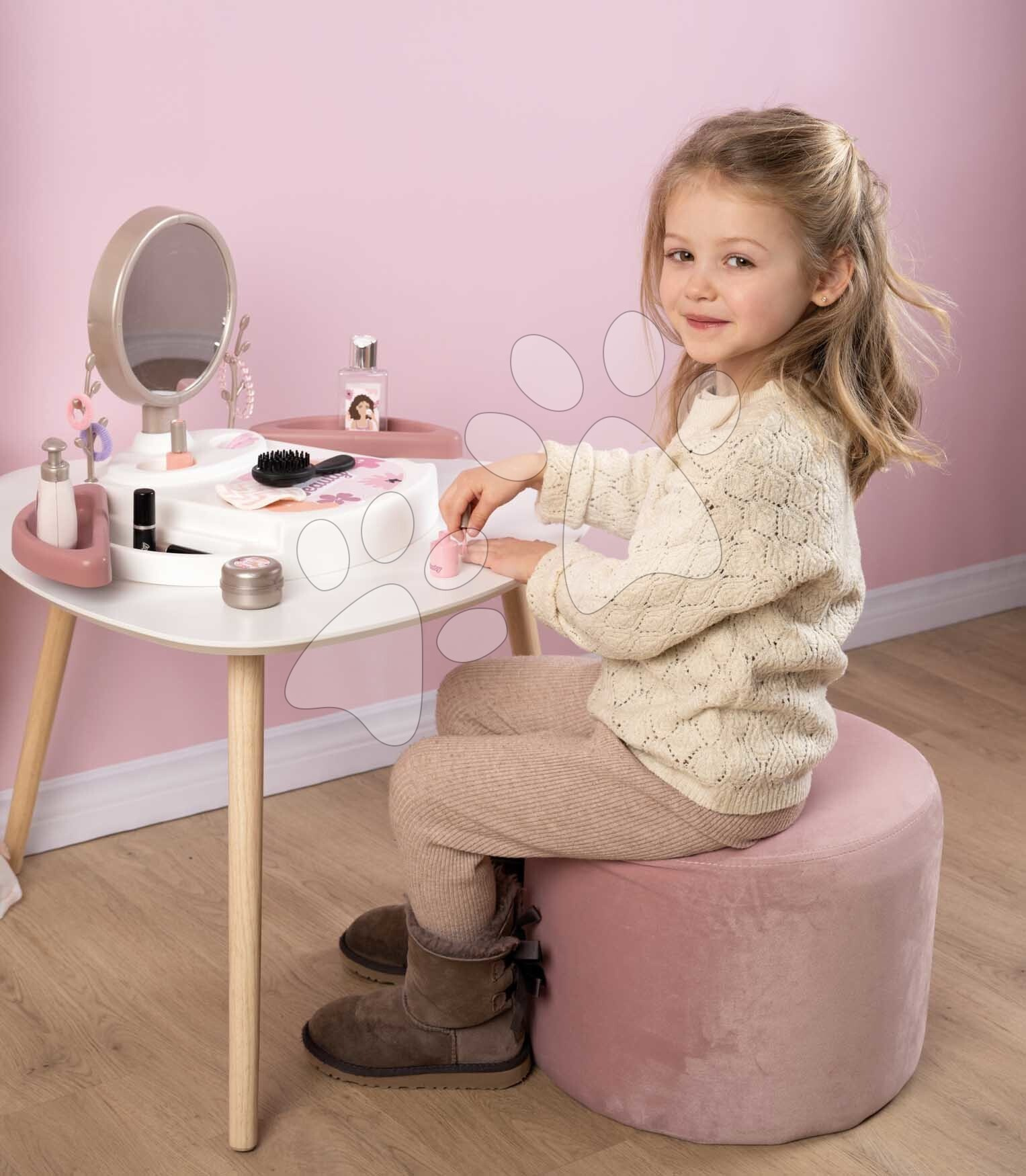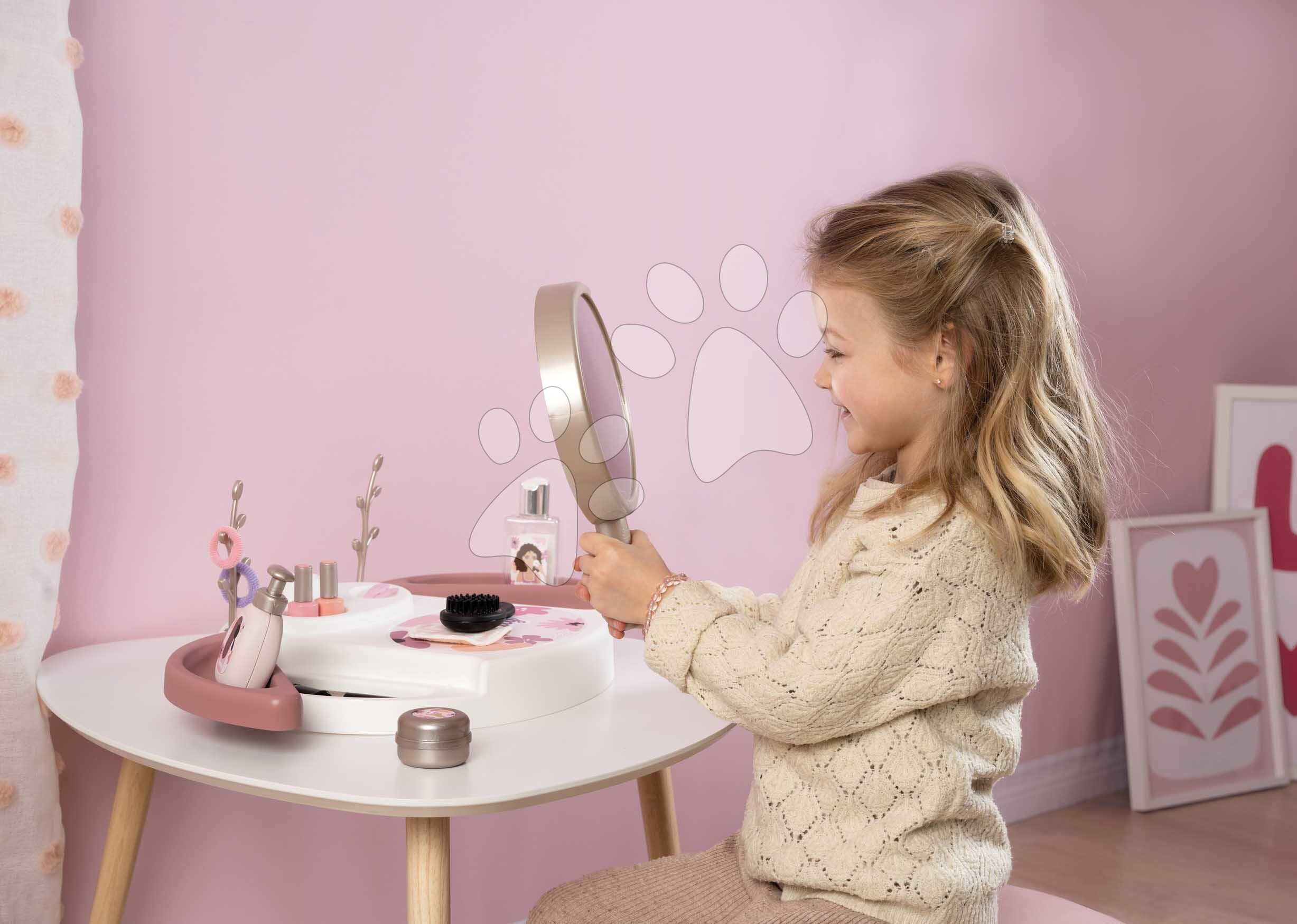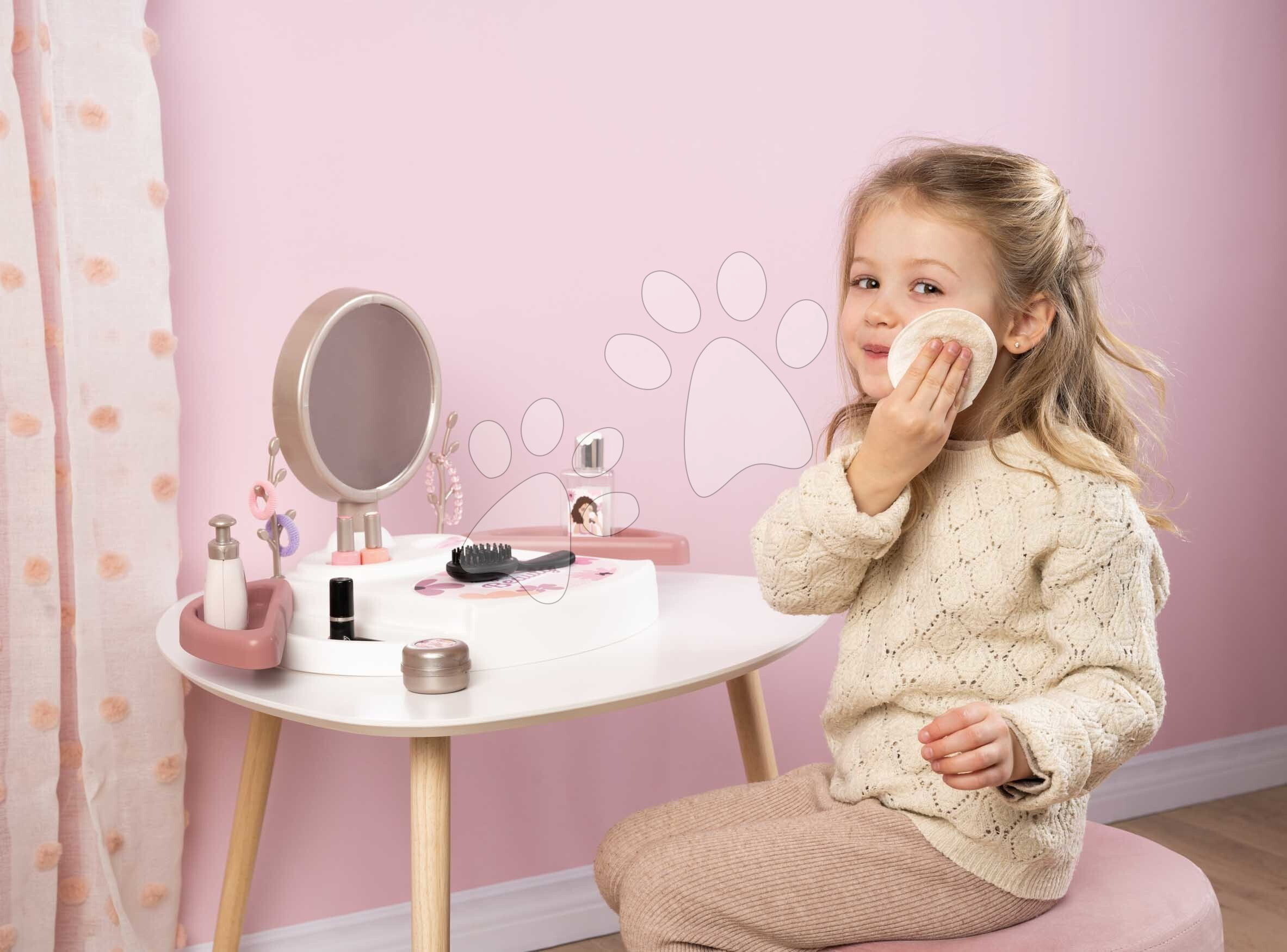 Kosmetický stolek My Beauty Studio od francouzského výrobce Smoby představuje perfektní volbu pro všechny dívky od 3 let. Originální kosmetický stolek v růžovo-bílé barevné kombinaci se zrcadlem si dívky položí na stolek nebo i na postel v dětském pokoji a zahrají si na povolání kosmetiček. Kompaktní kosmetický stolek je vybaven kulatým zrcadlem, které lze vyjmout a používat i samostatně. V 15dílné sadě doplňků se nacházejí repliky kosmetických doplňků, dívky se mohou těšit na rtěnku, laky na nehty, řasenku, parfém, krém na ruce, gumičky a sponky do vlasů, náramek a kartáč na vlasy.