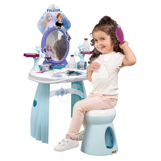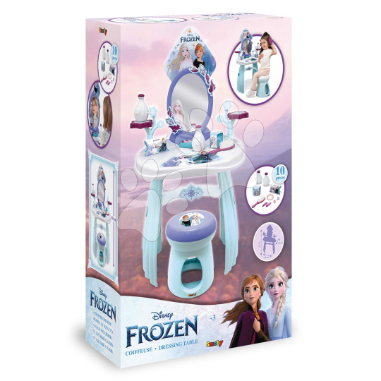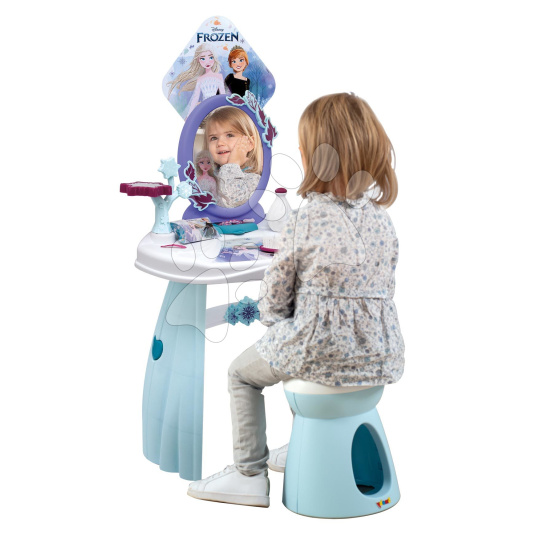 Kosmetický stolek se židlí Frozen od francouzského Smoby představuje skvělý dárek pro všechny děti a zejména holčičky od 3 let. Okouzlující stolek v modro-bílé barevné kombinaci se zrcadlem a židlí okouzlí vaše nejmenší motivem animované pohádky Ledové království. Jeho povrch je ozdoben obrázky princezen Anny a Elsy, které jsou známé dětem po celém světě. Součástí kosmetického stolku je také sada 10 doplňků, mezi nimiž jsou 2 lahvičky parfému, 2 krabičky, 2 gumičky a 2 sponky do vlasů, náramek a kartáč na vlasy.