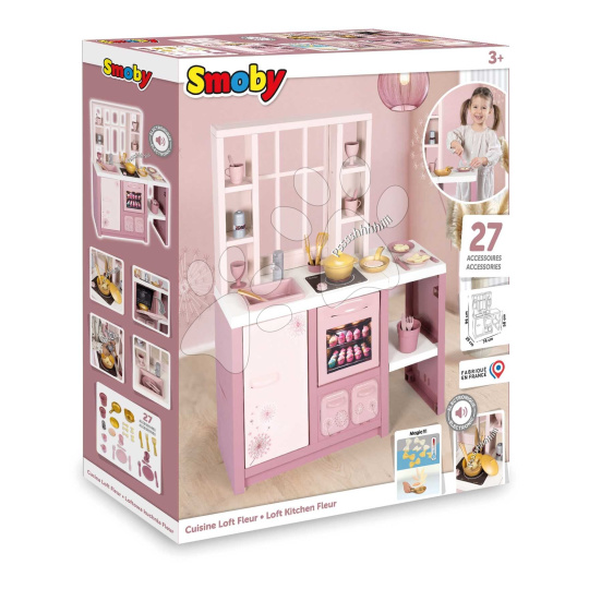 Elektronická kuchyňka Loft Fleur Pink 360° od francouzského výrobce Smoby připraví všem dětem a zejména holčičkám od 3 let skvělé zážitky při hře na šéfkuchařky. Kuchyňka s motivem pampelišek a elegantním zlatým a růžovým nádobím je plně přizpůsobena potřebám malých kuchařek. Děti se při vaření zabaví na dlouhé hodiny, získají realistické zážitky při přípravě magických těstovin, které v závislosti na okolním prostředí dokážou měnit barvu a naučí se připravovat palačinku na pánvi s funkcí otáčení jako skuteční šéfkuchaři. Součástí kuchyňky je až 27 doplňků, mezi kterými jsou nožíky, vidličky, lžičky, talířky, solnička, kuchyňské náčiní, magické těstoviny, palačinka, hrnec s poklicí, pánev a kelímky na odkládání příboru.