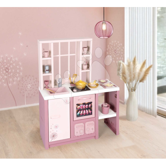Smoby Kuchyňka elektronická s magickými těstovinami Loft Fleur Pink 360° růžová se zvukem oboustranná s 27 doplňky 50 cm pracovní deska