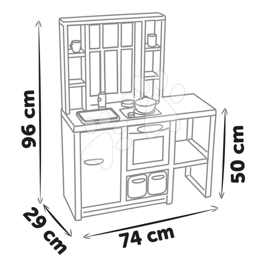 Oboustranná kuchyňka nabídne dětem přístup z více stran, díky čemuž ji dokáže využívat i více najednou. Ve spodní části kuchyňky se nachází chladnička, otevíratelná trouba na pečení, přihrádky na třídění odpadu a police na odkládání kuchyňských potřeb. Malé hospodyňky potěší i dřez s kohoutkem a varná deska s elektronickým modulem je zaujme realistickým zvukem při vaření. Nadčasová kuchyňka je vybavena množstvím úložného prostoru a designovými poličkami, na které mohou pokládat kuchyňské náčiní a doplňky.