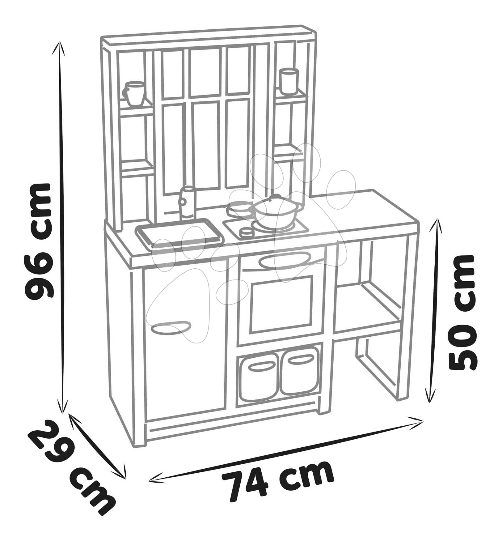 Oboustranná kuchyňka nabídne dětem přístup z více stran, díky čemuž ji dokáže využívat i více najednou. Ve spodní části kuchyňky se nachází chladnička, otevíratelná trouba na pečení, přihrádky na třídění odpadu a police na odkládání kuchyňských potřeb. Malé hospodyňky potěší i dřez s kohoutkem a varná deska s elektronickým modulem je zaujme realistickým zvukem při vaření. Nadčasová kuchyňka je vybavena množstvím úložného prostoru a designovými poličkami, na které mohou pokládat kuchyňské náčiní a doplňky.