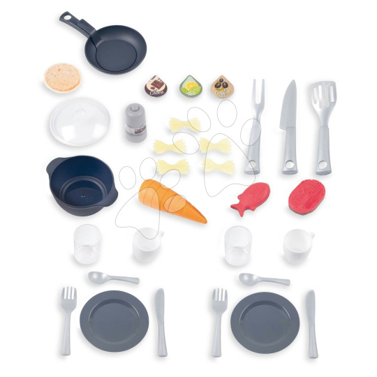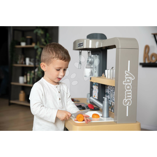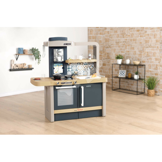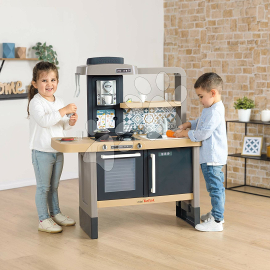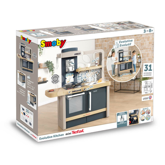 Elektronická kuchyňka Tefal Evolutive New Kitchen od francouzského výrobce Smoby zaujme každé dítě a dokáže růst spolu s ním od 3 do 8 let. Dětská kuchyňka je vyhotovena v originálním francouzském stylu a je plně přizpůsobena potřebám malých šéfkuchařů. Děti se při vaření zabaví na dlouhé hodiny, velkou radost jim udělají otočné knoflíky s mechanickým zvukem cric-crick, magické těstoviny, které dokážou měnit barvu, mrkvička na krájení a pánev s funkcí otáčení palačinky. Originální sada 31 doplňků obsahuje také kuchyňské náčiní, vidličky, nožíky, lžičky, talířky, kelímky, šálky, těstoviny, solničku, náplně do kávovaru, dokonce i předpečenou rybu a steak.