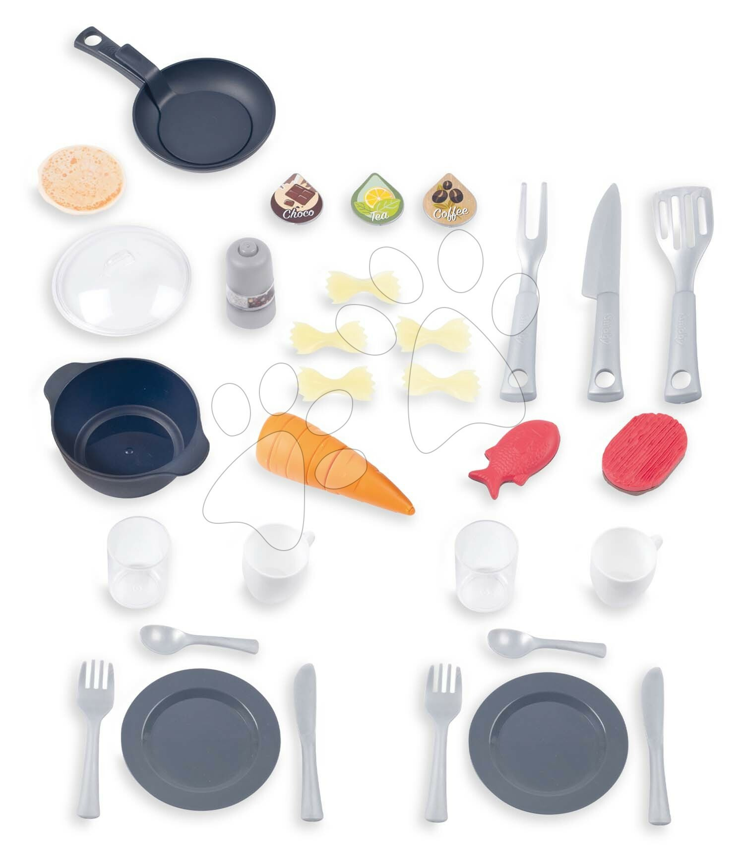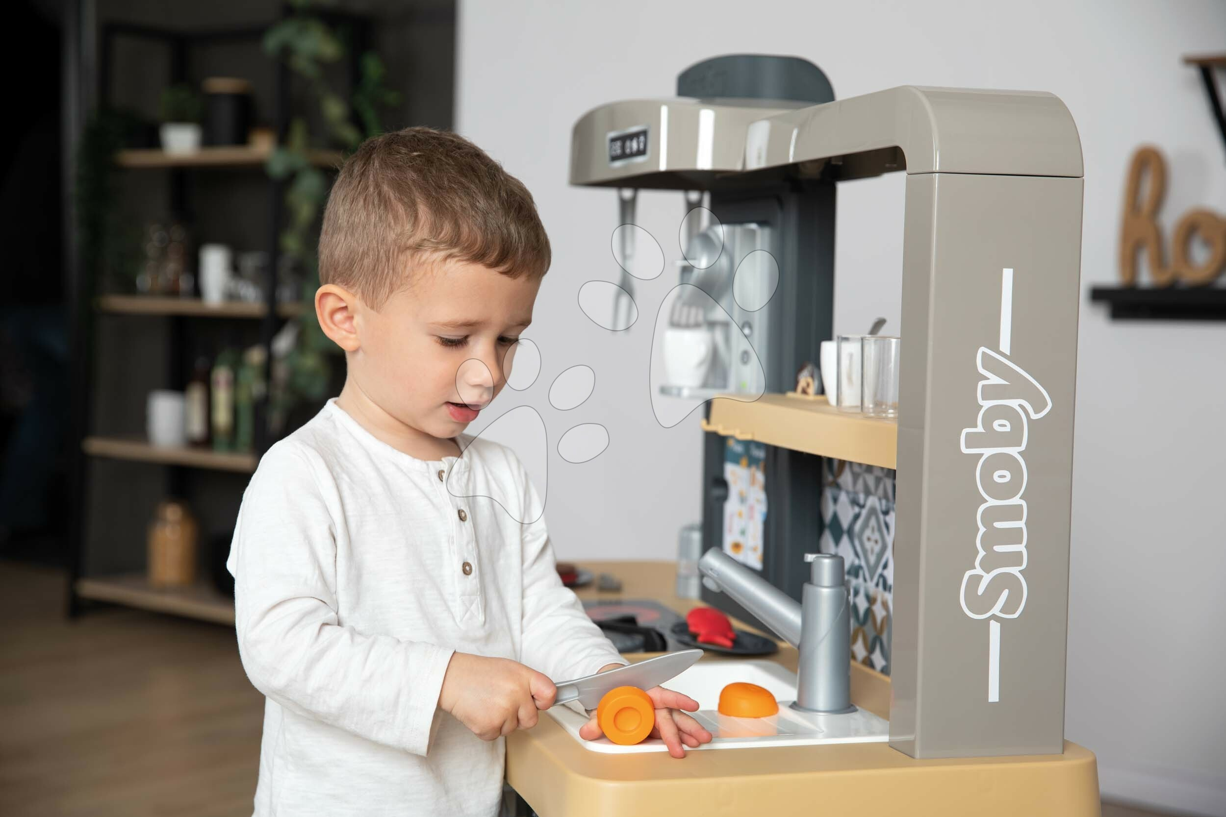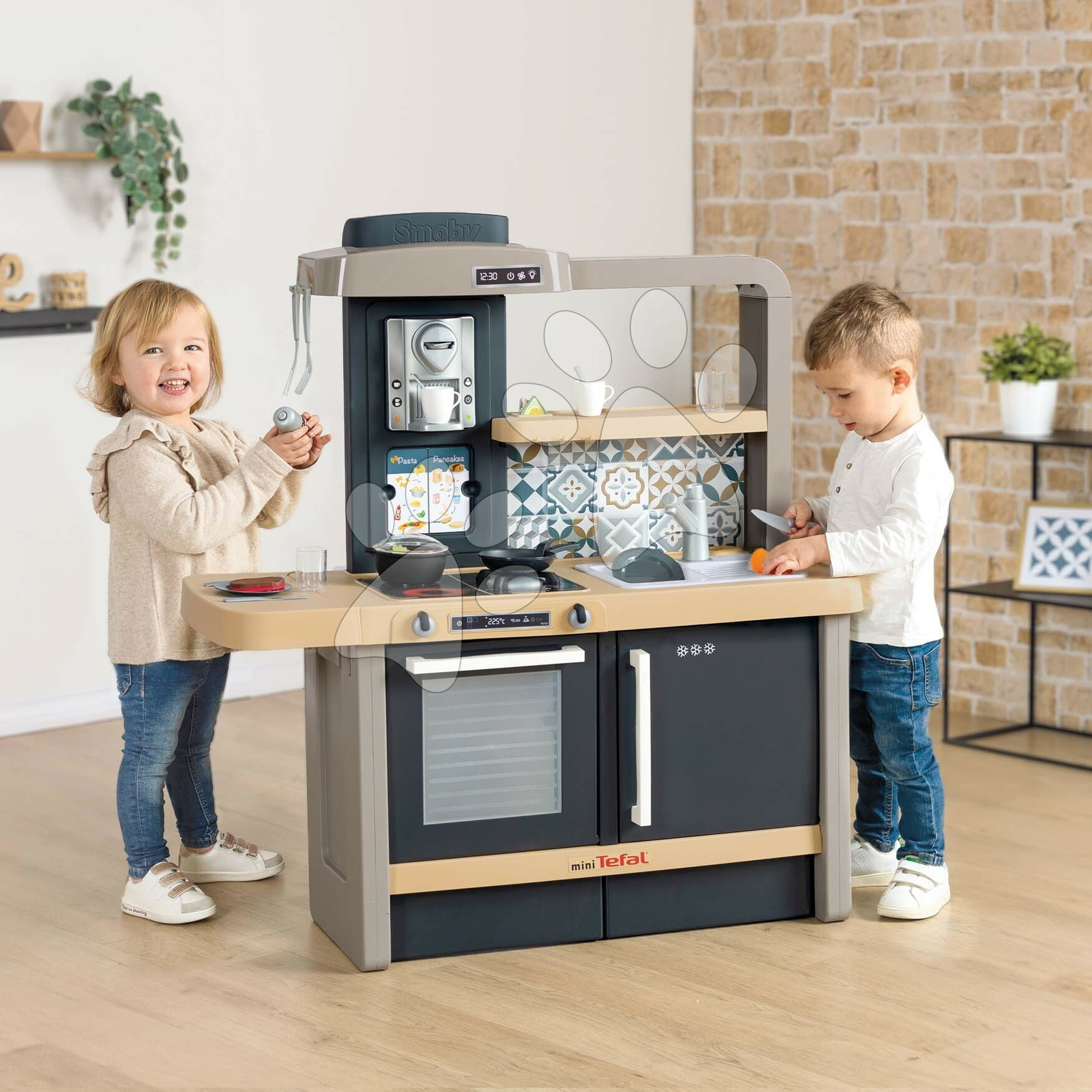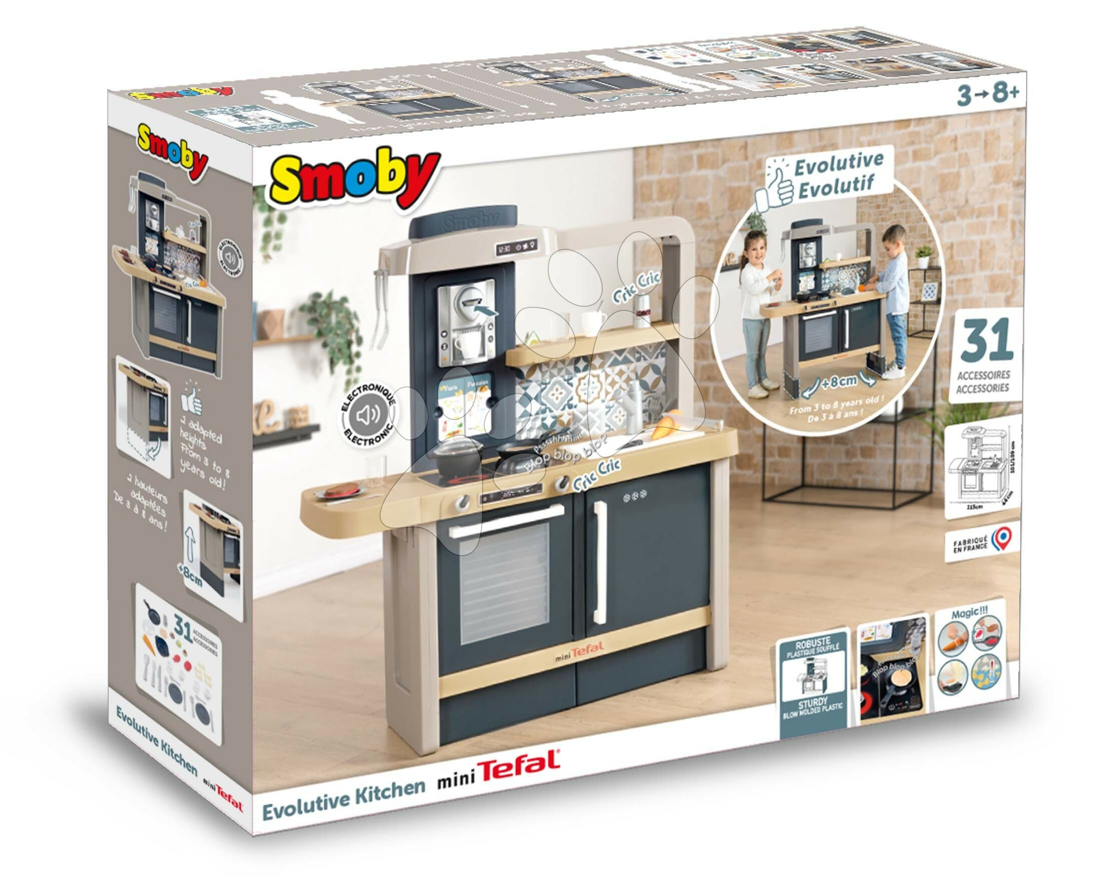 Elektronická kuchyňka Tefal Evolutive New Kitchen od francouzského výrobce Smoby zaujme každé dítě a dokáže růst spolu s ním od 3 do 8 let. Dětská kuchyňka je vyhotovena v originálním francouzském stylu a je plně přizpůsobena potřebám malých šéfkuchařů. Děti se při vaření zabaví na dlouhé hodiny, velkou radost jim udělají otočné knoflíky s mechanickým zvukem cric-crick, magické těstoviny, které dokážou měnit barvu, mrkvička na krájení a pánev s funkcí otáčení palačinky. Originální sada 31 doplňků obsahuje také kuchyňské náčiní, vidličky, nožíky, lžičky, talířky, kelímky, šálky, těstoviny, solničku, náplně do kávovaru, dokonce i předpečenou rybu a steak.