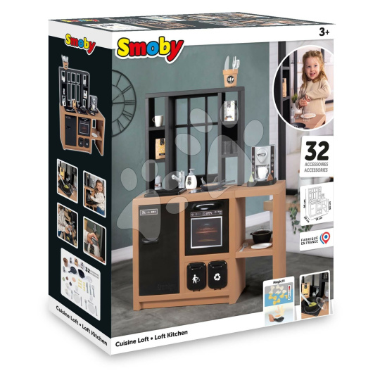 Moderní kuchyňka Loft Industrial Kitchen od francouzského výrobce Smoby představuje originální dárek pro chlapce a dívky od 3 let. Designová kuchyňka v industriálním stylu je plně přizpůsobena potřebám malých šéfkuchařů. Děti se při vaření zabaví na dlouhé hodiny, získají realistické zážitky při přípravě magických těstovin, které v závislosti na okolním prostředí dokážou měnit barvu, připraví si chutný nápoj v kávovaru a naučí se pracovat s pánví s funkcí otáčení palačinky. Skvělá sada 32 doplňků obsahuje také kuchyňské náčiní, vidličky, nožíky, lžičky, talířky, skleničky, šálky, solničku s mechanickým zvukem, náplně do kávovaru, tekutý dávkovač, krabici s těstovinami, mlékem, palačinku a hrnec s pokličkou.