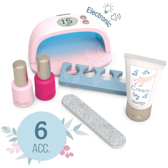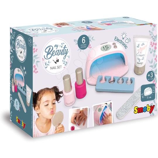 Manikúra s elektronickou UV lampou My Beauty Nail Set od francouzského Smoby představuje vynikající dárek pro všechny děti a zejména holčičky od 3 let, které si rády hrají na manikérky. V krásné 6dílné sadě se nachází elektronická UV lampa, která dokáže svítit a vydávat zvuk, pilník na nehty, krém, 2 gelové laky a separátor na prsty. Kosmetické doplňky jsou jen repliky, působí realistickým dojmem a jsou bezpečné pro hru dětí. Jsou vyrobeny z kvalitního a jemného plastu se zaoblenými hranami.