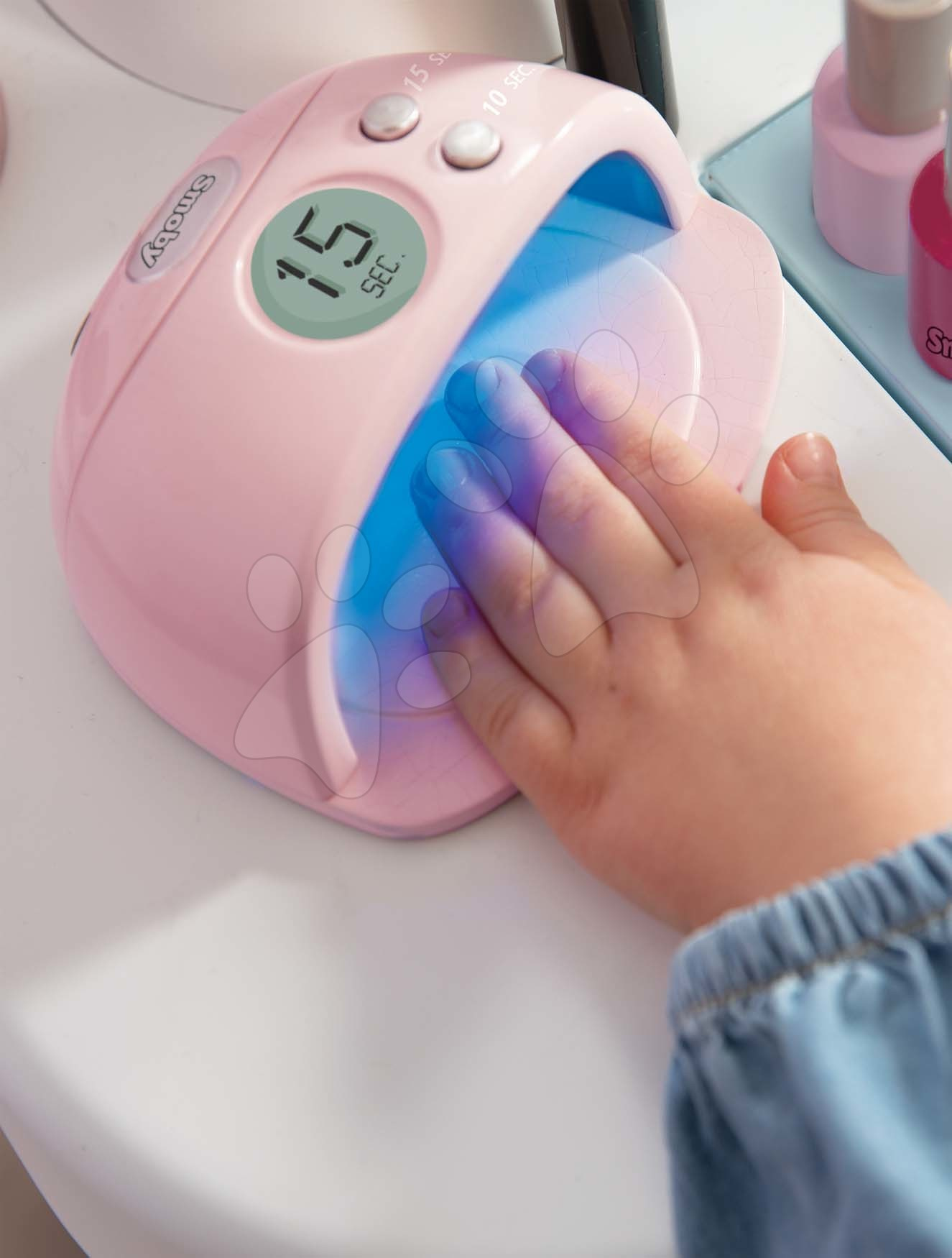 Manikúra s elektronickou UV lampou My Beauty Nail Set od francouzského Smoby představuje vynikající dárek pro všechny děti a zejména holčičky od 3 let, které si rády hrají na manikérky. V krásné 6dílné sadě se nachází elektronická UV lampa, která dokáže svítit a vydávat zvuk, pilník na nehty, krém, 2 gelové laky a separátor na prsty. Kosmetické doplňky jsou jen repliky, působí realistickým dojmem a jsou bezpečné pro hru dětí. Jsou vyrobeny z kvalitního a jemného plastu se zaoblenými hranami.