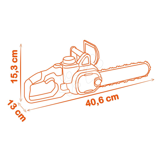 Motorová pila Je vyrobena z pevných a odolných plastových materiálů se zaoblenými hranami, je maximálně bezpečná pro hru dětí. Pila zabaví chlapce a dívky na celé hodiny, mohou si ji vzít na zahradu a zahrát si s ní na čerstvém vzduchu. Při hře s motorovou pilou si rozvíjí jemnou motoriku, technickou představivost a logické myšlení. Rozměry dětské pily jsou 41*16*13 cm, její rukojeť je dokonale přizpůsobena pro malé dětské ruce. Funguje na 3 baterie typu LR6, které jsou součástí balení.
