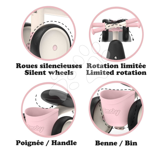 Odrážedlo je určeno pro všechny malé sportovce, přičemž jim pomáhá správně udržovat rovnováhu, zdokonalovat reflexy, prostorové vidění a pravidelnou jízdou se děti naučí odhadovat vzdálenost. Jízdou na odrážedle si děti také posilují svalstvo a zlepšují stabilitu. Odrážedlo Smoby přispívá k všestrannému vývoji dítěte, které nabírá sebedůvěru, stává se samostatnějším a zároveň zažívá nová, zábavná dobrodružství. Odrážedlo má rozměry 52*30*38 cm, přičemž je sedátko je ve výšce 22 cm. Nosnost odrážedla je 25 kg a jeho váha je pouhých 2 kg.