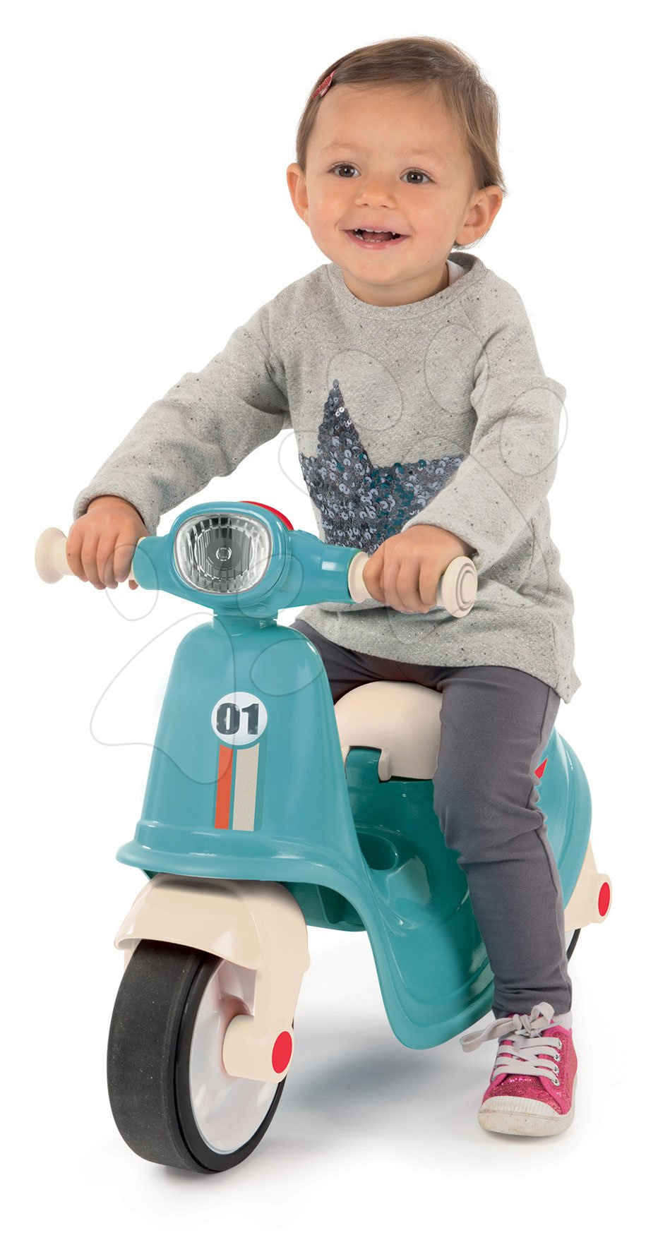 Připravte svému dítěti radost v podobě krásného odrážedla od francouzského Smoby. Odrážedlo motorka s reflektorem Scooter Blue je špičkové odrážedlo pro všechny chlapce a holčičky již od 18 měsíců. Pyšní se krásným modro-šedým barevným provedením, závodní vzhled s francouzským designem okouzlí každé dítě. Tento nádherný dětský dopravní prostředek se startuje pomocí mechanického klíče, umístěného přímo pod palubní deskou. Na řídítkách motorky se nachází realistický reflektor a pod ergonomicky tvarovaným sedadlem se skrývá úložný prostor, do kterého si vaši nejmenší uloží své oblíbené hračky. O tichý a bezproblémový chod odrážedla se postarají kvalitní gumová kolečka, přičemž je přední kolečko vybaveno blatníkem, který ochrání šaty dítěte před nadměrným znečištěním.