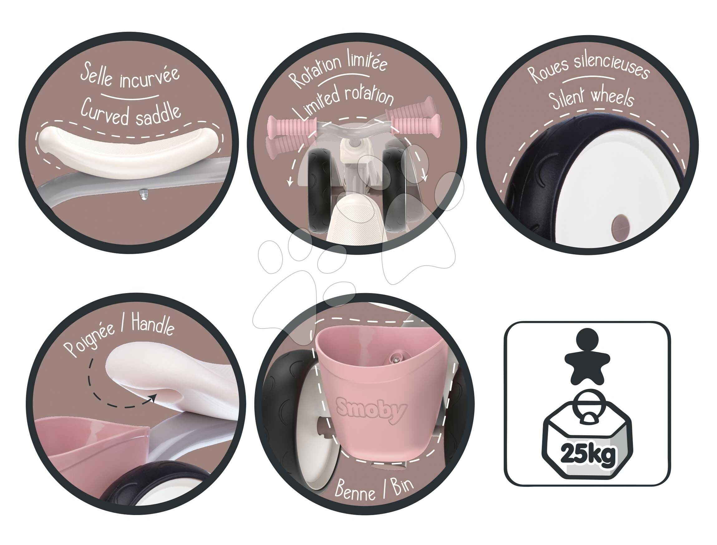 Francouzský Smoby přináší dětem prvotřídní hračky s pravým francouzským designem. Materiál na hračkách Smoby je pevný, odolný, ale zároveň jemný a hladký k dětským ručkám. Všechny dětské hračky mají oblé hrany, aby vaše děti byly během veselých her v bezpečí a chráněny před zraněními. Produkty Smoby všestranně rozvíjejí vaše děti, formují jejich osobnost, upoutají každé i nejmenší děťátko. Hračky splňují i ta nejvyšší bezpečnostní kritéria a jsou zárukou špičkové francouzské kvality a moderního vzhledu.