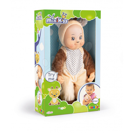 S pohádkovým srnečkem se zvukovou funkcí si děti od 12 měsíců mohou vymýšlet vlastní příběhy se zvířátky. Panenka ze série MiniKiss se tak rychle stane jejich nerozlučným společníkem, kterého si mohou vzít na výlet, návštěvu a večer s ní mohou usínat. Nádherné hnědé odstíny kostýmu v kombinaci s usměvavou tvářičkou s bílými puntíky bude rozveselovat dětičky po dlouhá léta. Děti budou mít velkou radost, když panenka při zmačknutí bříška vydá zvuk polibku. Je jako stvořená na objímání, tulení se a děti ji mohou mačkat, jak dlouho si budou přát.