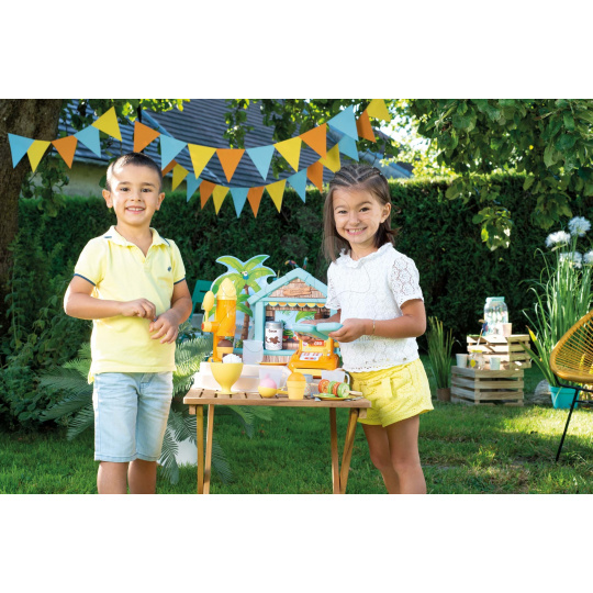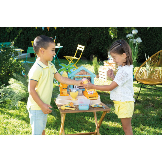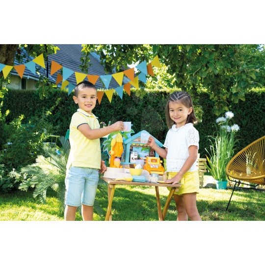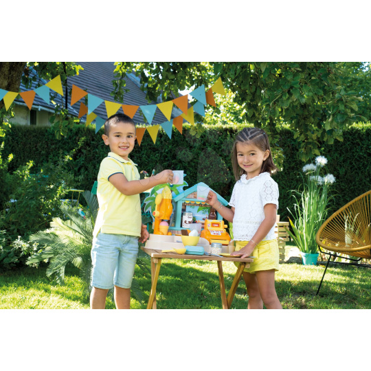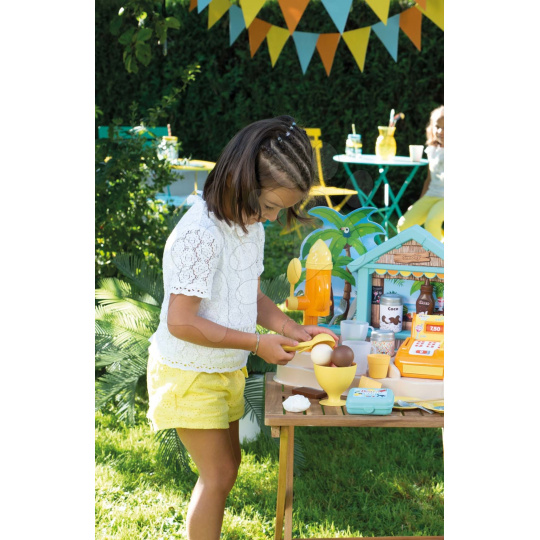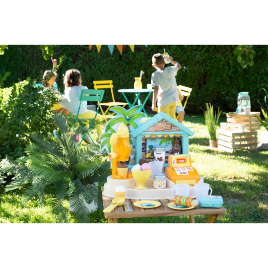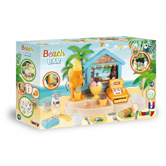 Plážový bar se zmrzlinou Beach Bar od francouzského Smoby představuje skvělou hračku pro všechny kreativní od 3 let, které si otevřou na zahradě svůj vlastní plážový bar. Při piknikových posezeních se se sourozenci a kamarády zabaví při přípravě a ochucování zmrzlinových pohárů, vyzkoušejí si povolání zmrzlinářů. Krásný plážový bar se vzhledem tropického ostrova a plážového domečku nabídne dětem mechanický dávkovač zmrzlinových kopečků spolu s kornoutky a naběračkou. K dispozici mají dostatek úložného prostoru a velkou radost jim udělá i oranžová otevíratelná pokladna, díky které se naučí zacházet s penězi a počítat.