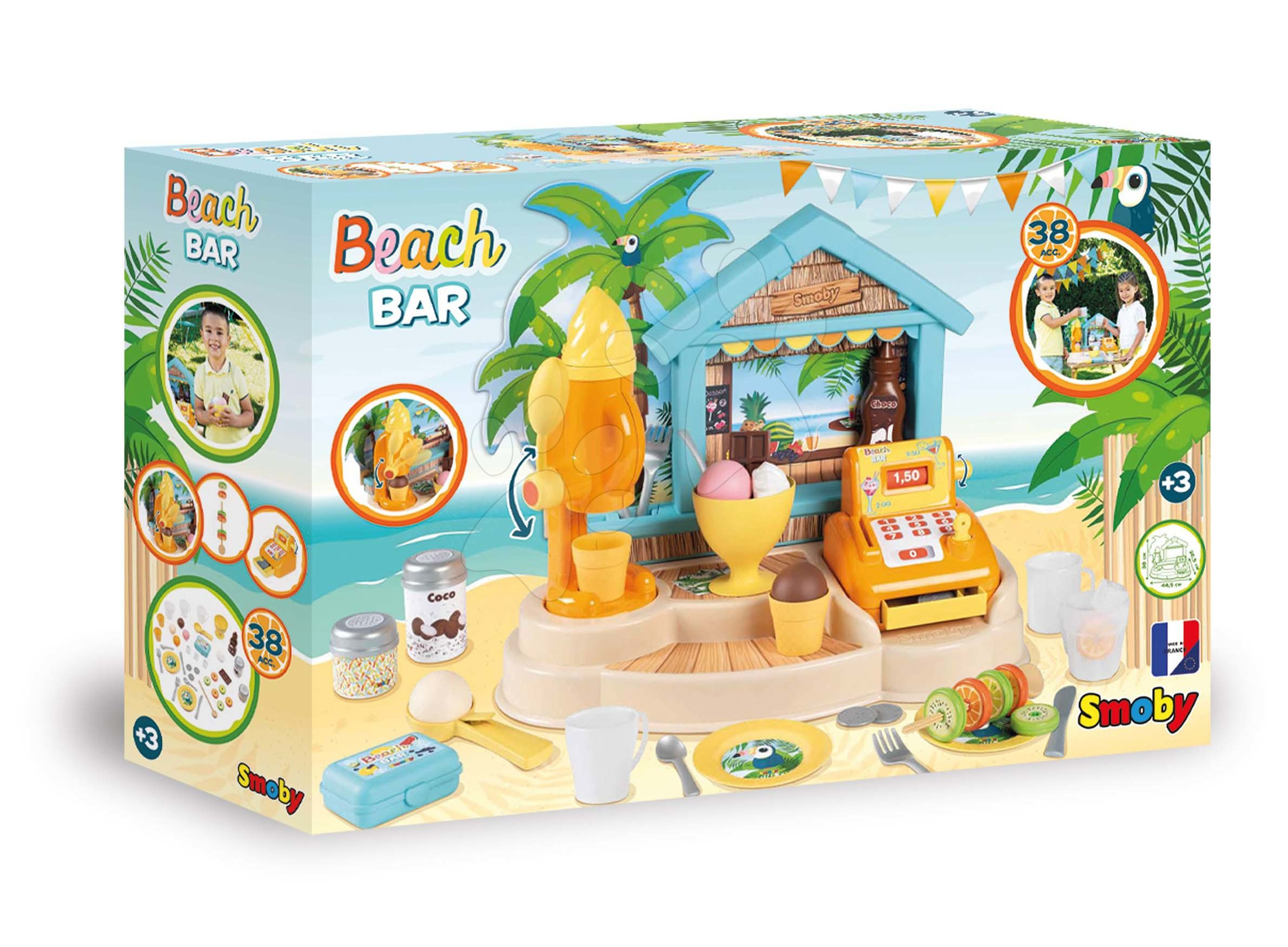 Plážový bar se zmrzlinou Beach Bar od francouzského Smoby představuje skvělou hračku pro všechny kreativní od 3 let, které si otevřou na zahradě svůj vlastní plážový bar. Při piknikových posezeních se se sourozenci a kamarády zabaví při přípravě a ochucování zmrzlinových pohárů, vyzkoušejí si povolání zmrzlinářů. Krásný plážový bar se vzhledem tropického ostrova a plážového domečku nabídne dětem mechanický dávkovač zmrzlinových kopečků spolu s kornoutky a naběračkou. K dispozici mají dostatek úložného prostoru a velkou radost jim udělá i oranžová otevíratelná pokladna, díky které se naučí zacházet s penězi a počítat.