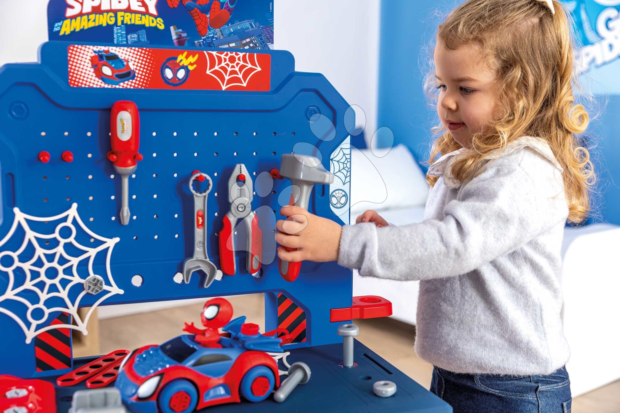Zadní panel stolku poslouží dětem k zavěšení pracovního nářadí, je vyzdoben obrázkem hrdiny Spidey. Pracovní stolek je vybaven také praktickými boxy, do kterých si děti uloží montážní dílky, otvory pro zatloukání hřebíků a pravítkem. Ve spodní části stolku je úložný prostor pro nářadí a doplňky. Pracovní dílna s motivem Spidermana ze studia Marvel připraví dětem spoustu radostných chvil se svým oblíbeným hrdinou.