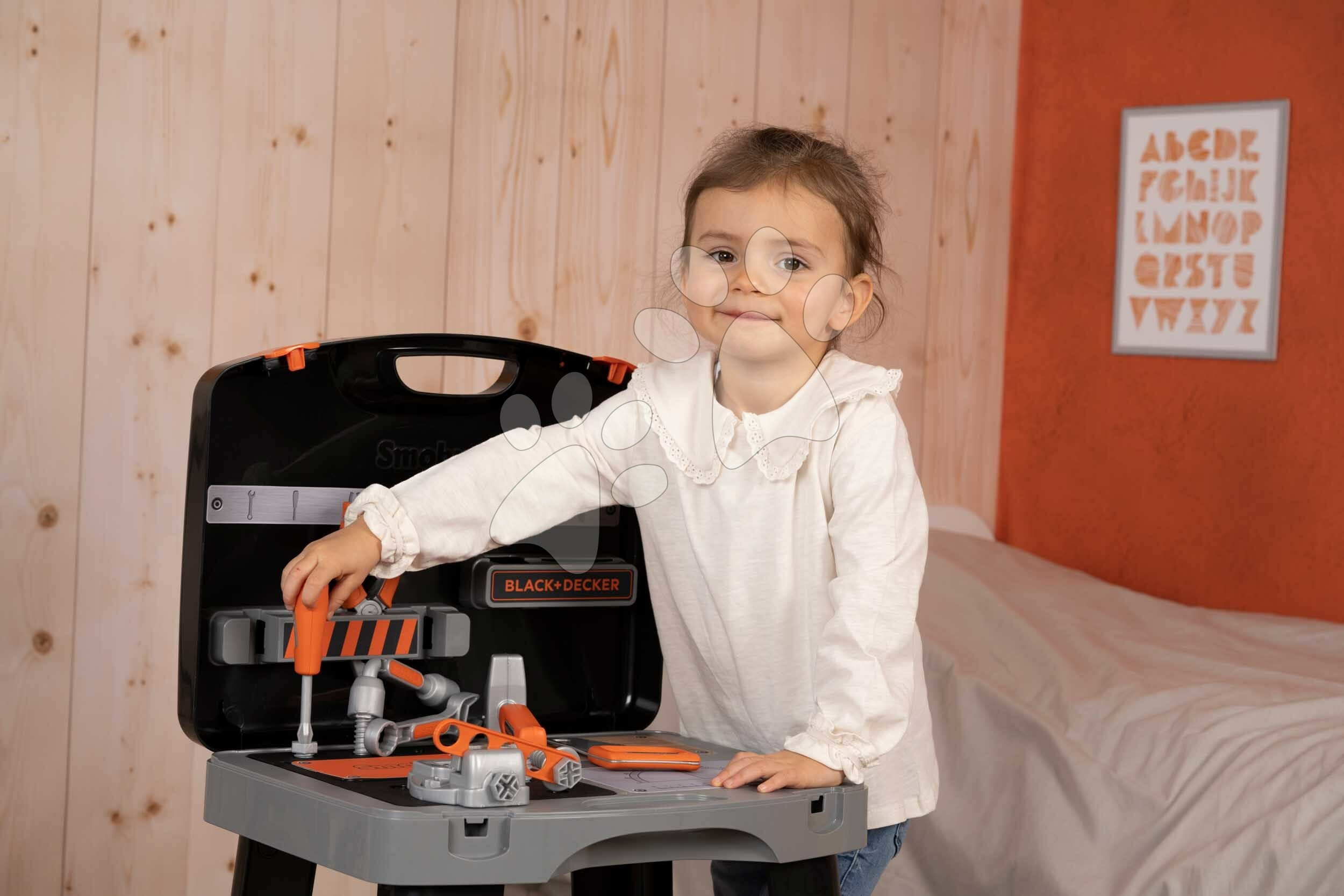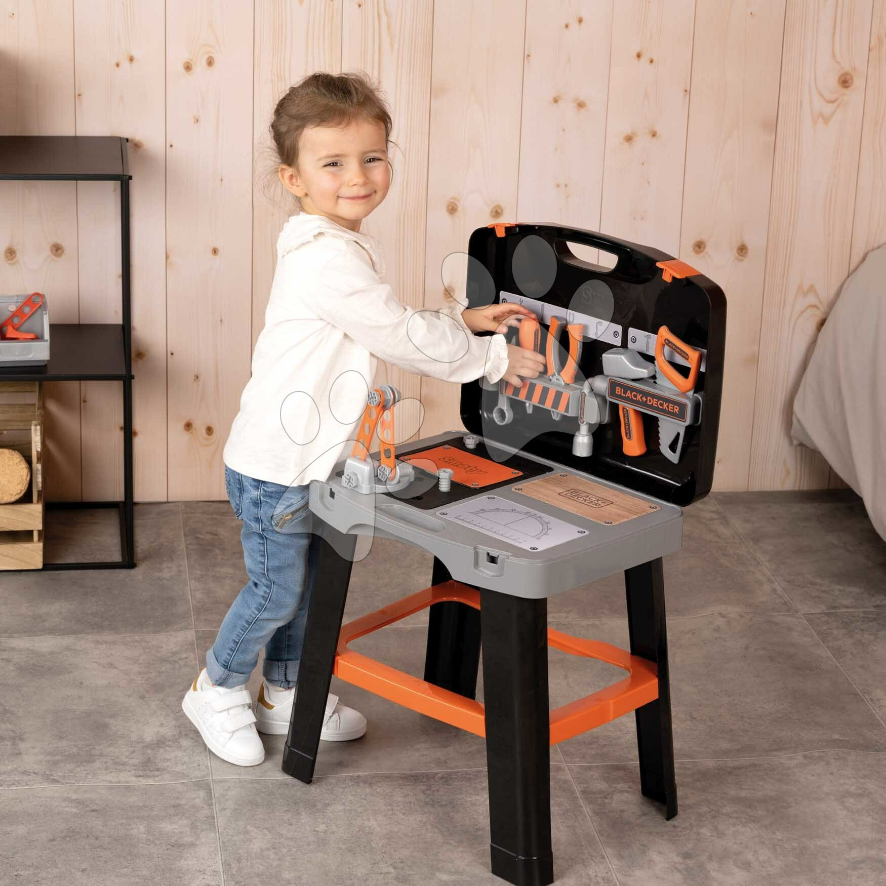 Smoby Pracovní dílna v kufříku 2v1 Bricolo Smart Workbench Black&Decker rozkládací pracovní stůl s nářadím 30 doplňků
