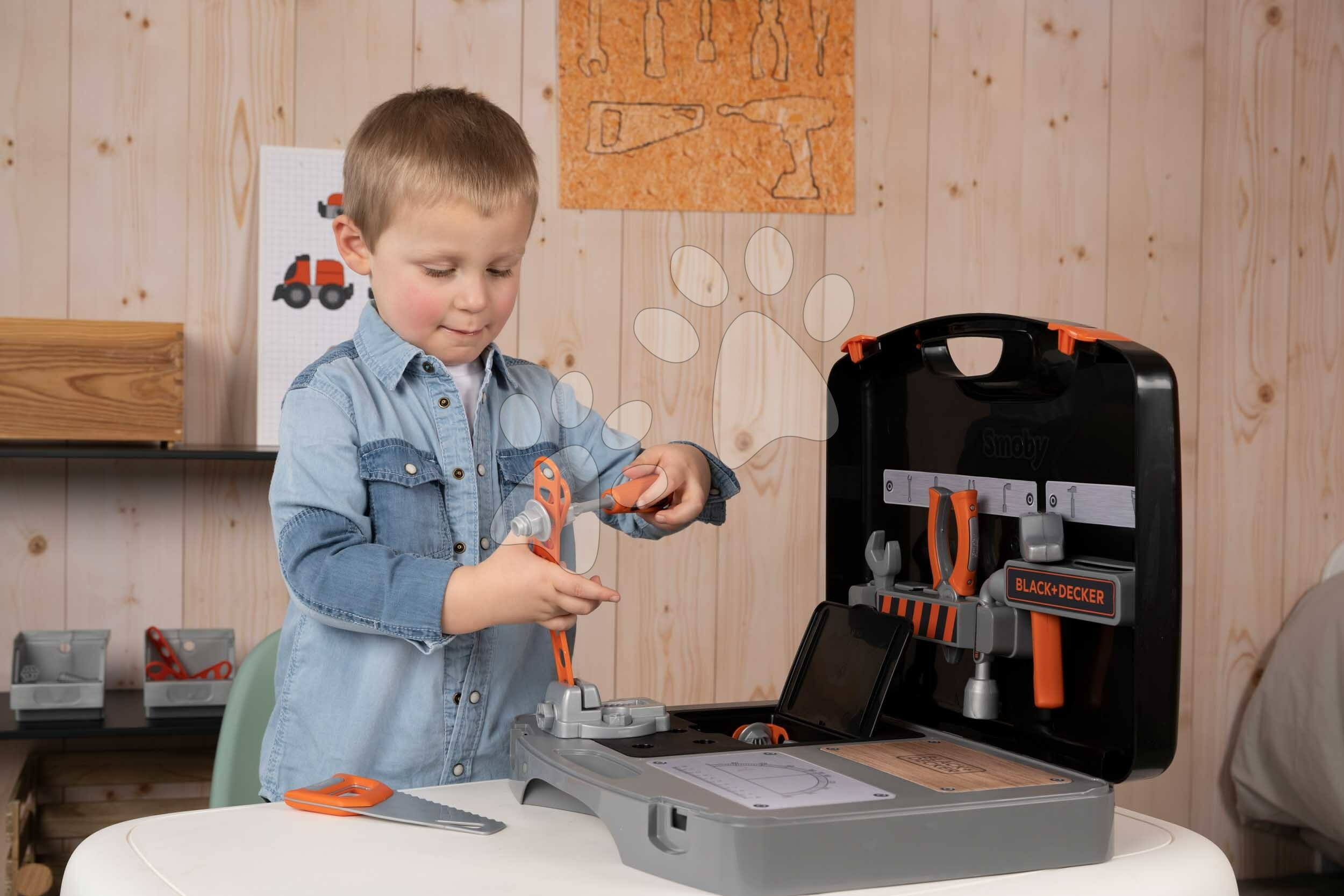 Pracovní dílna v kufříku 2v1 Bricolo Smart Workbench od francouzského výrobce Smoby představuje skvělý dárek pro všechny děti a zejména chlapce od 3 let. Zahrnuje v sobě množství pracovních doplňků, díky čemuž je zárukou hodin plných zábavy a kutilství pro malé opraváře a konstruktéry. V bohaté sadě 30 doplňků se nachází kladivo, šroubovák, kleště, šroubovák, montážní klíč, svěrák, pilka, šrouby a různé montážní dílky. Přenosnou dílnu lze rychle složit do kufříku a děti si ji mohou vzít na návštěvu ke kamarádům. Všechny doplňky lze v kufříku uložit na své místo, malí řemeslníci se naučí po každé hře uklidit pracovní nástroje.