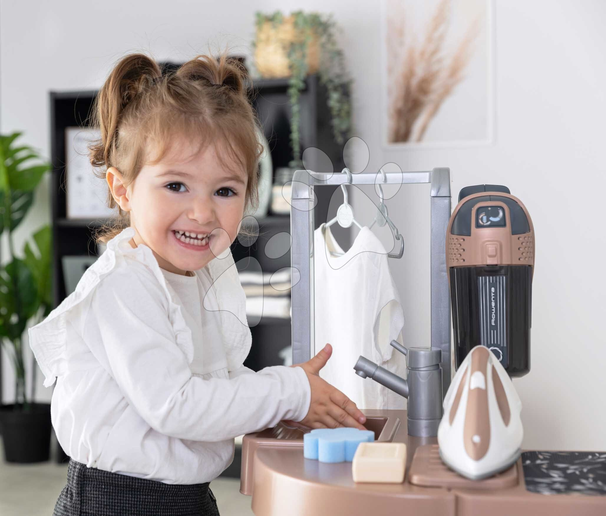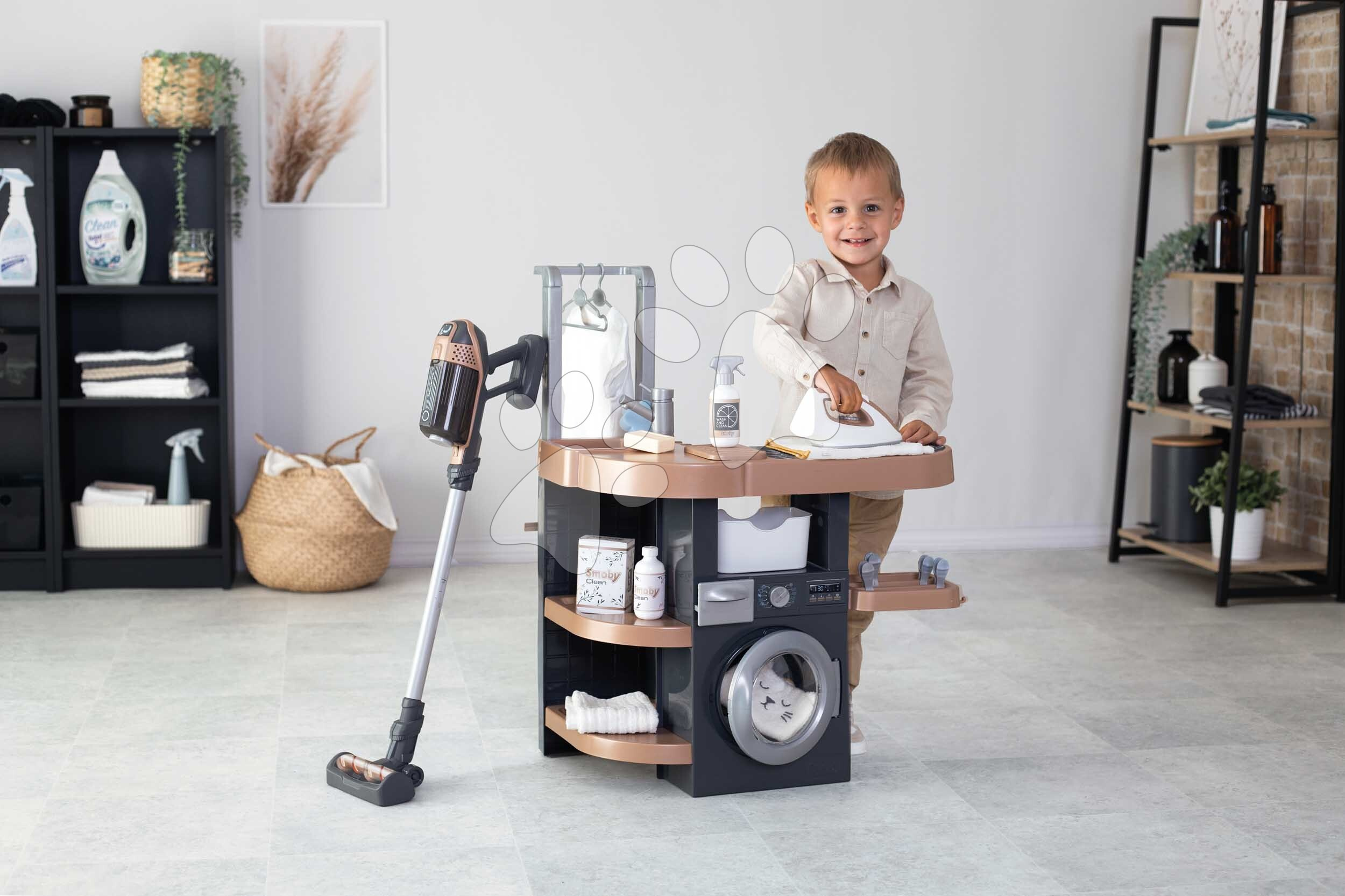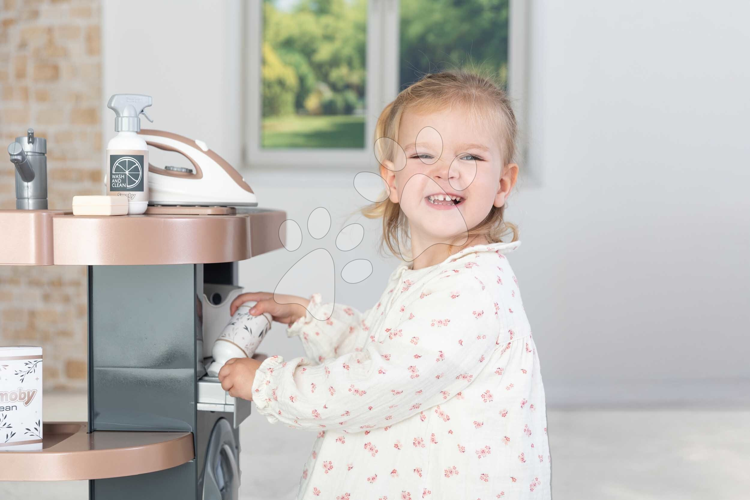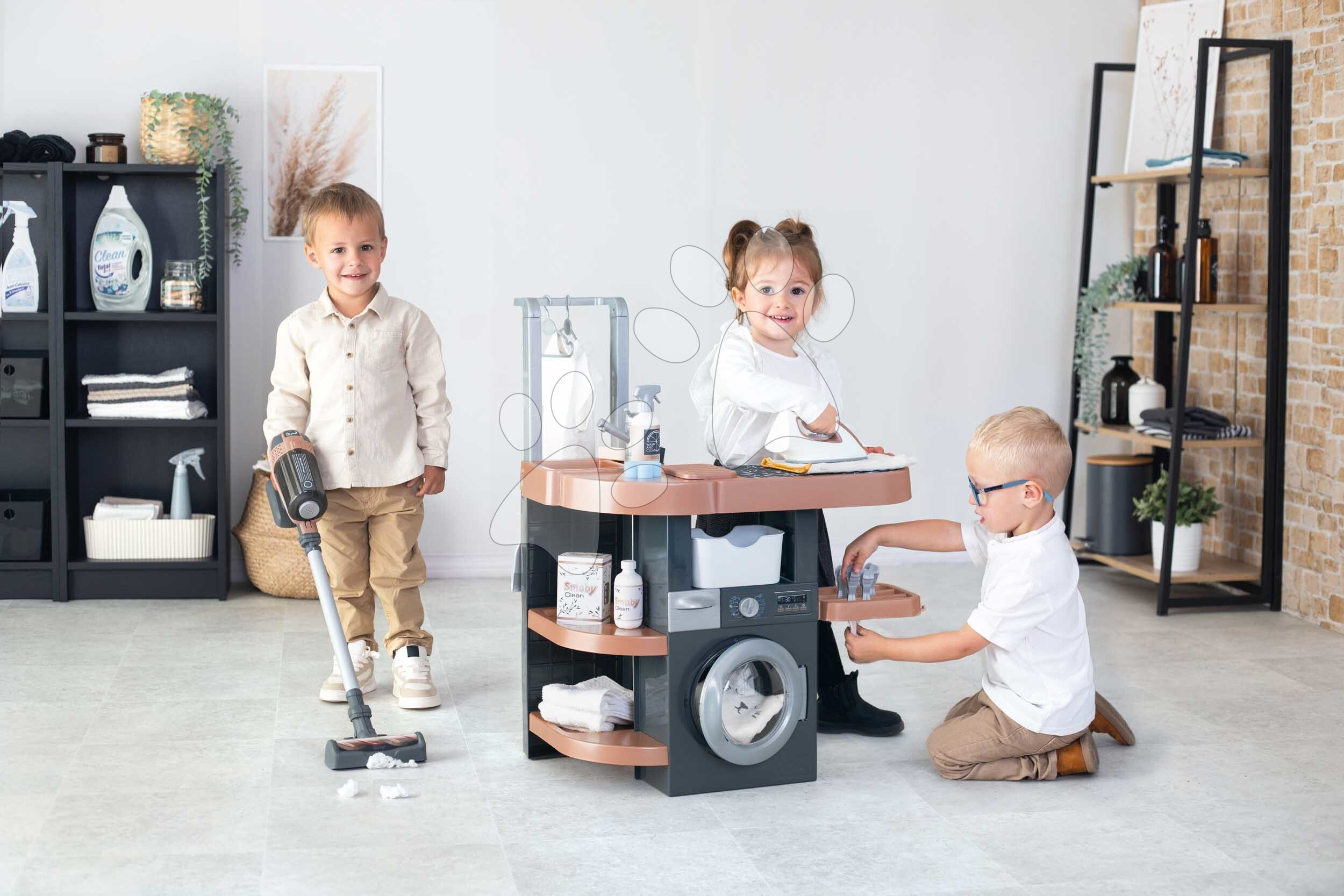 Prádelna s pračkou s předním plněním Rowenta Wash&Clean Laundry od francouzského výrobce Smoby potěší všechny děti od 3 let, kterým nabídne realistické zážitky při praní, žehlení a sušení prádla. Multifunkční prádelna ve tvaru písmene L umožní dětem přístup z více stran, zahrají si s ní sourozenci i kamarádi. Při úklidu budou mít děti k dispozici také tyčový elektronický vysavač s vyměnitelným nástavcem, který dokáže vydávat zvuky jako při skutečném vysávání.